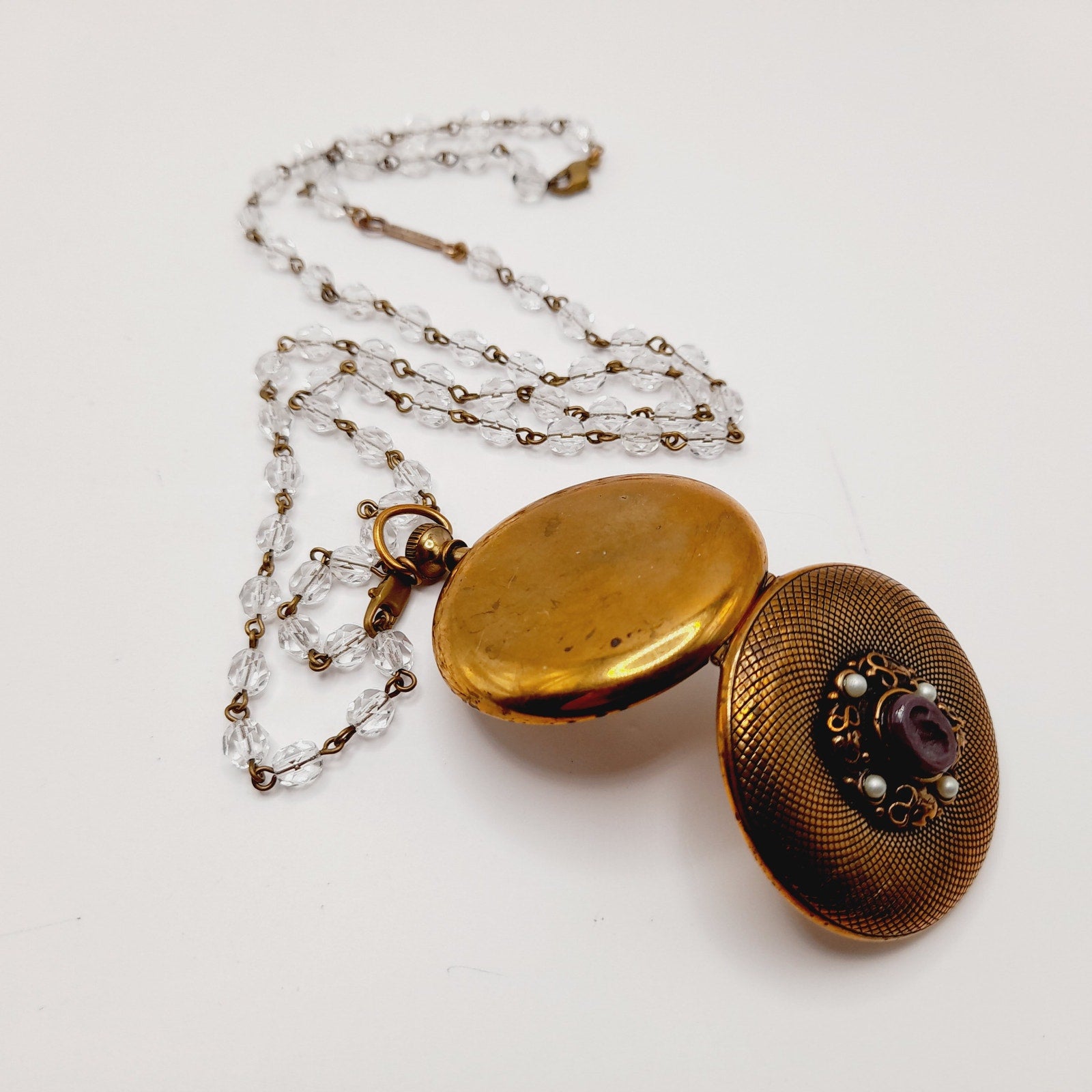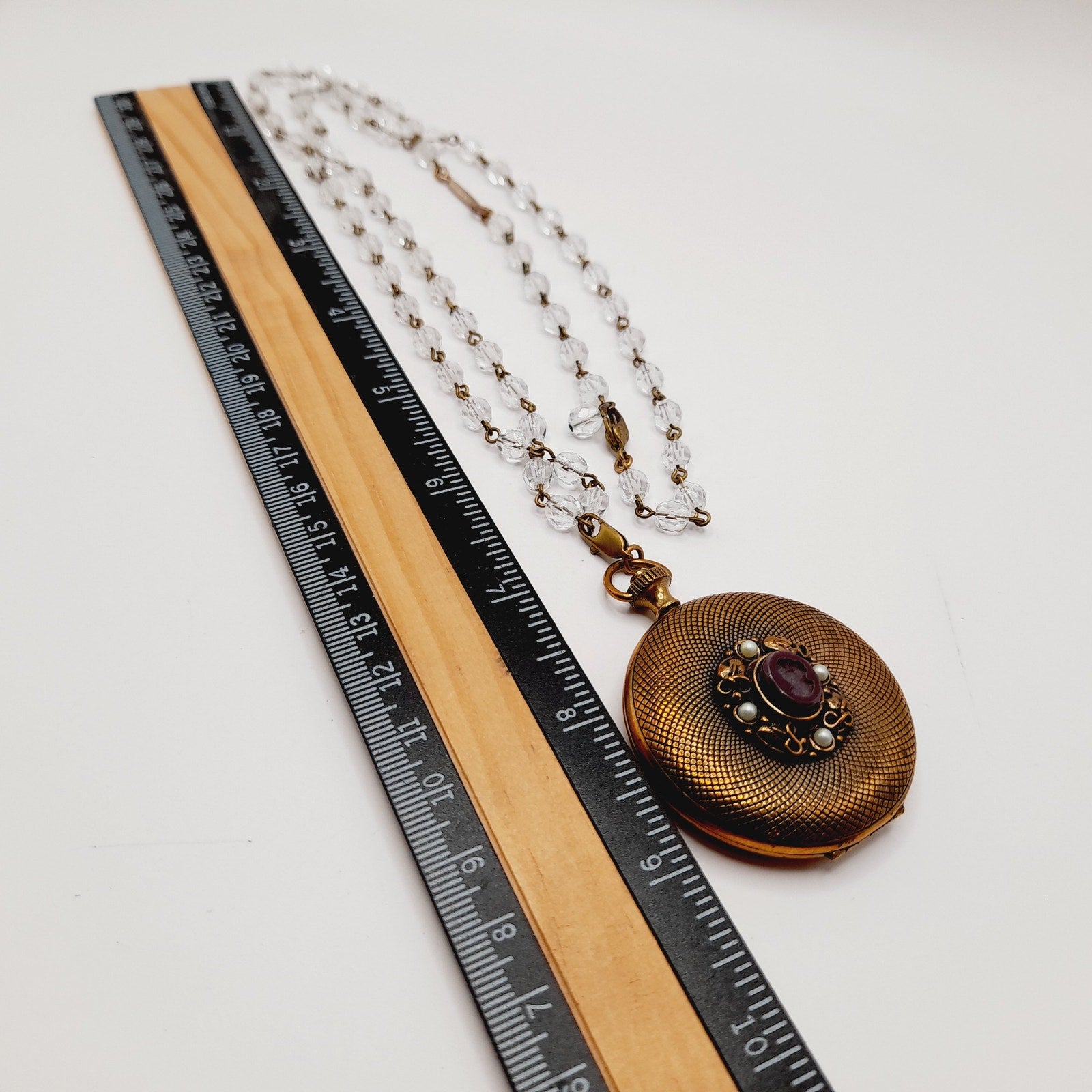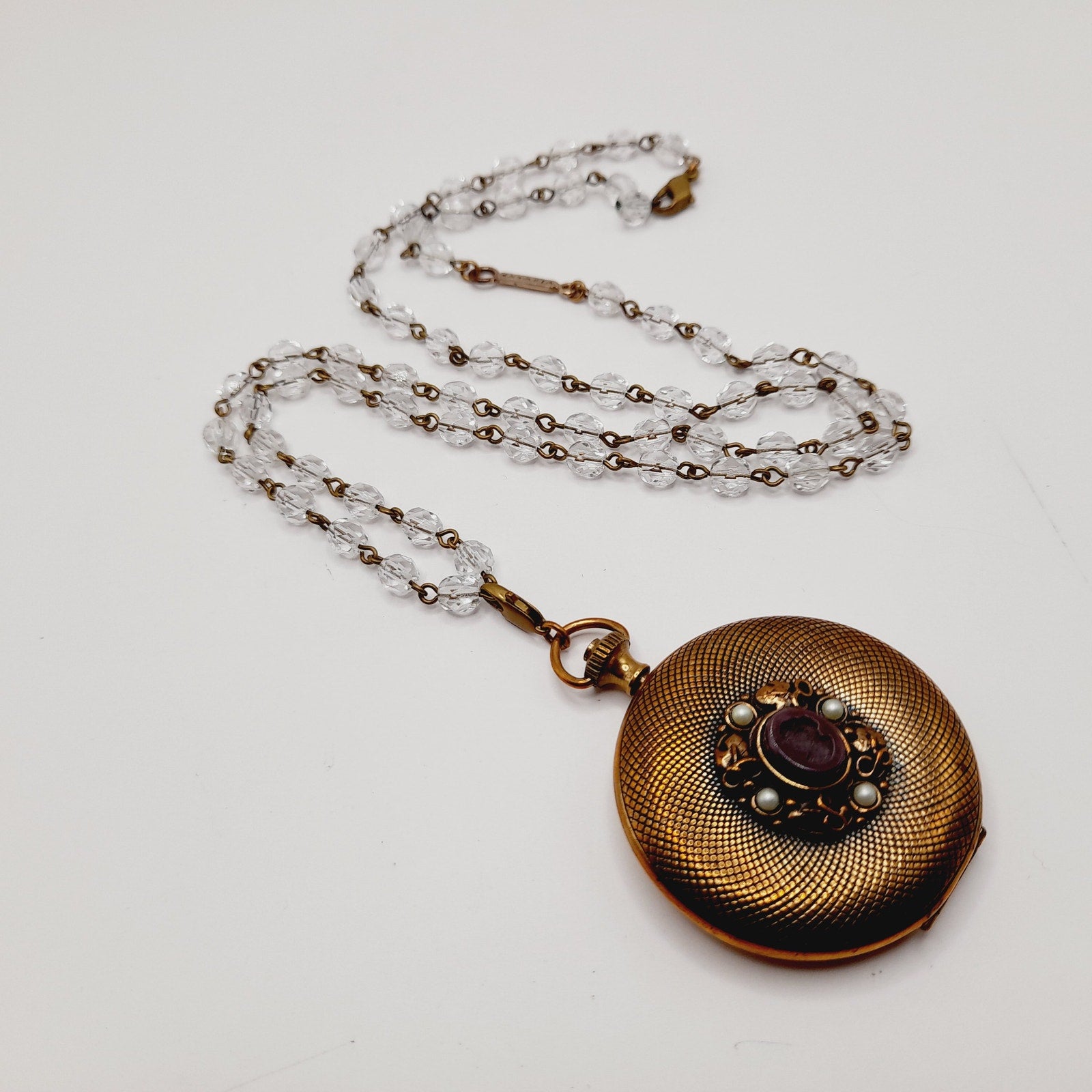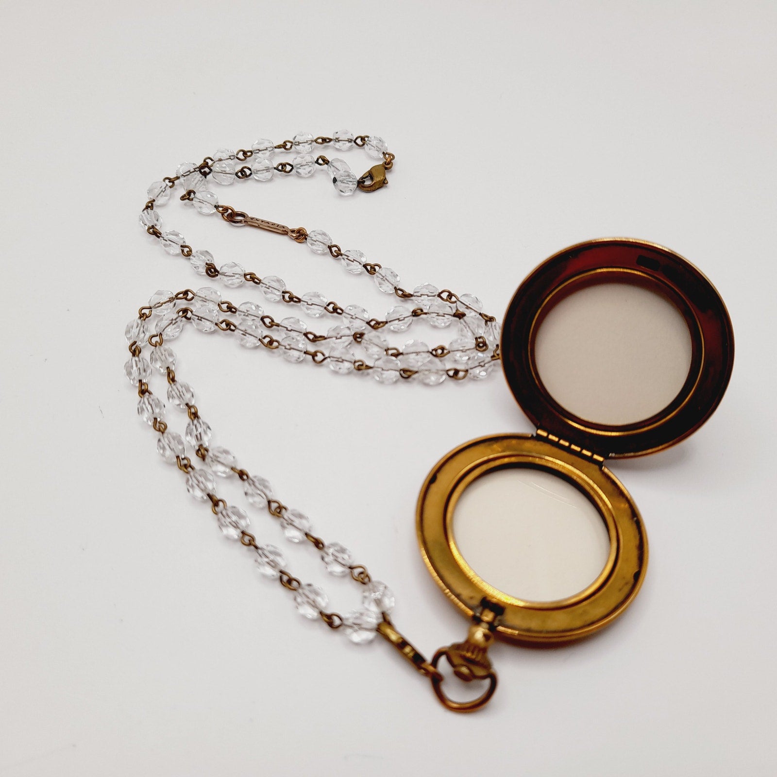 Vintage Extasia Intaglio Pocket Watch Style Locket Clear Bead Necklace, 28 Inches