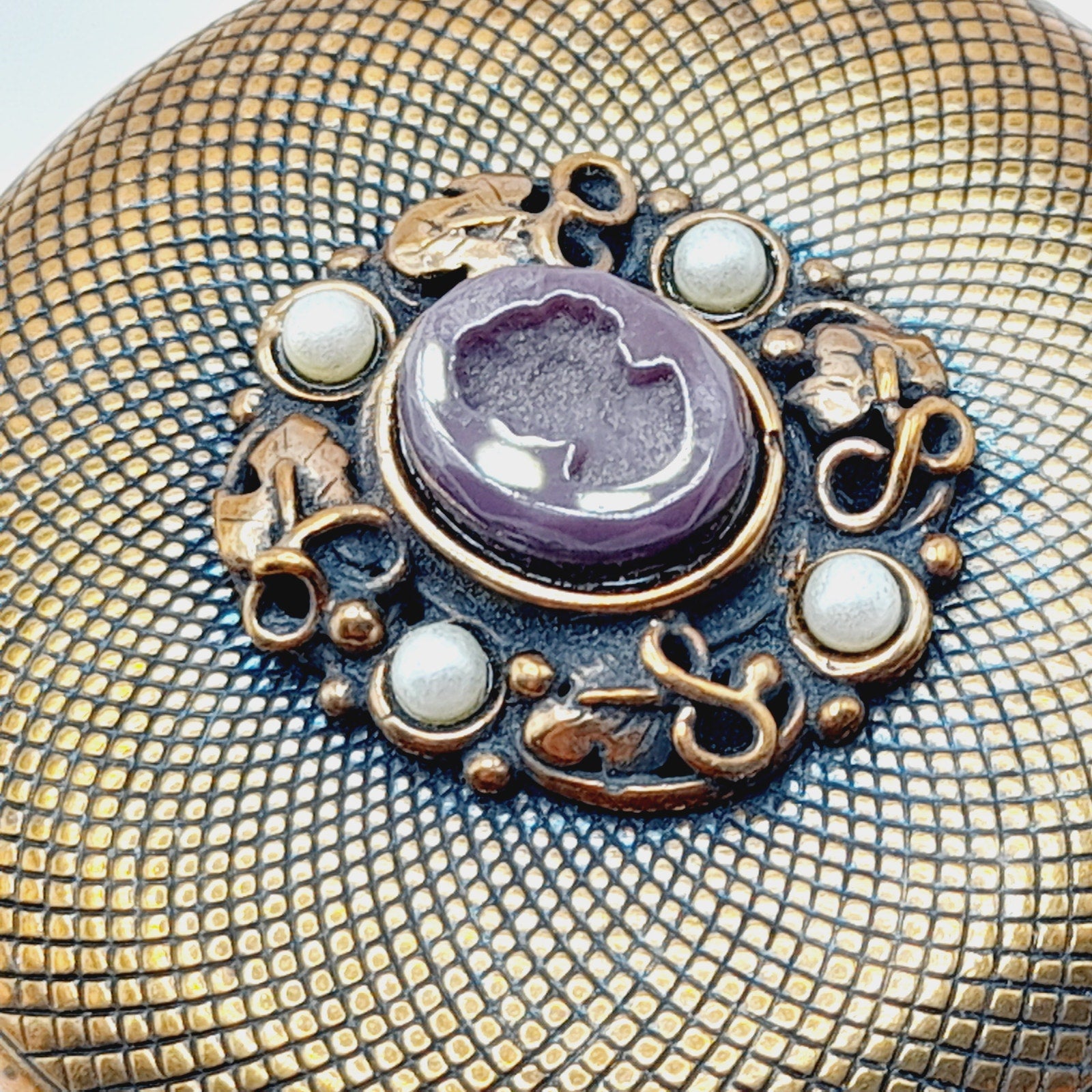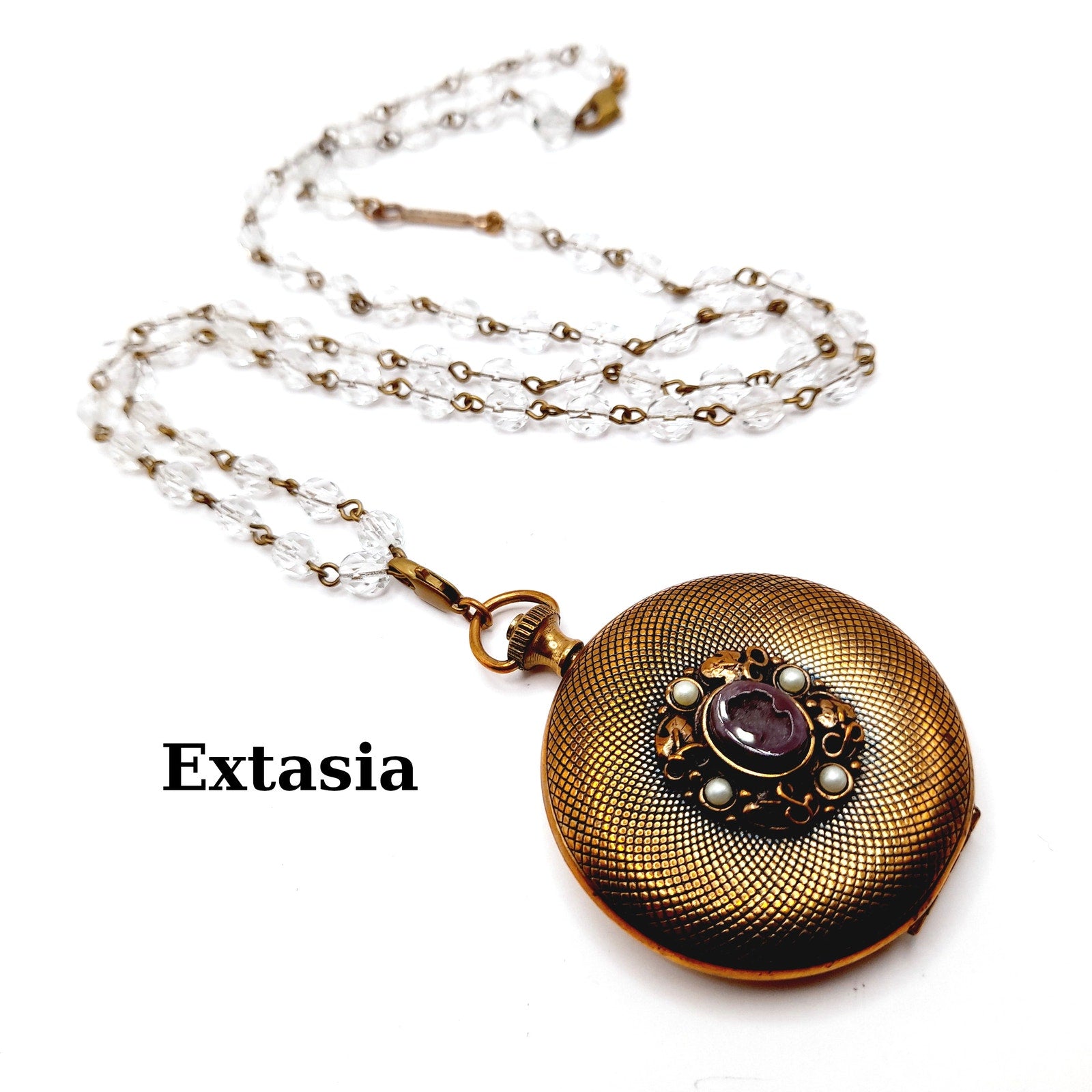 Step back in time with this exquisite vintage Extasia necklace featuring a stunning intaglio pocket watch style locket suspended from elegant clear beads. This unique piece combines classic Victorian-inspired design with timeless sophistication.