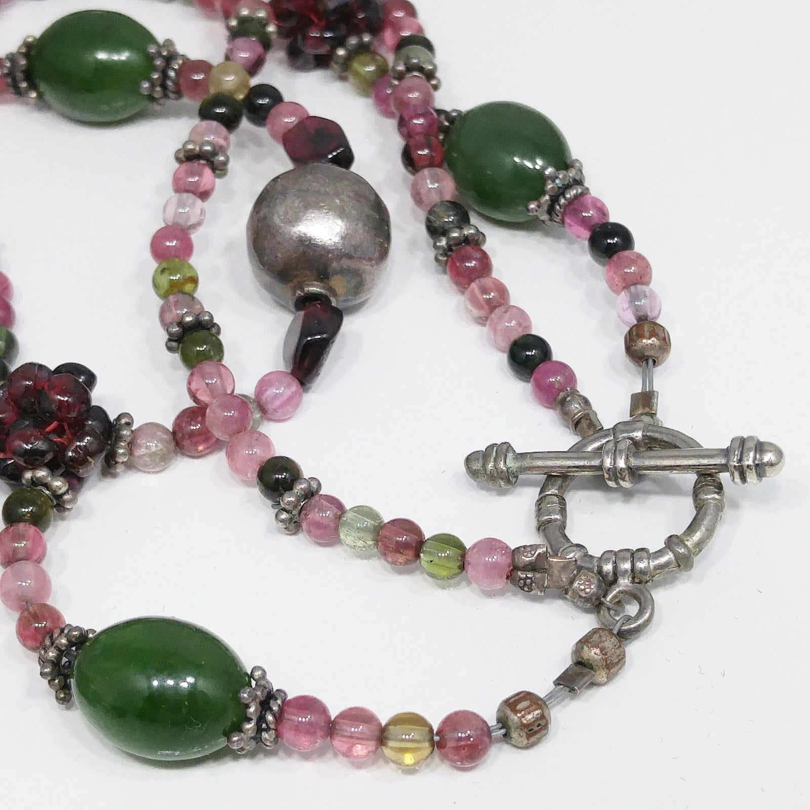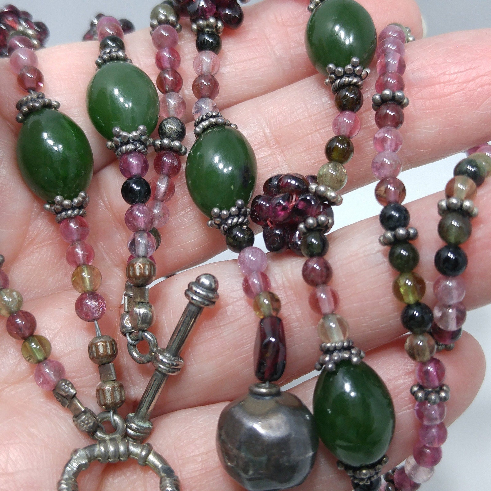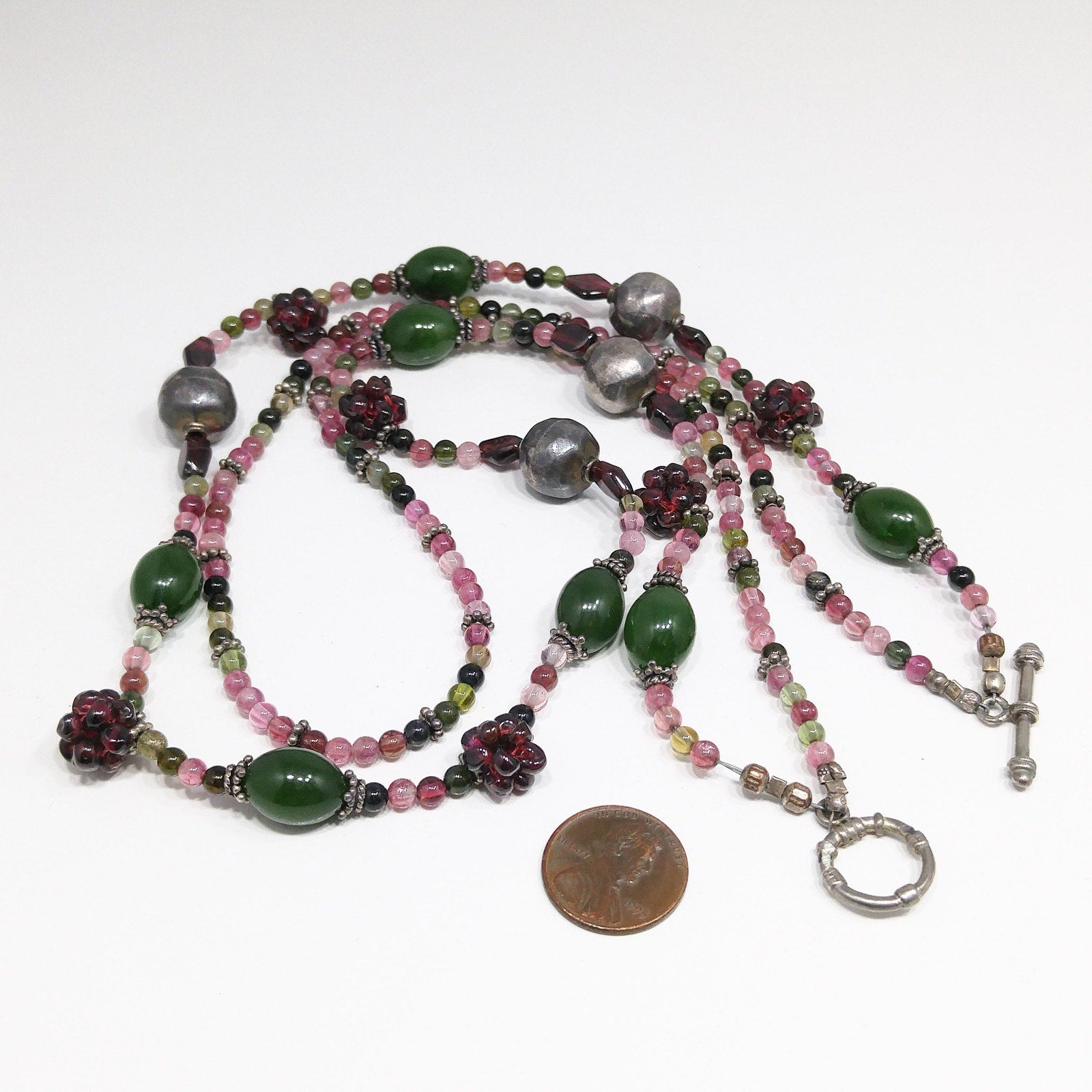*Description: This is a beautiful gemstone beaded necklace with garnet clusters, amethyst beads, and large chrysoprase green oval beads and a variety of other small 4mm gemstone beads from all over the gem testing spectrum. There are silver tone spacer beads, large silver tone beads, and silver tone toggle clasps which test gold plated. All beads are thread on wire. The shortest strand are all uniform 4mm gemstone beads. The longer strand has a mixture of round, oval, and cluster gemstones, as well as, the silver tone beads and spacers. This would be a beautiful necklace for your jewelry collection or make a great vintage gemstone gift.