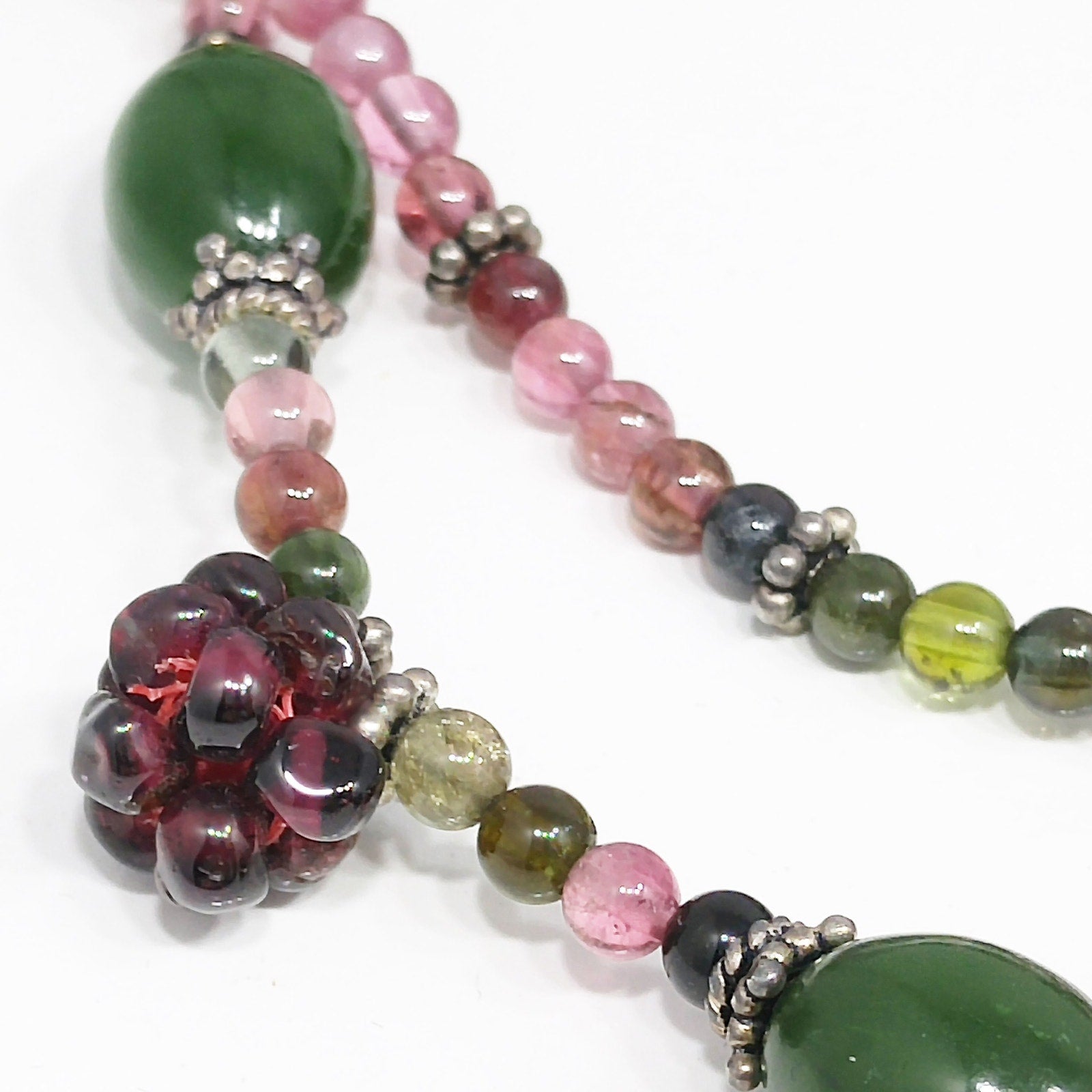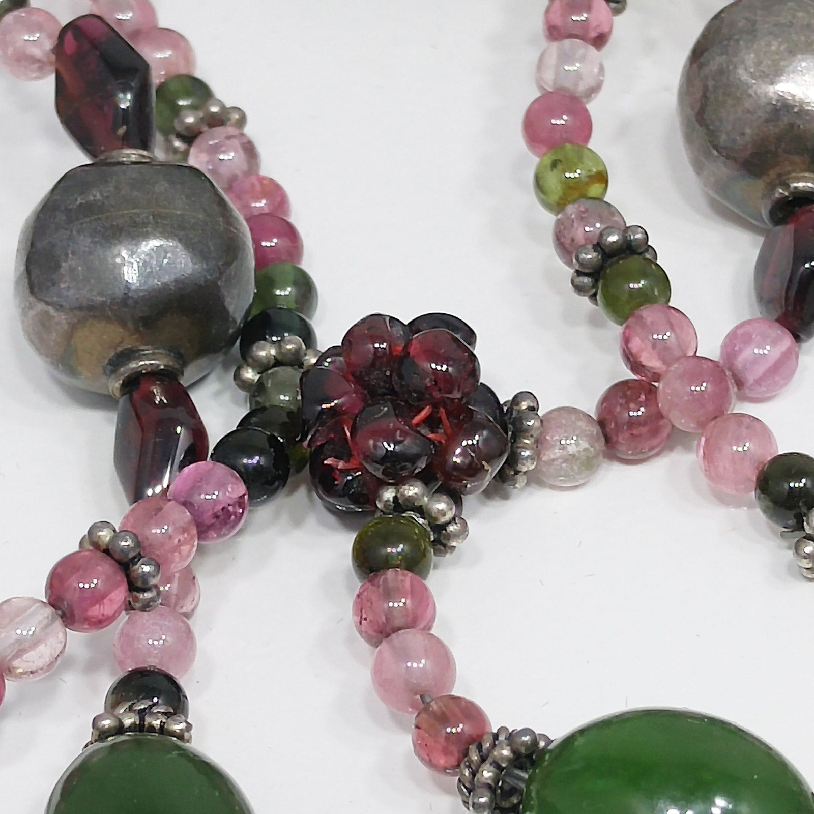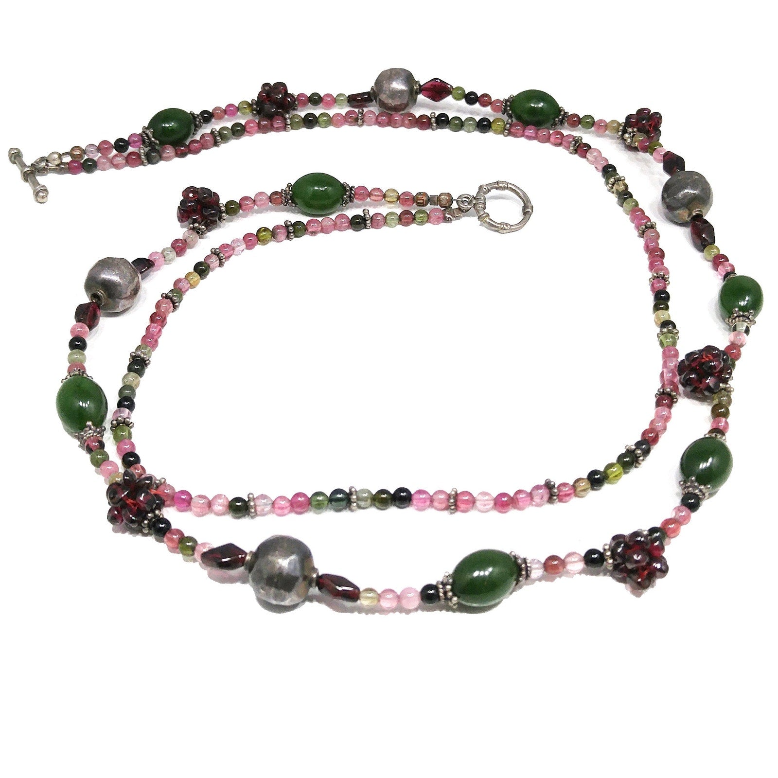 *Description: This is a beautiful gemstone beaded necklace with garnet clusters, amethyst beads, and large chrysoprase green oval beads and a variety of other small 4mm gemstone beads from all over the gem testing spectrum. There are silver tone spacer beads, large silver tone beads, and silver tone toggle clasps which test gold plated. All beads are thread on wire. The shortest strand are all uniform 4mm gemstone beads. The longer strand has a mixture of round, oval, and cluster gemstones, as well as, the silver tone beads and spacers. This would be a beautiful necklace for your jewelry collection or make a great vintage gemstone gift.