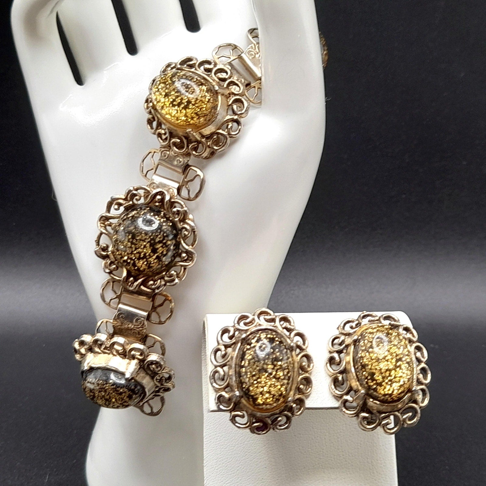 *Description: This is a beautiful mid-century vintage glitter Lucite bracelet and matching clip on earrings from the 1950s. The bracelet has the book chain design and the gold glitter has a black background. It is a unique vintage jewelry set. This would be a great addition to your vintage jewelry collection or make a great vintage gift!