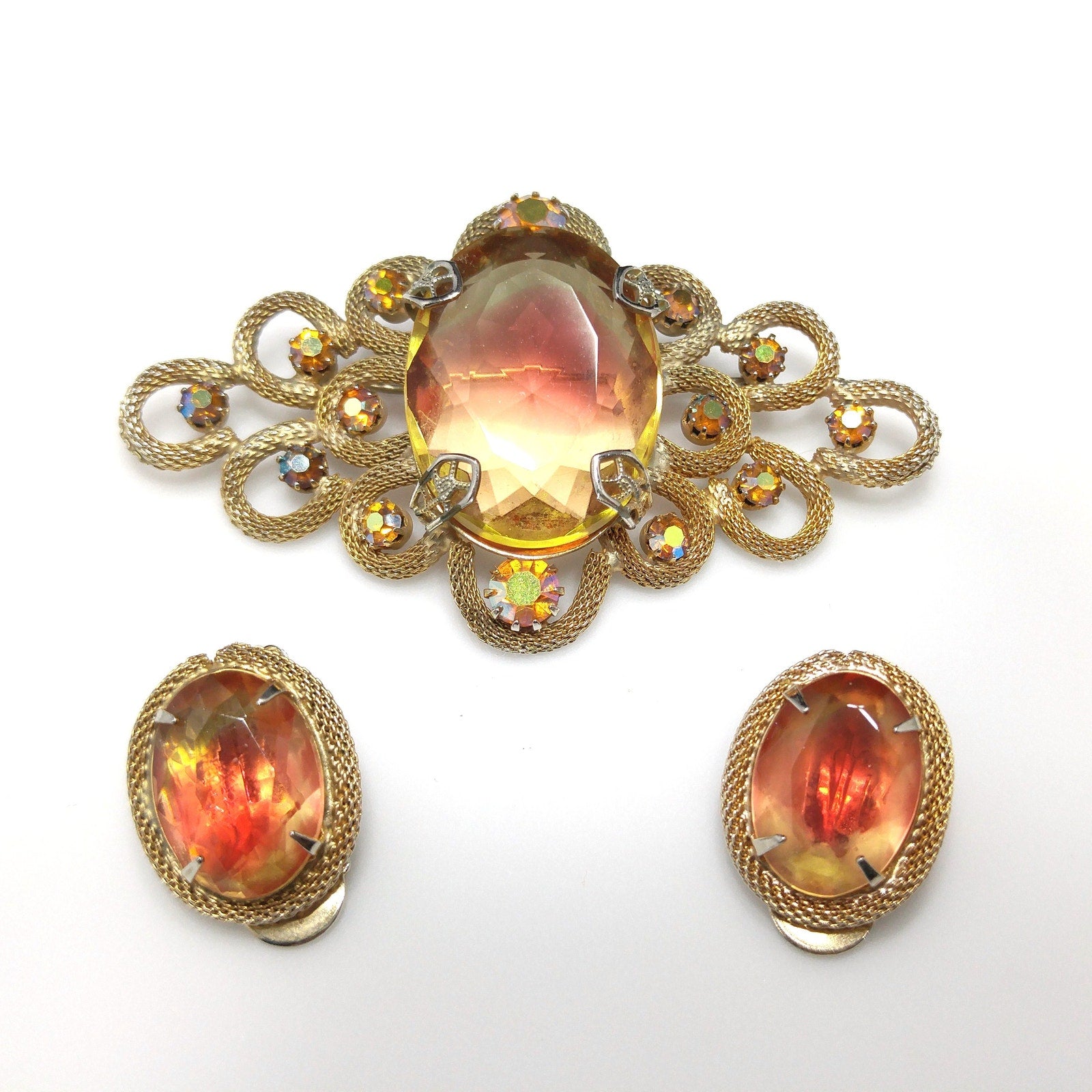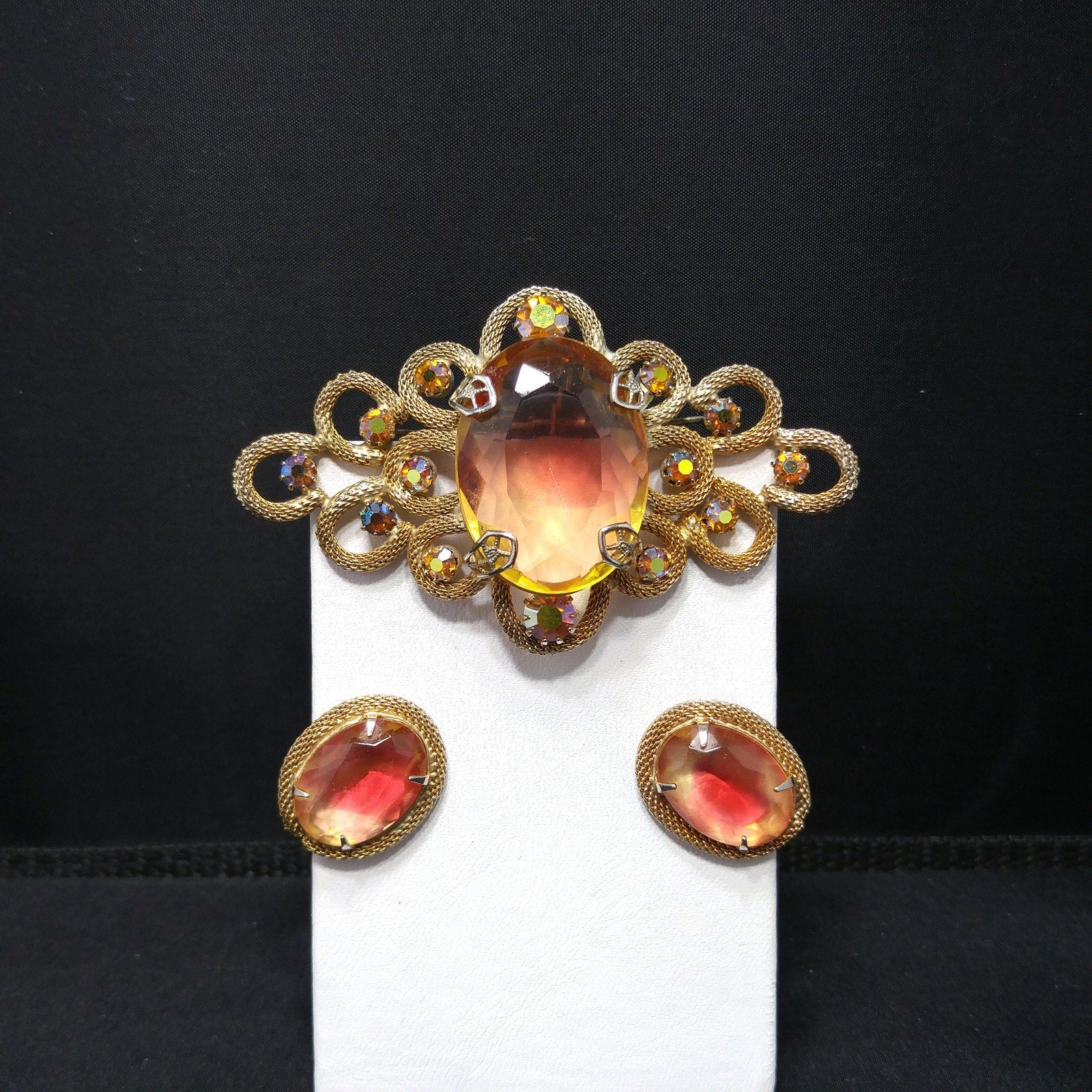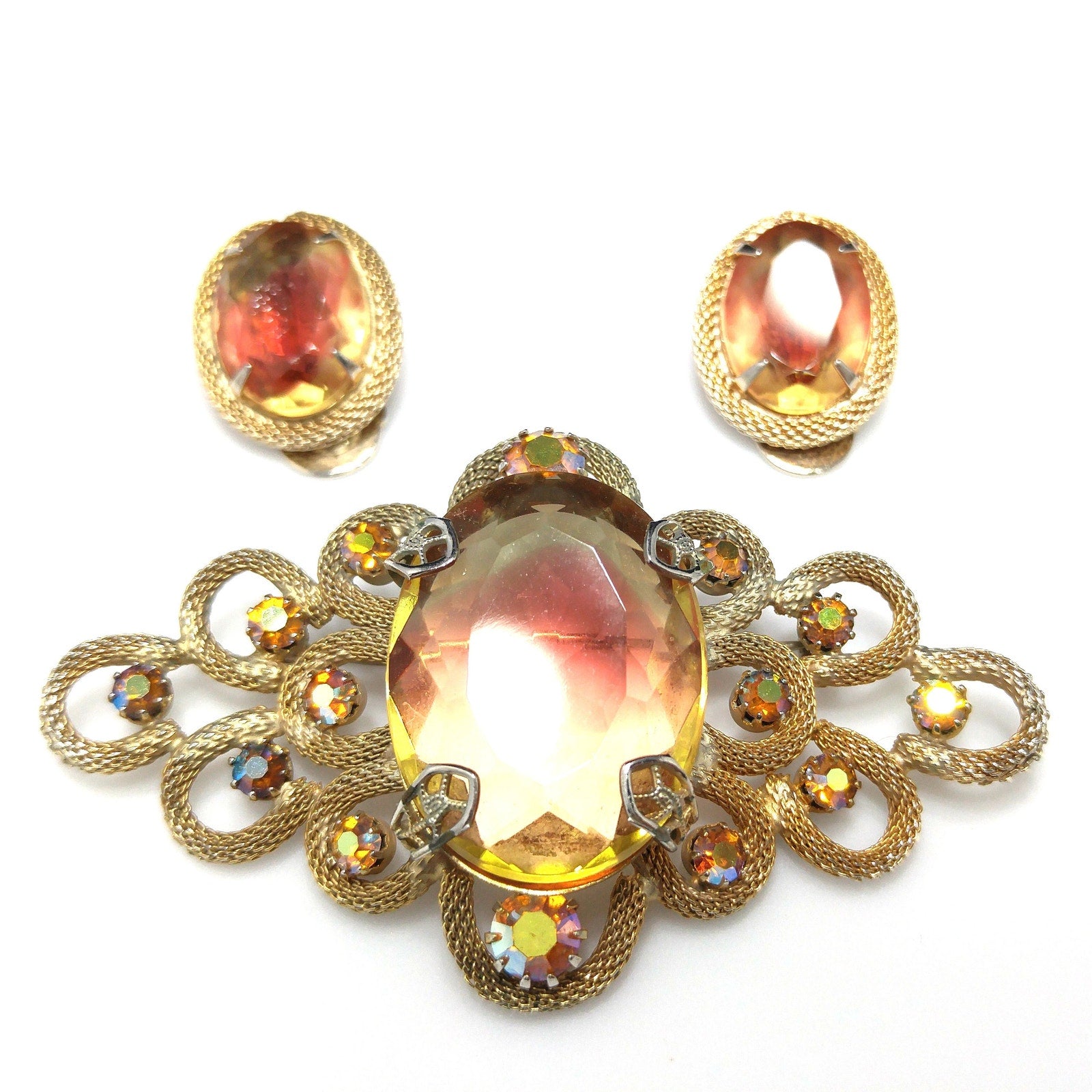*Description: This is a beautiful vintage large glass brooch and matching earrings from the 1960s. The large brooch is three inches wide with gold plated mesh setting and a large glass center, prong set, which is art glass, and accented with aurora borealis rhinestones within each loop on the brooch. The art glass in the brooch has light gold on each side and a pinker color in the center. The earrings match and have more of the pink glass with a little light gold glass on the sides. It is a unique and beautiful set. This would be a great addition to your vintage jewelry collection or make a great vintage gift!