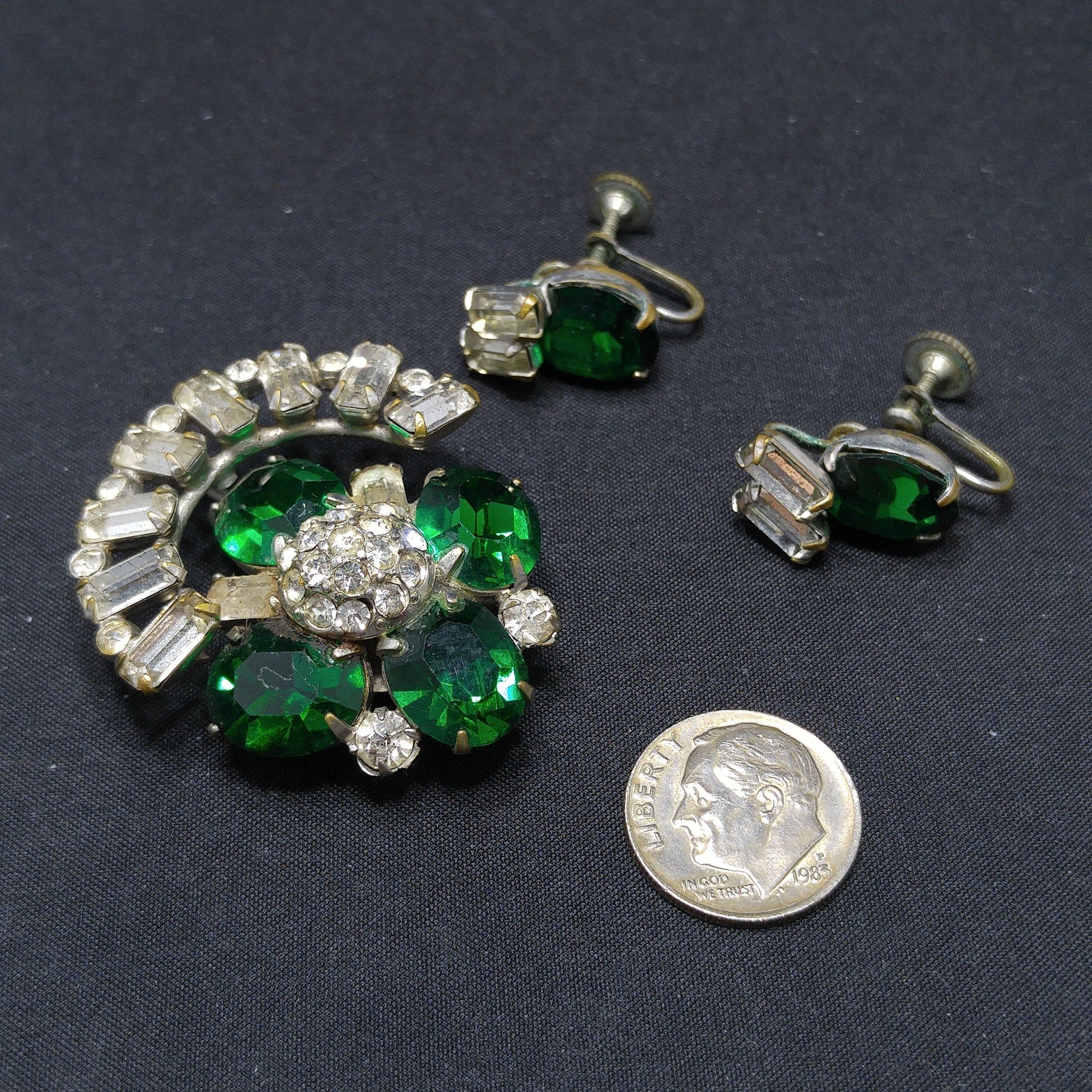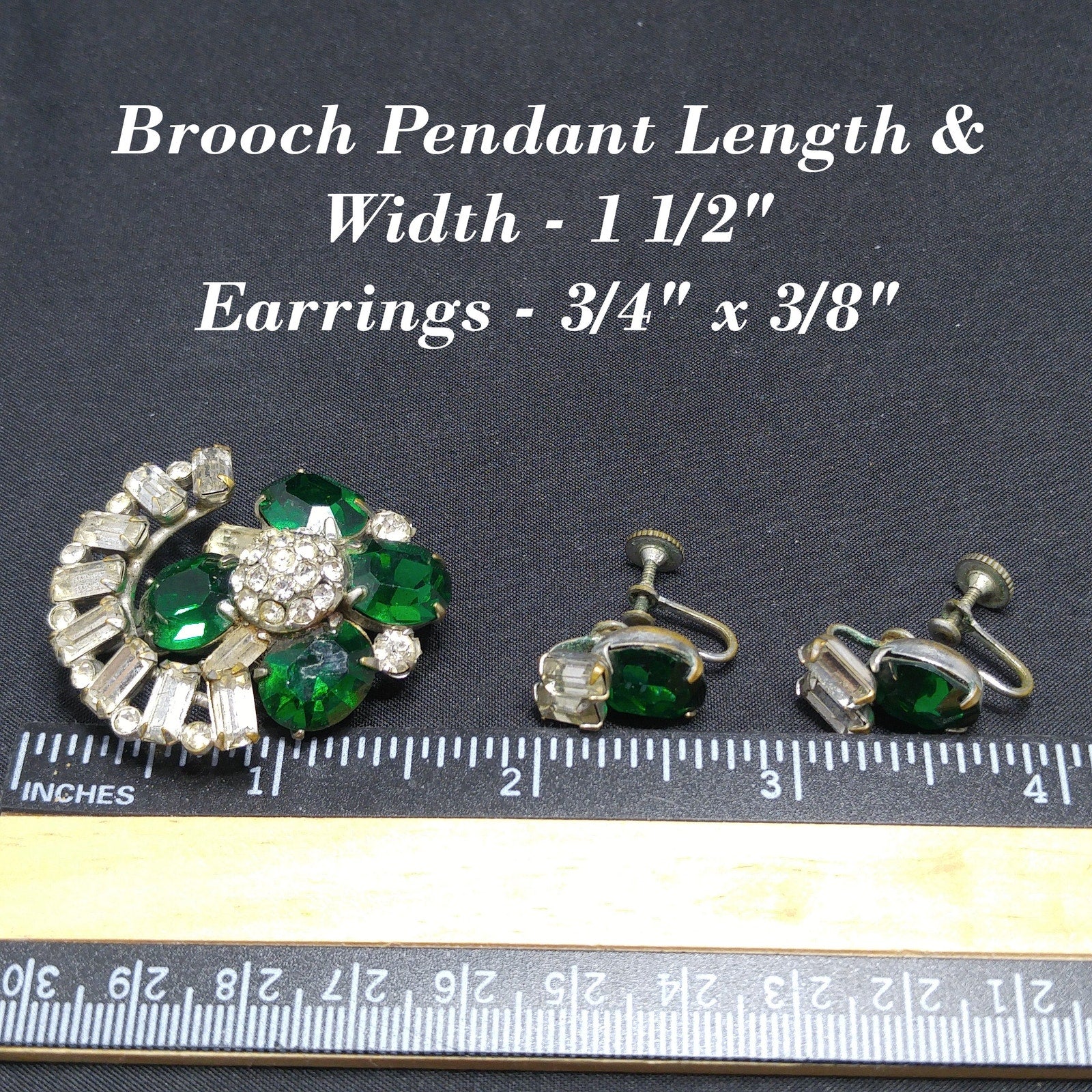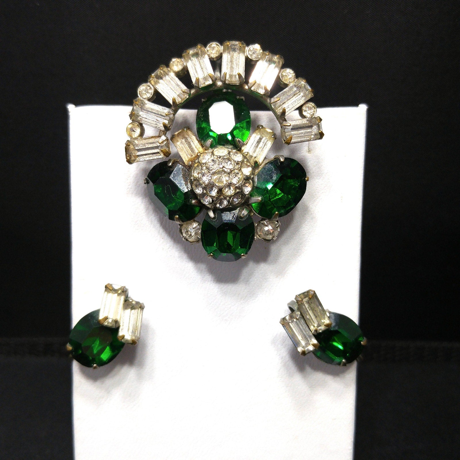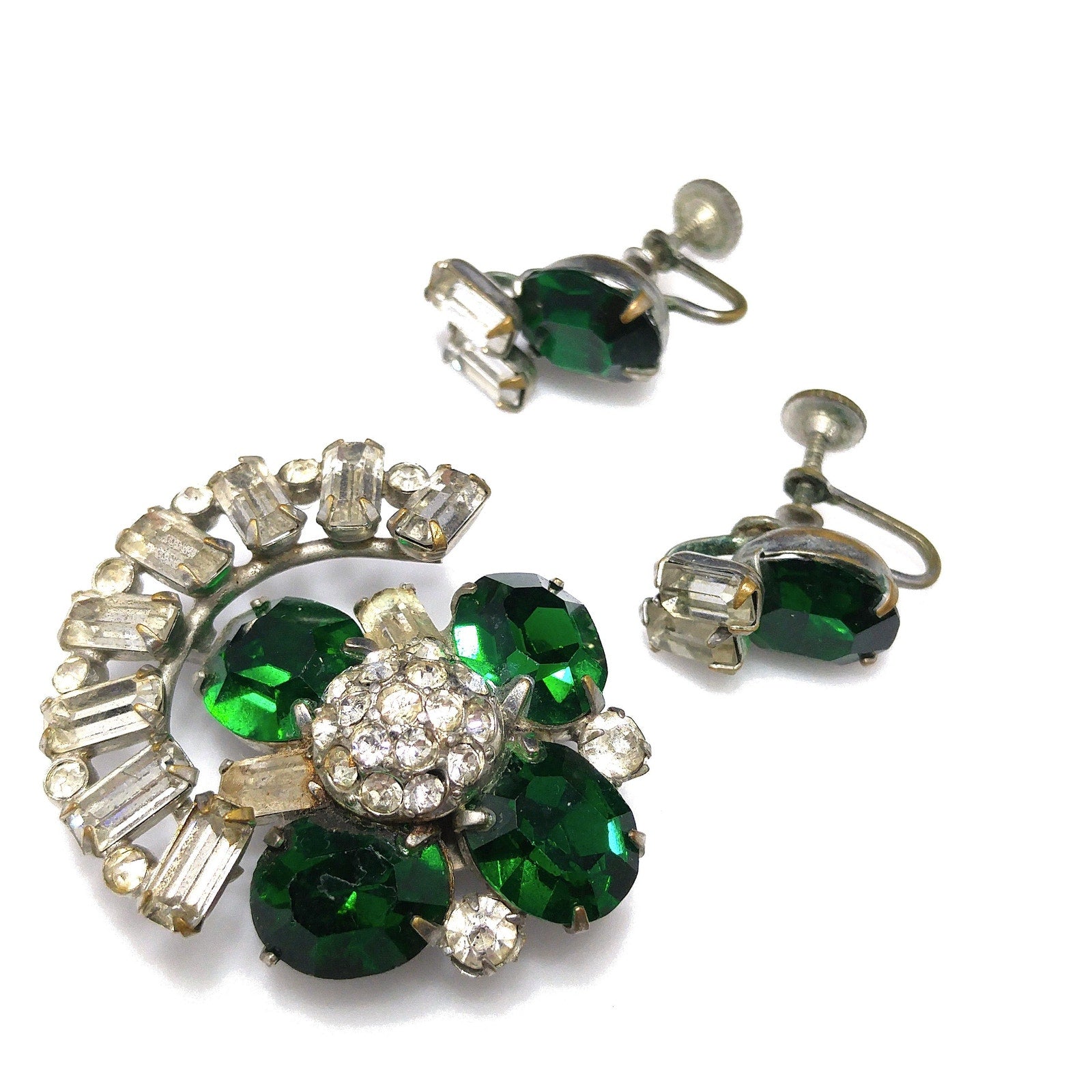 *Description: This is a great vintage brooch pendant combo with matching screw back earrings in emerald green rhinestones and clear baguette rhinestones with tiny clear rhinestone accents from the 1940s. The larger rhinestones are foil backed and the pendant has two bails, one is a smaller ring and the other is a larger built in bail. In addition. there is a small rolling c clasp for the brooch. The matching screw back earrings have one large green rhinestone with two clear baguettes. This would be a great addition to your vintage jewelry collection or make a great vintage gift!