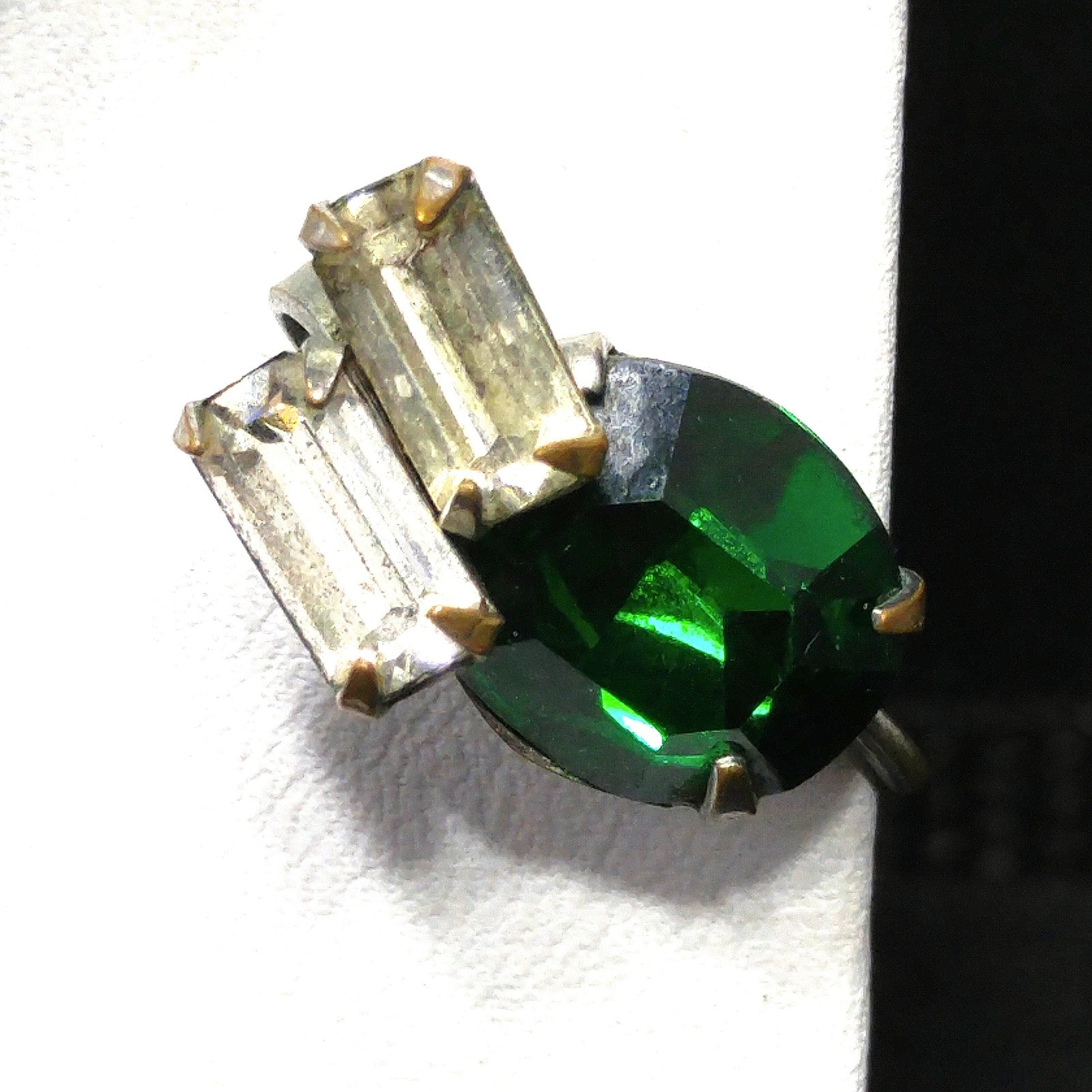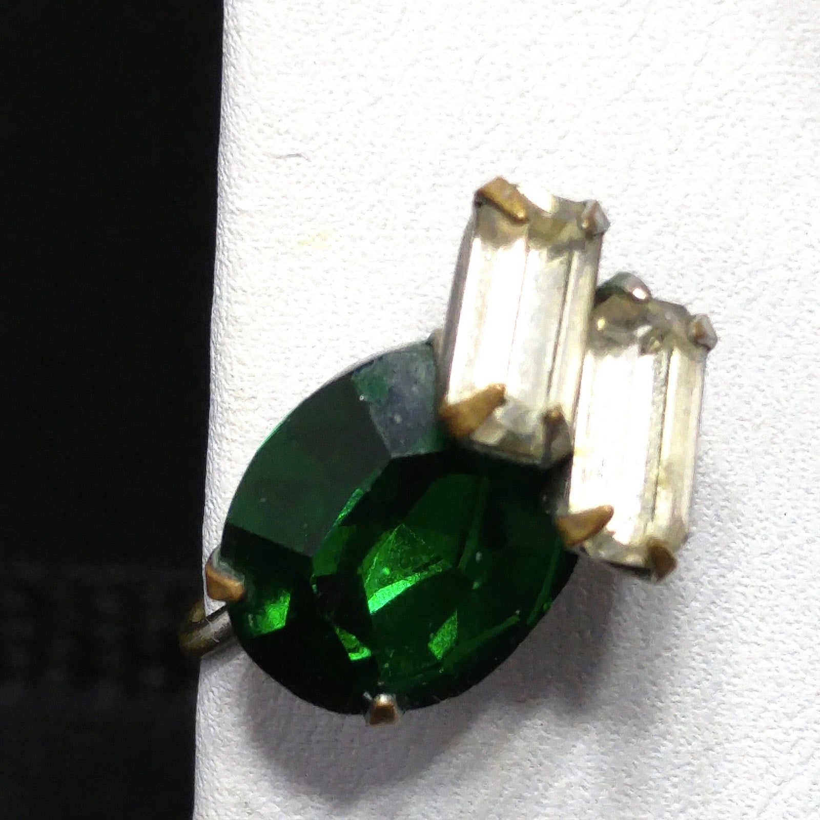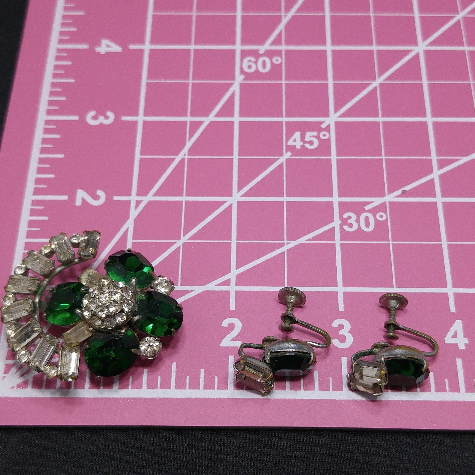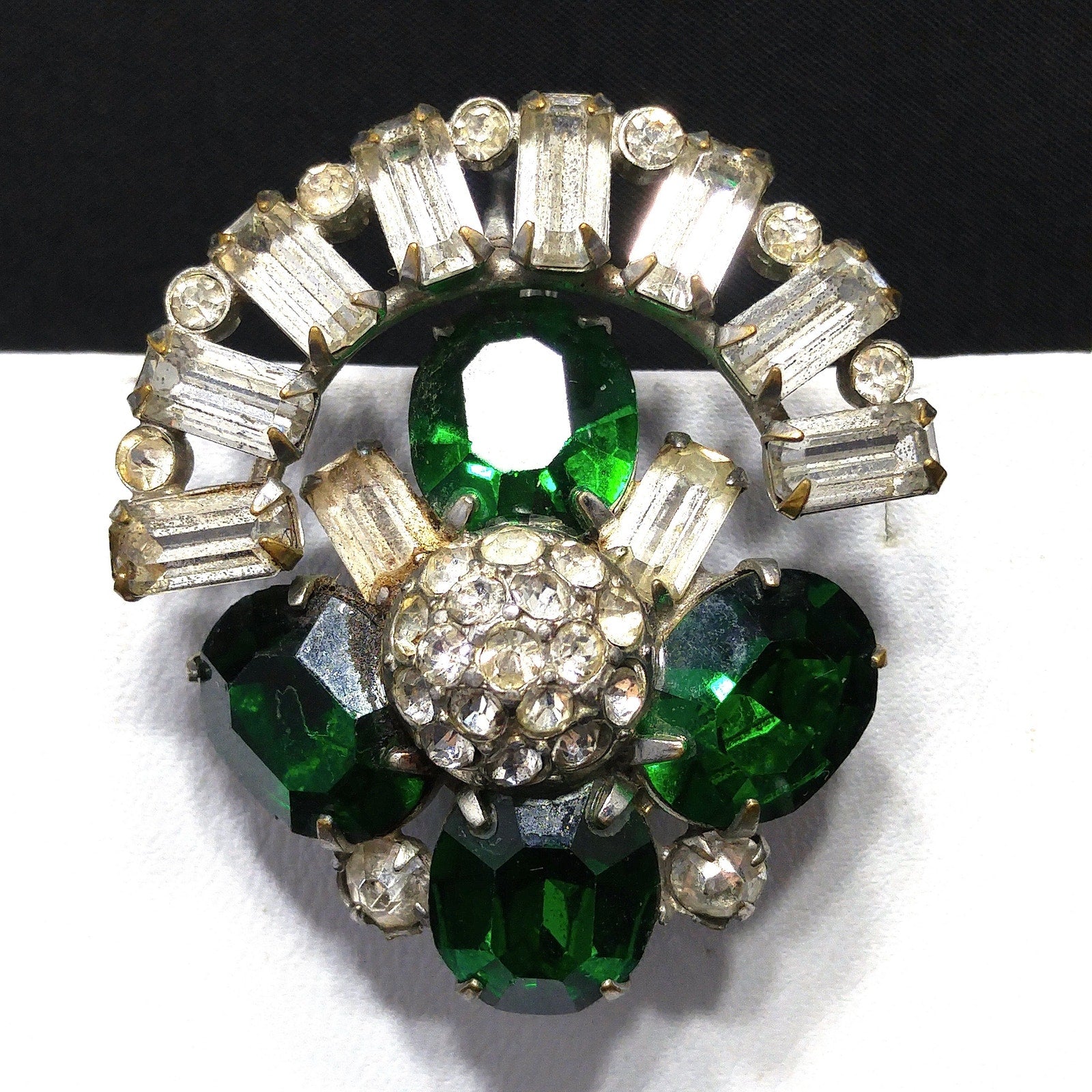 *Description: This is a great vintage brooch pendant combo with matching screw back earrings in emerald green rhinestones and clear baguette rhinestones with tiny clear rhinestone accents from the 1940s. The larger rhinestones are foil backed and the pendant has two bails, one is a smaller ring and the other is a larger built in bail. In addition. there is a small rolling c clasp for the brooch. The matching screw back earrings have one large green rhinestone with two clear baguettes. This would be a great addition to your vintage jewelry collection or make a great vintage gift!