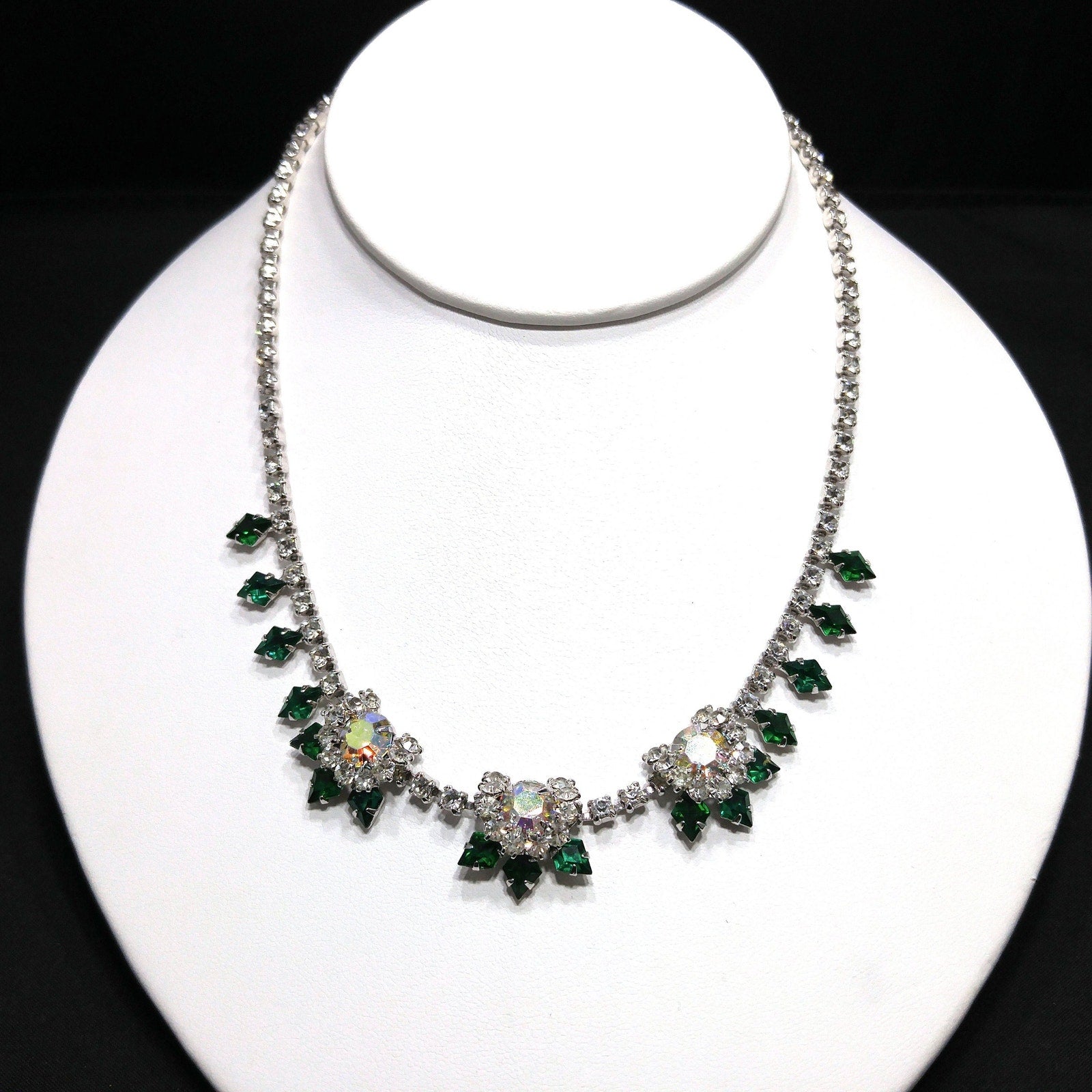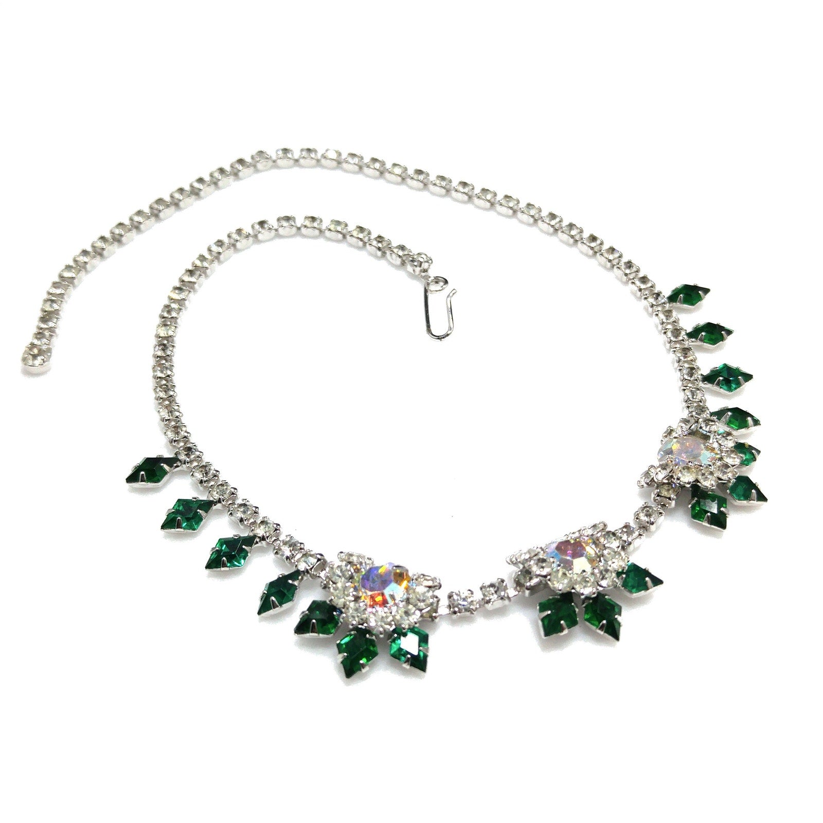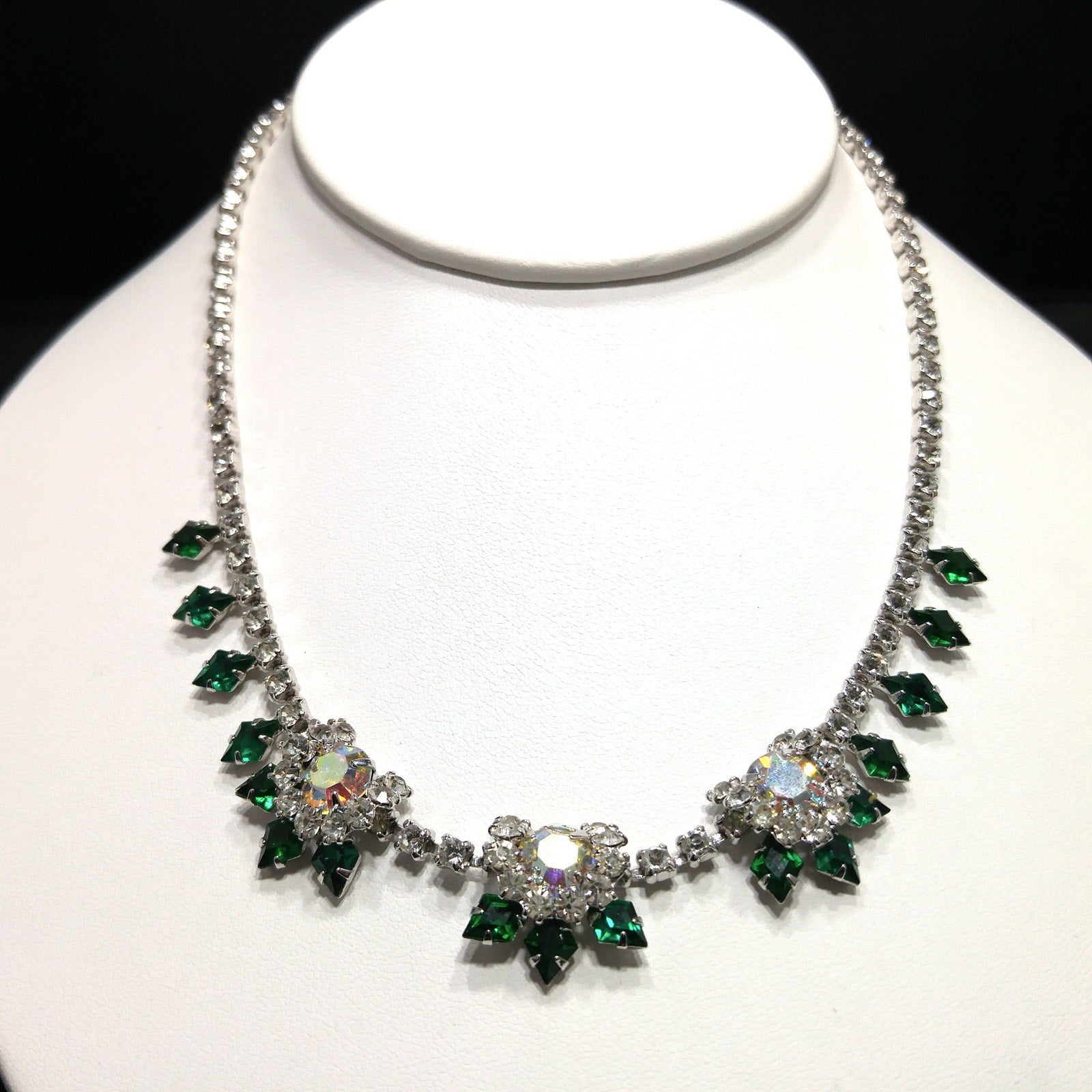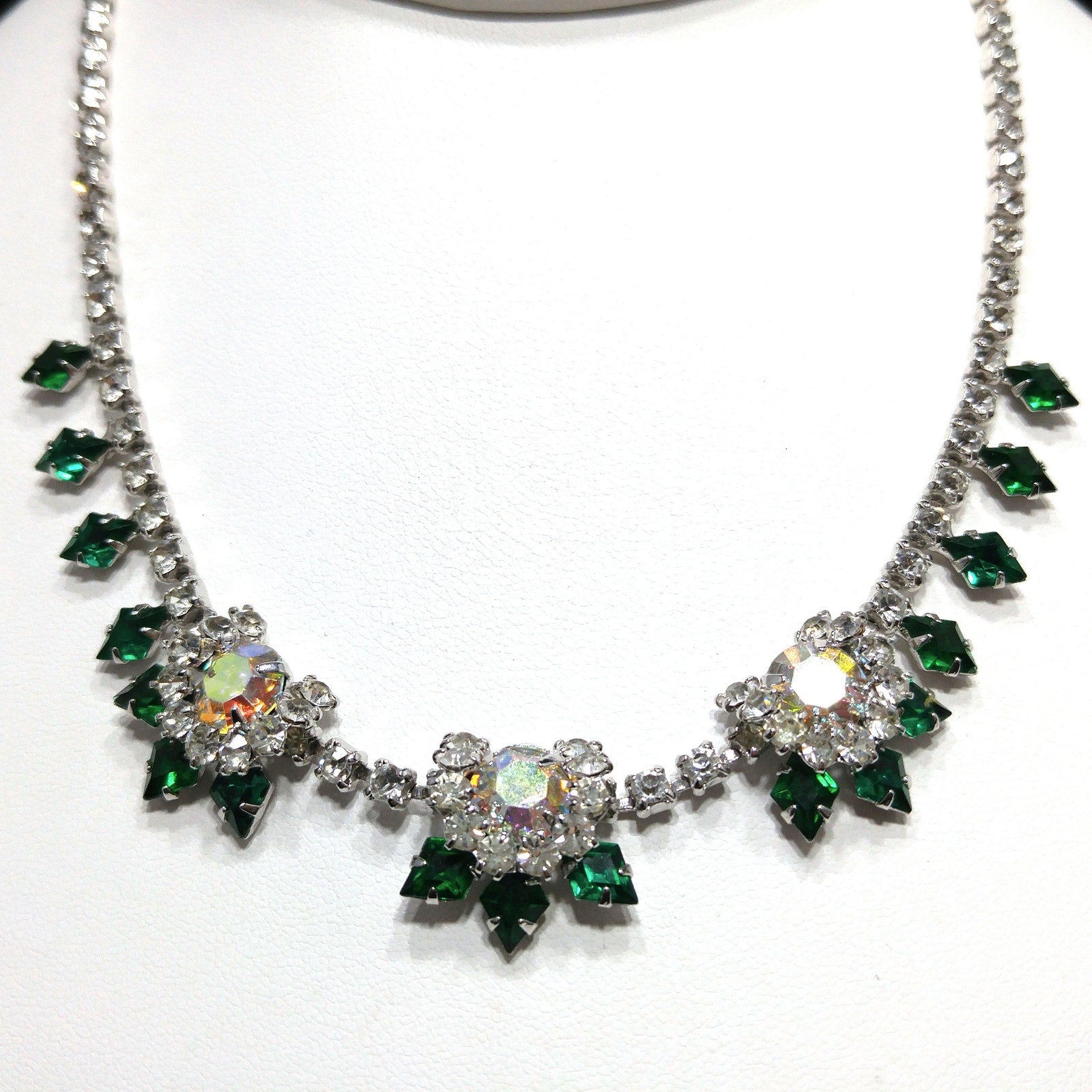 *Description: This is a gorgeous green diamond shaped rhinestone necklace with clear round rhinestones and larger aurora borealis rhinestones from the 1960s.  The emerald green rhinestones with the clear rhinestones are on a rhodium plated silver toned backing.  The necklace is in wonderful condition.  It has a hook for the clasp and is adjustable up to 15 3/4 Inches.  The necklace is 16 inches but the wearable length is 15 3/4 inches.  This would be a great addition to your vintage jewelry collection or make a great vintage gift!