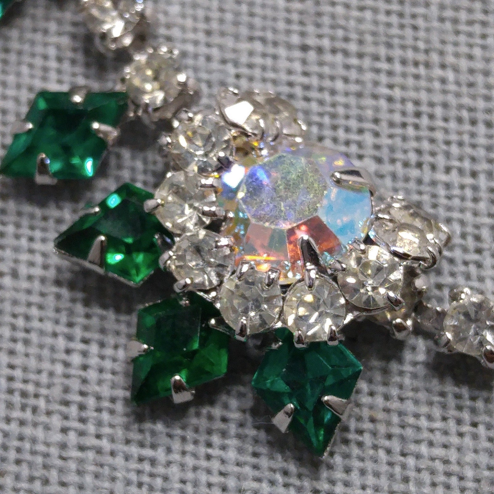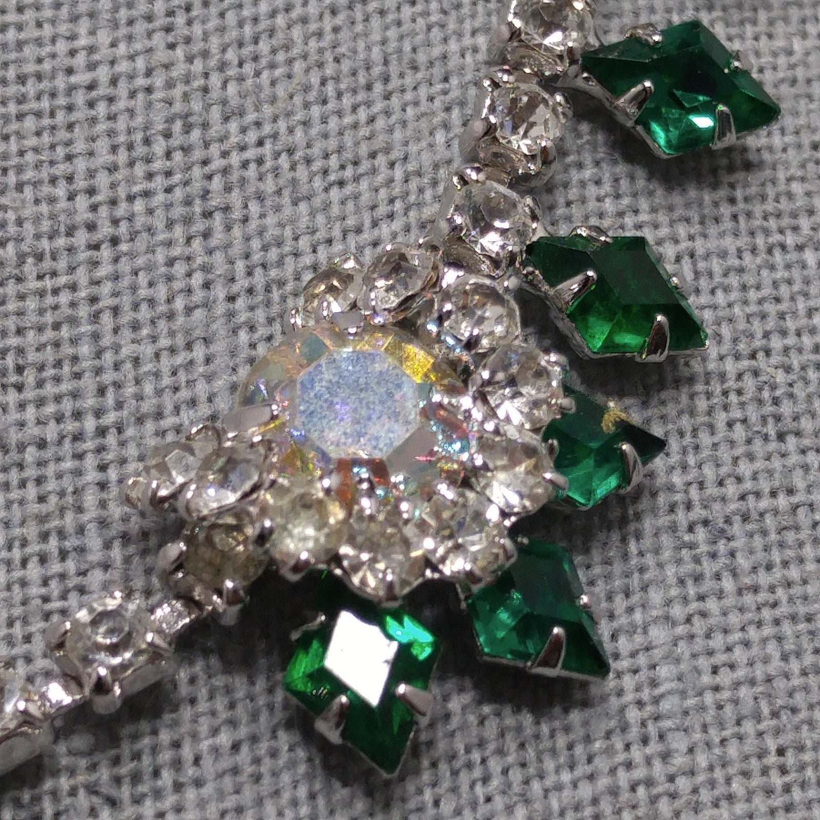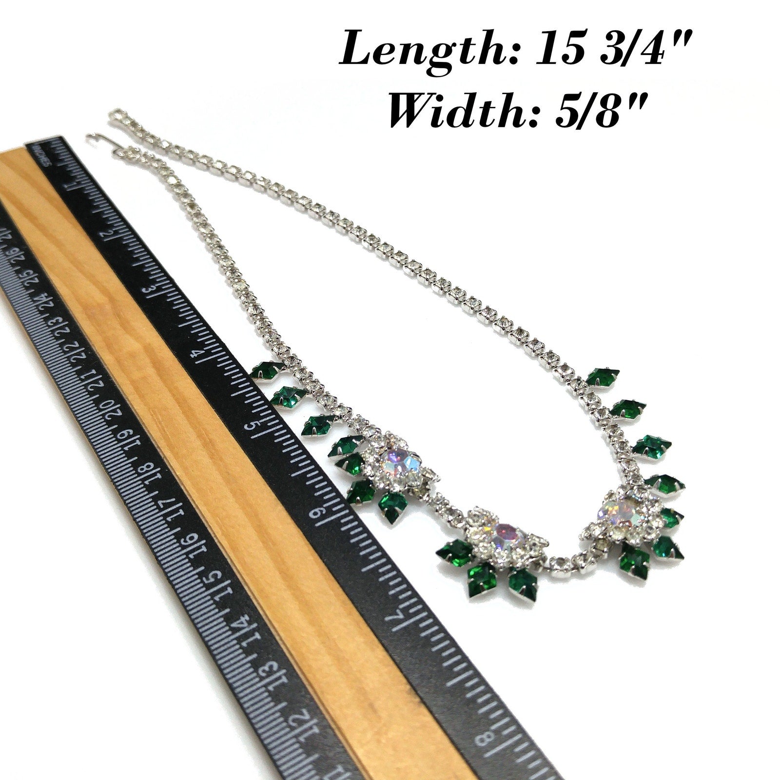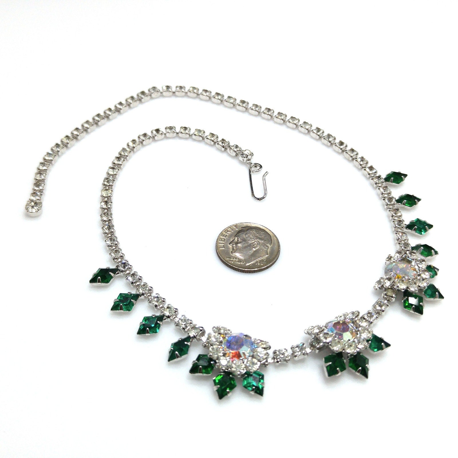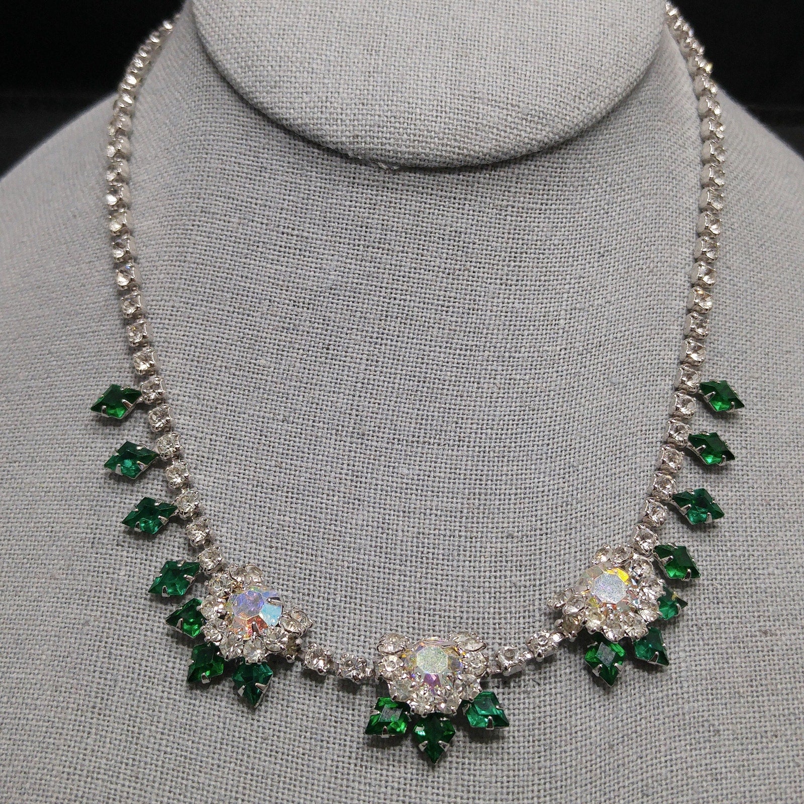 *Description: This is a gorgeous green diamond shaped rhinestone necklace with clear round rhinestones and larger aurora borealis rhinestones from the 1960s.  The emerald green rhinestones with the clear rhinestones are on a rhodium plated silver toned backing.  The necklace is in wonderful condition.  It has a hook for the clasp and is adjustable up to 15 3/4 Inches.  The necklace is 16 inches but the wearable length is 15 3/4 inches.  This would be a great addition to your vintage jewelry collection or make a great vintage gift!