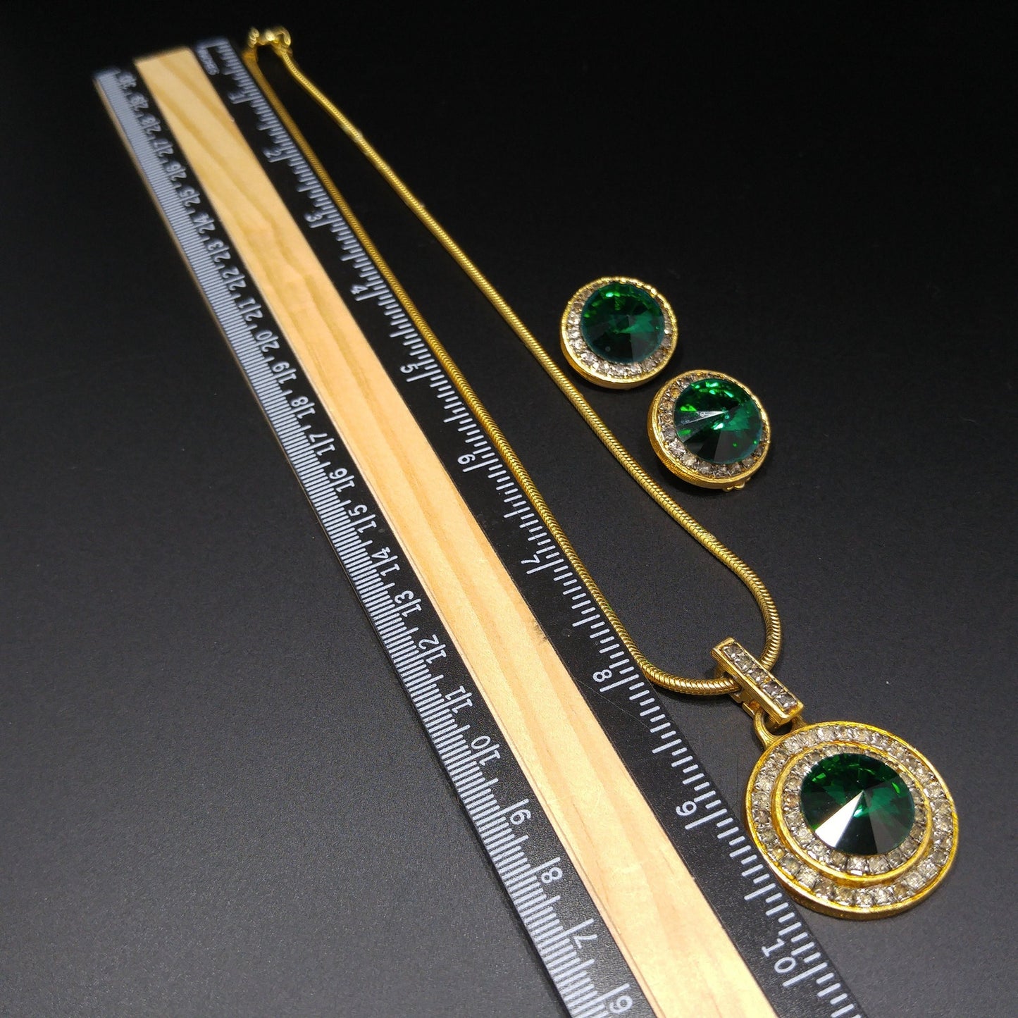 *Description: This is a beautiful emerald green rivoli rhinestone necklace and matching clip on earrings from the 1970s. The chain is a gold tone snake chain and the pendant hangs on a rhinestone bail. The pendant has an emerald green rivoli rhinestone in the center and it is framed with two rows of pave rhinestones. The matching earrings have the same size of rivoli rhinestone in emerald green with one row of pave clear rhinestones. Due to the age, some of the clear rhinestones have slightly grayed which gives it more of a vintage look. This would be a great addition to your vintage jewelry collection or make a great vintage gift!