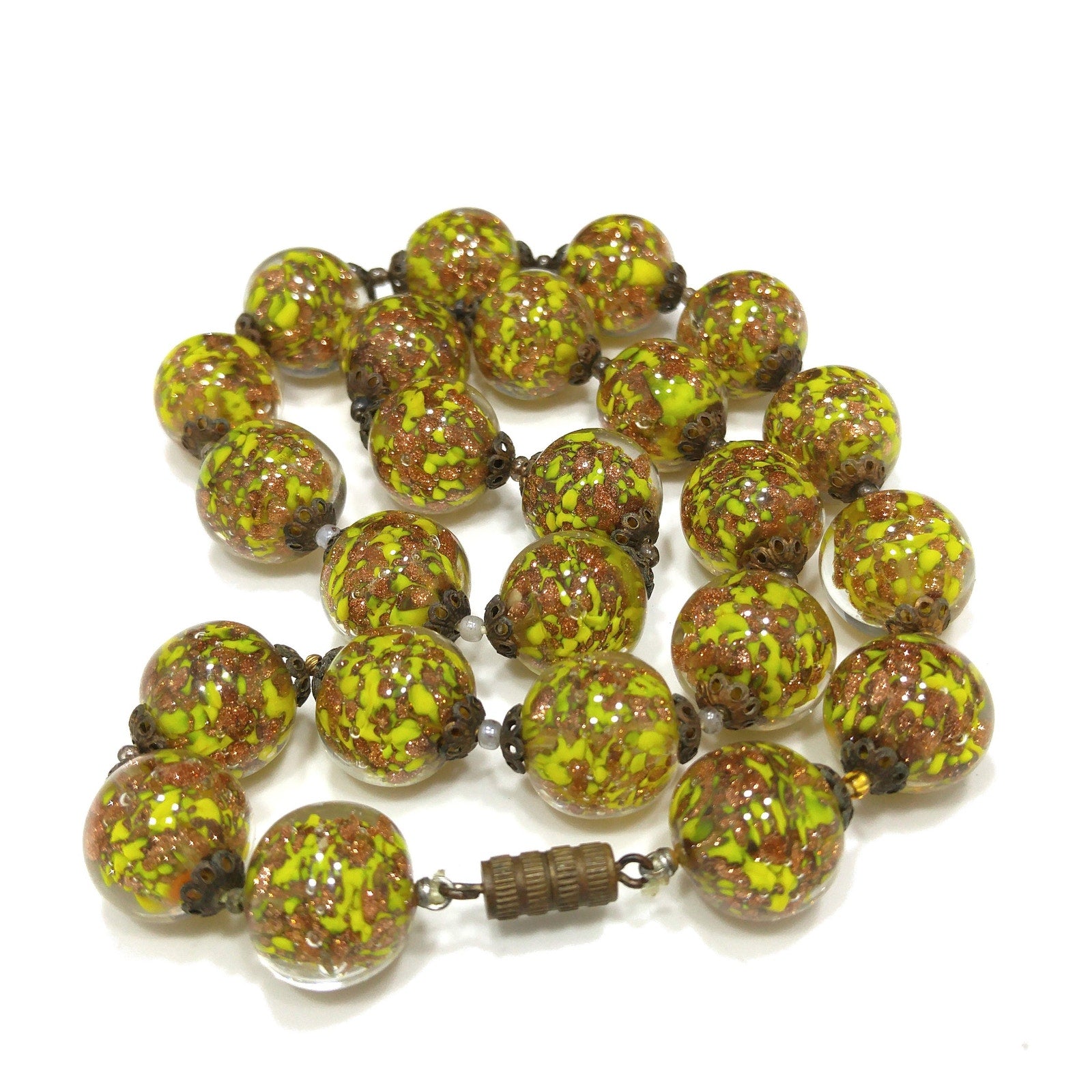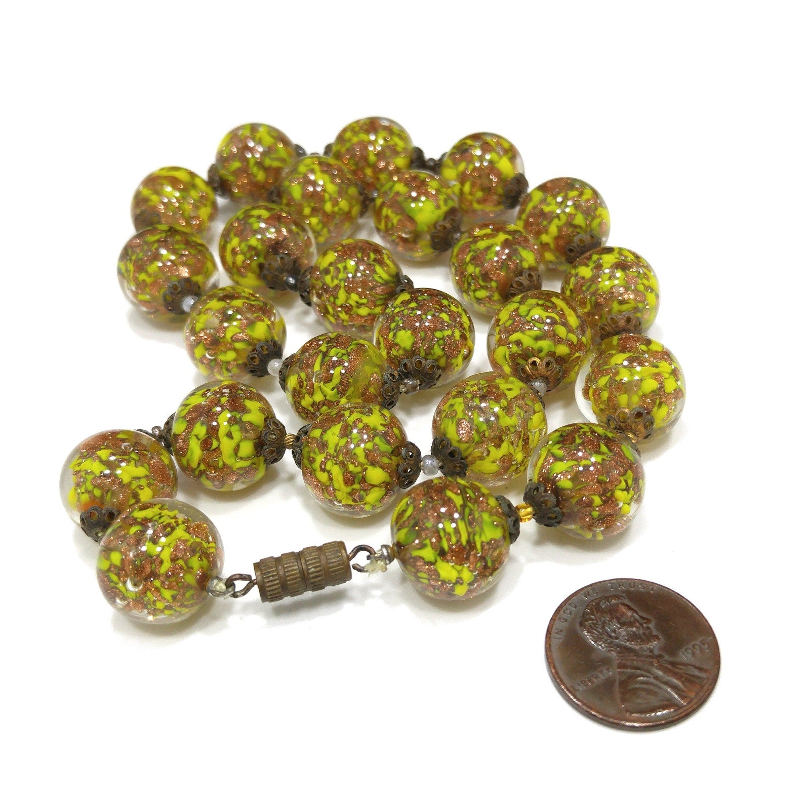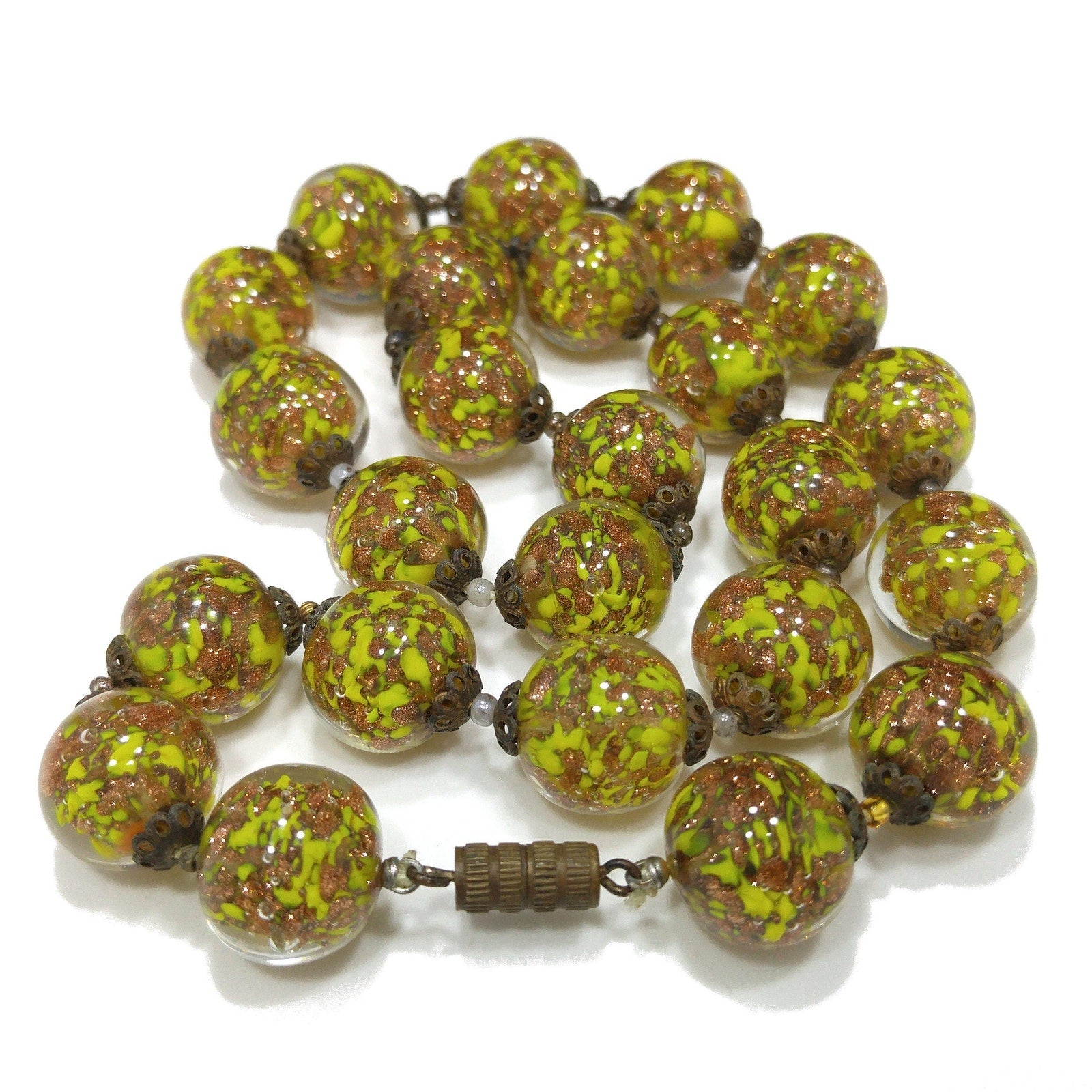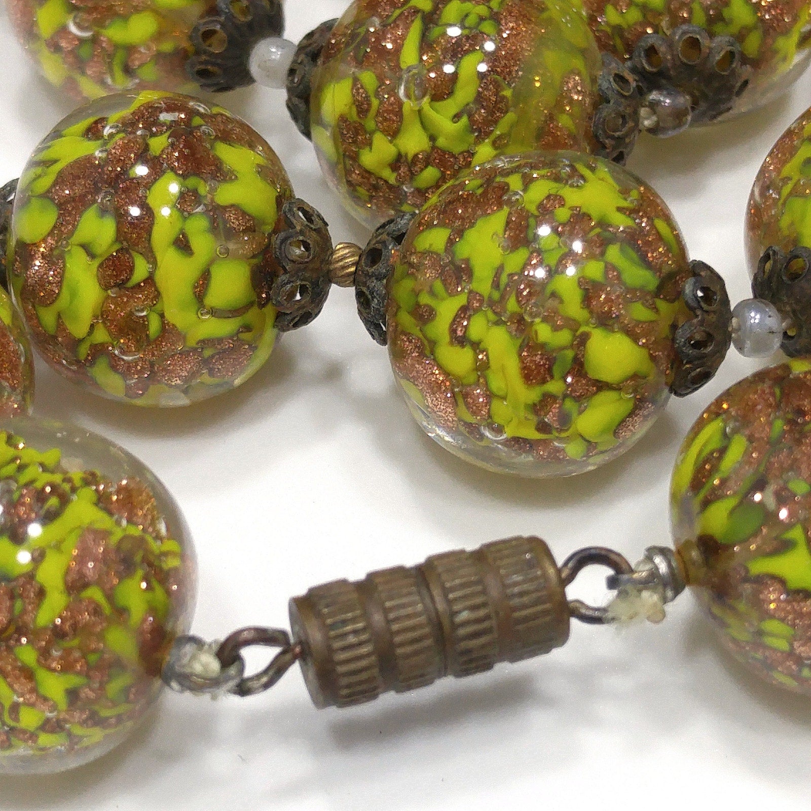 Vintage Green Venetian Glass Beaded Necklace, Copper Aventurine Italian Beads, 1930s Vintage Jewelry