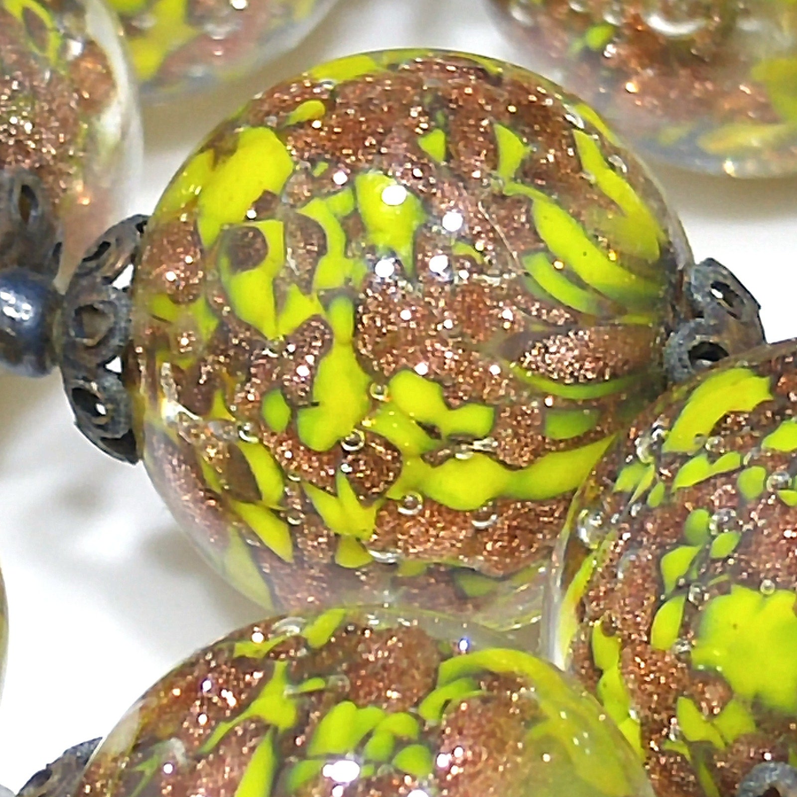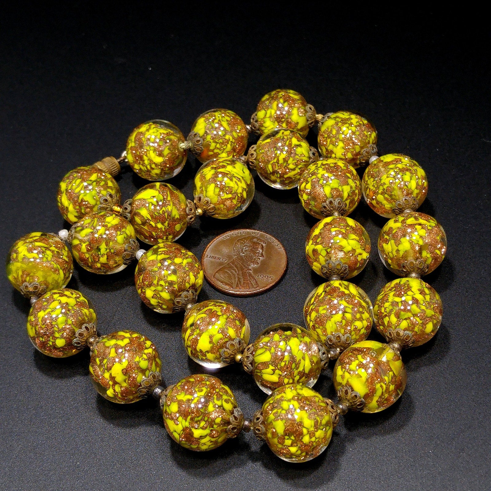*Description: This is a beautiful clear glass, with green inside, Murano Italian glass beaded necklace made in the 1930s and filled with flecks of copper & gold which looks like glitter. Gold and copper within the beads is referred to as Aventurine. The necklace was designed with 24 15mm beads separated by seed beads and filigree end caps. These are gorgeous Venetian beads and as a bead collector, these are one of my favorites.