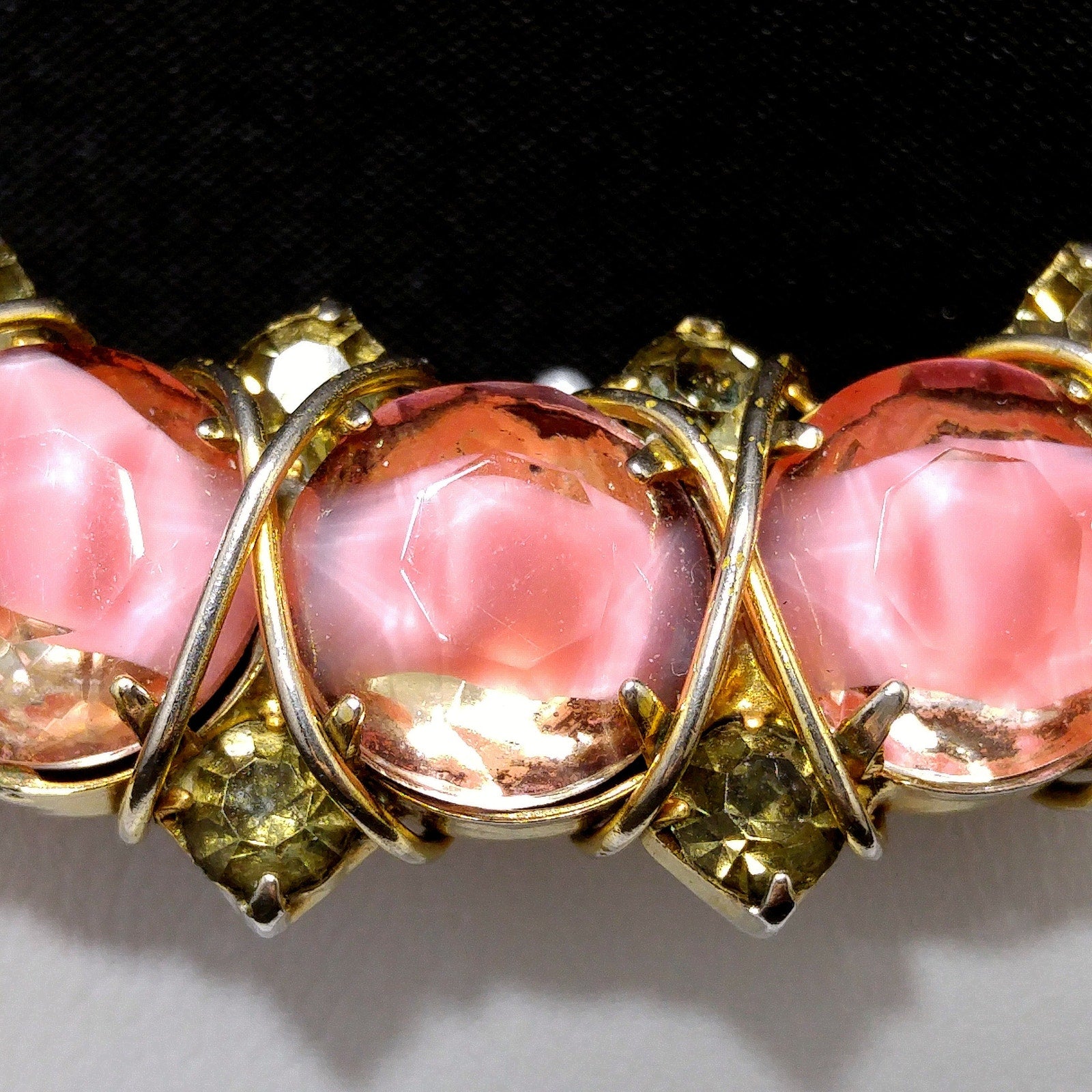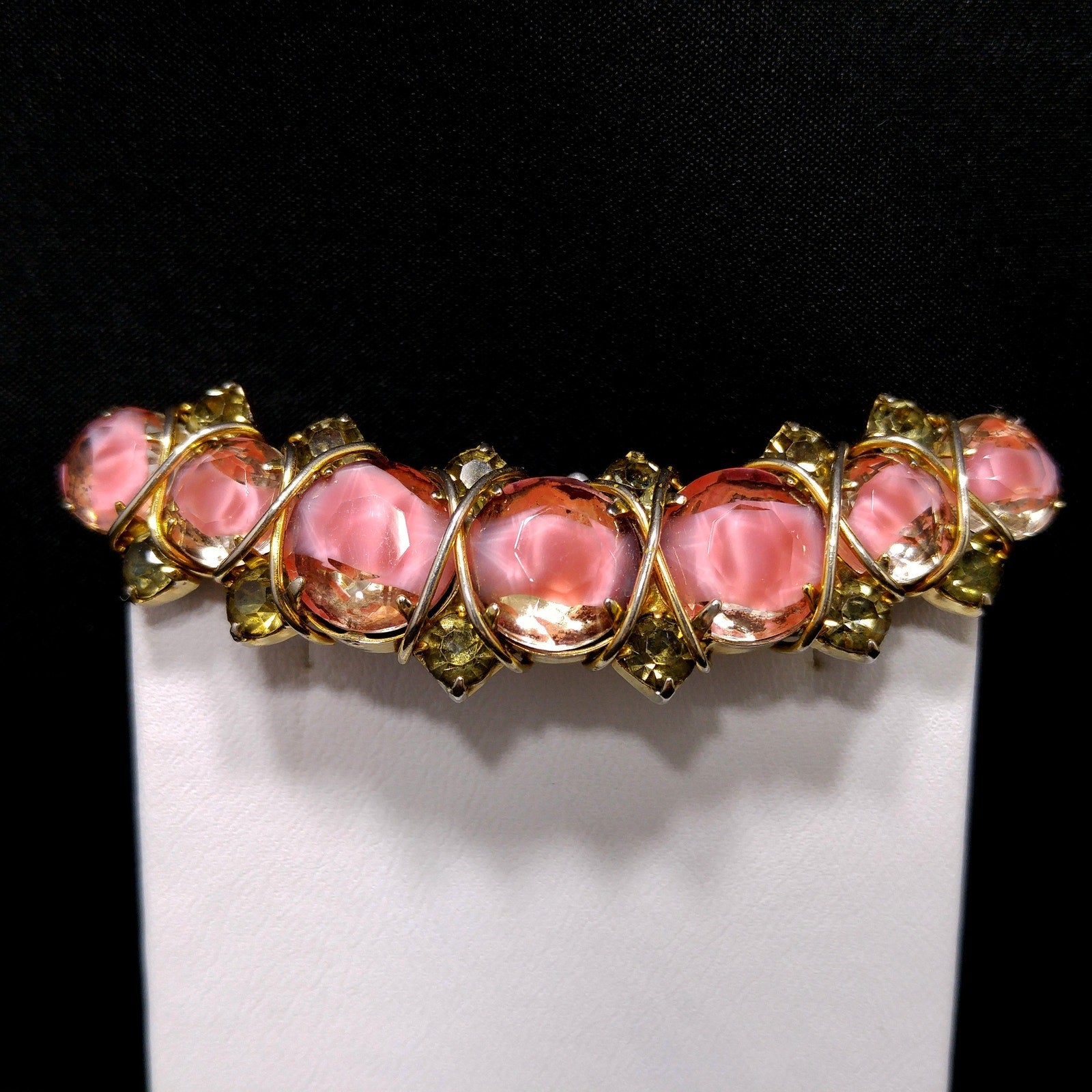 *Description: This is a beautiful brooch by Hattie Carnegie with pink art glass and gray rhinestones which have been wire wrapped on a gold plated backing from the 1960s. The necklace that matches this brooch is a book piece in Costume Jewelry 101 by Julia C Carroll on page 139. She describes the stones like this: The stones look like dollops of pink ice cream embedded in faceted clear glass. Each pink stone is accented with x's of gold wire and small clear rhinestones in a "Hugs and Kisses" style. The brooch has a raised cartouche on the back with her name. I tested the gold surface and it tested at 10K gold surface metal. The pink art glass is actually a clear glass with the pink inside which gives the appearance of a flower petal or pink item inside the clear faceted glass. It is a unique brooch which is obviously designer quality. This would be a great addition to your vintage jewelry collection or make a great vintage gift!