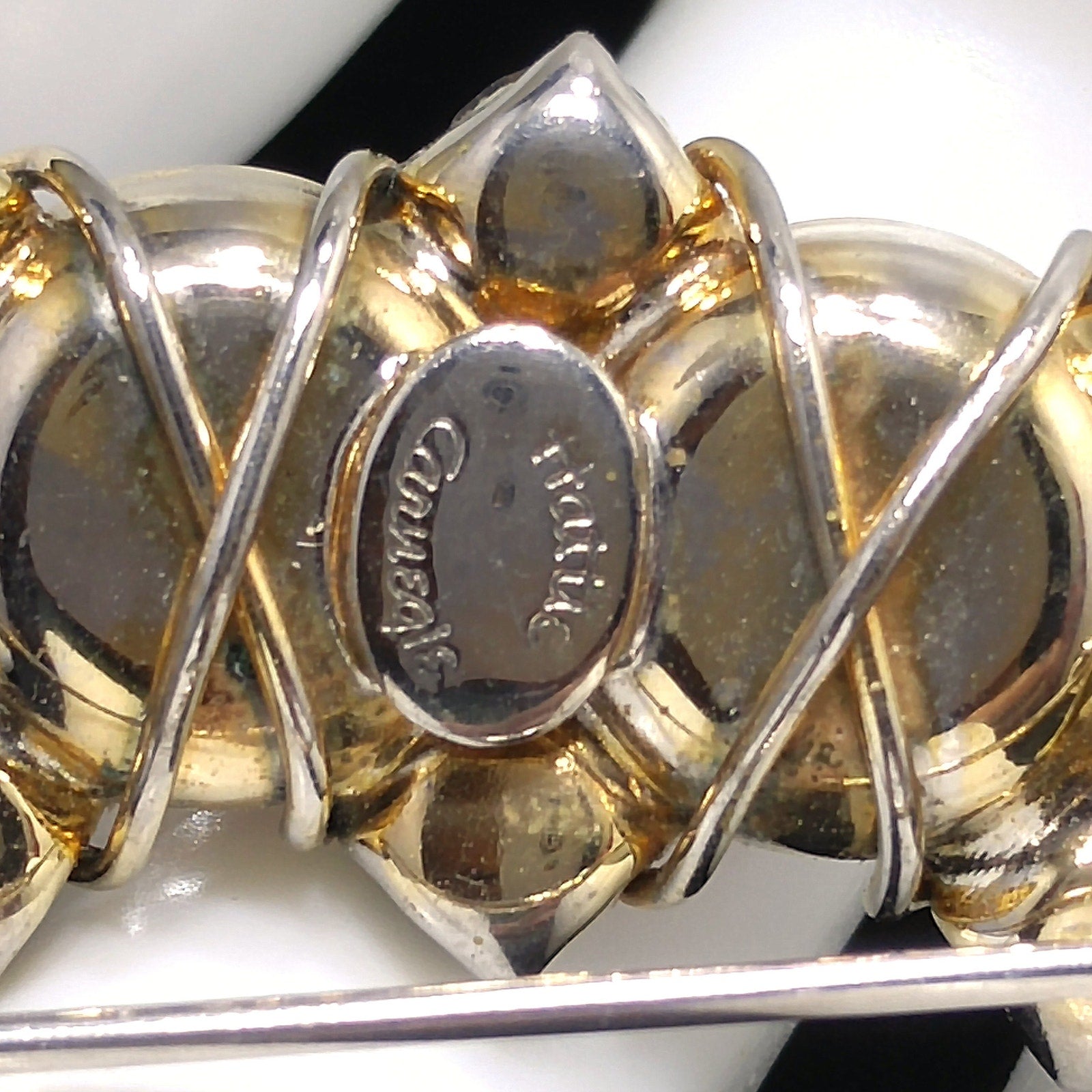 Hattie Carnegie was born in 1886 and began marketing jewelry in 1939 to coordinate with her fashions. Many talented artists, under her direction, designed Carnegie jewelry. In addition to themed collections, she made many beautiful more traditionally styled jewelry pieces featuring beautiful rhinestones. Hattie Carnegie died in 1956 but her company continued making jewelry until around 1979. The most common found mark is “Hattie Carnegie” in script on a cartouche.