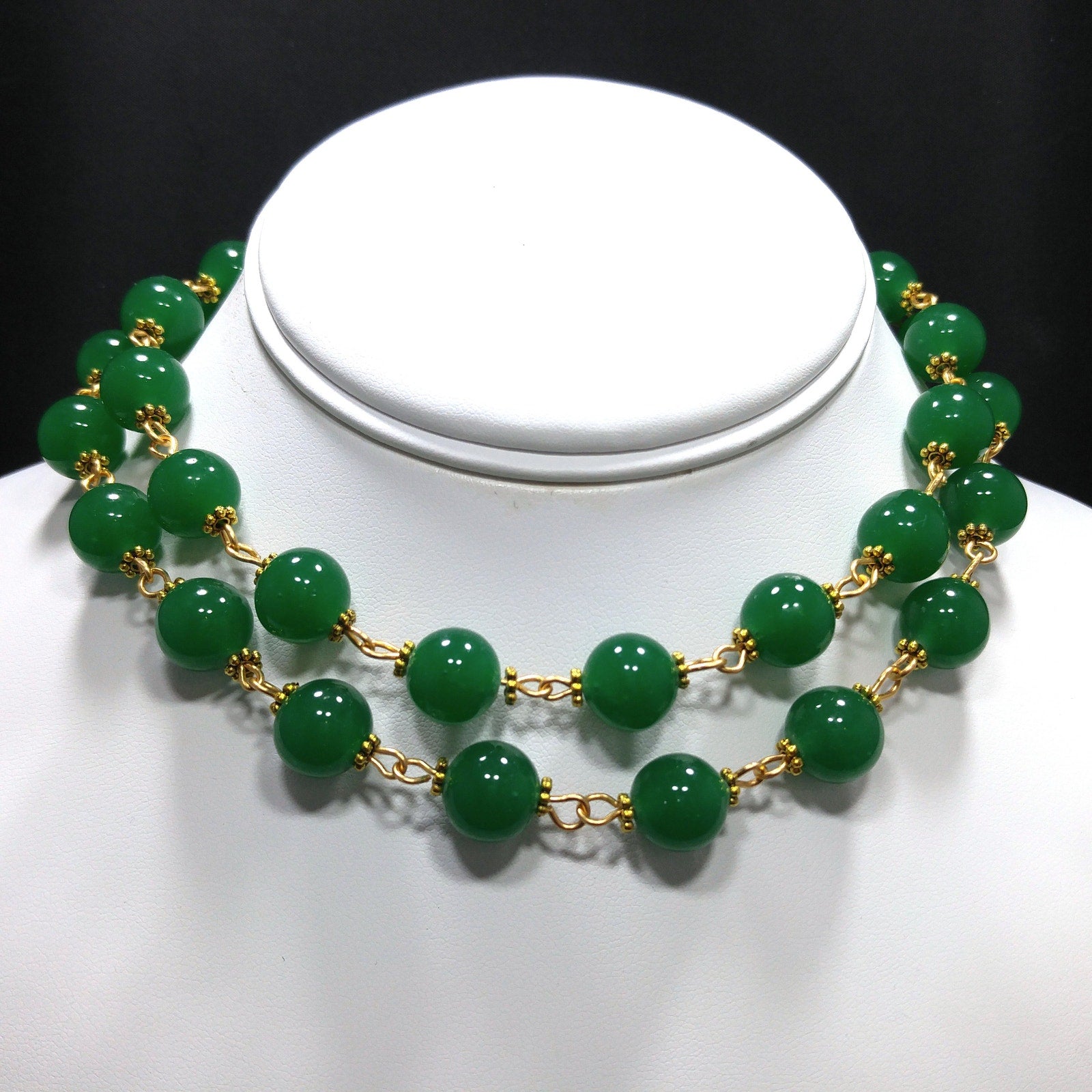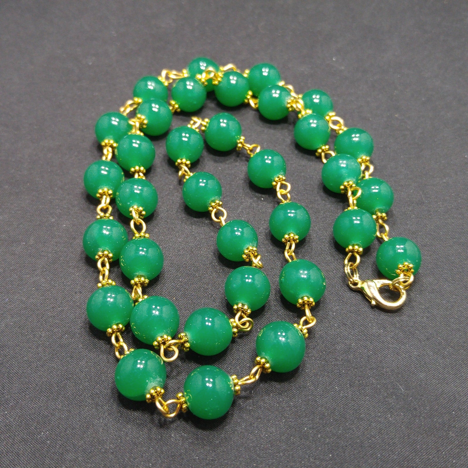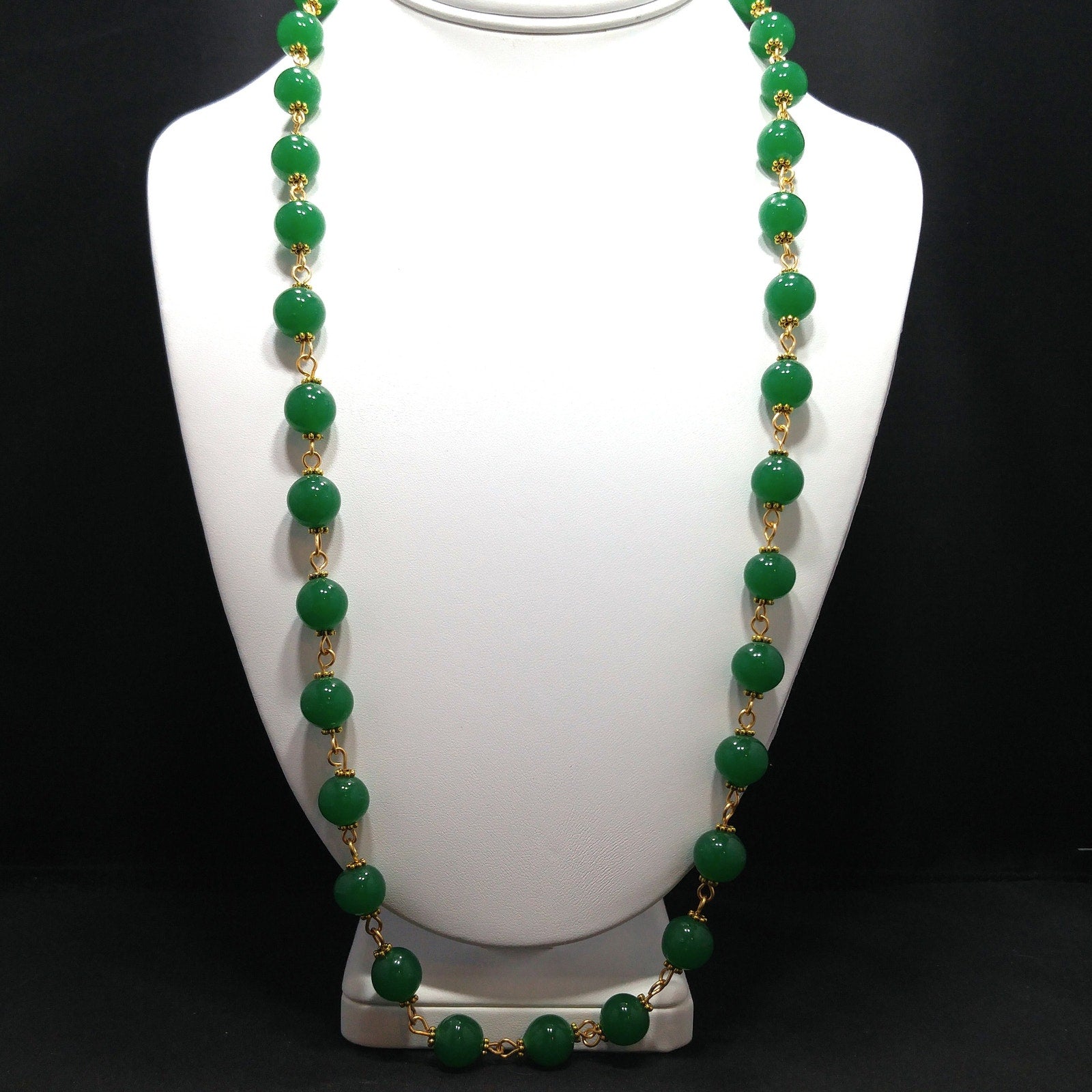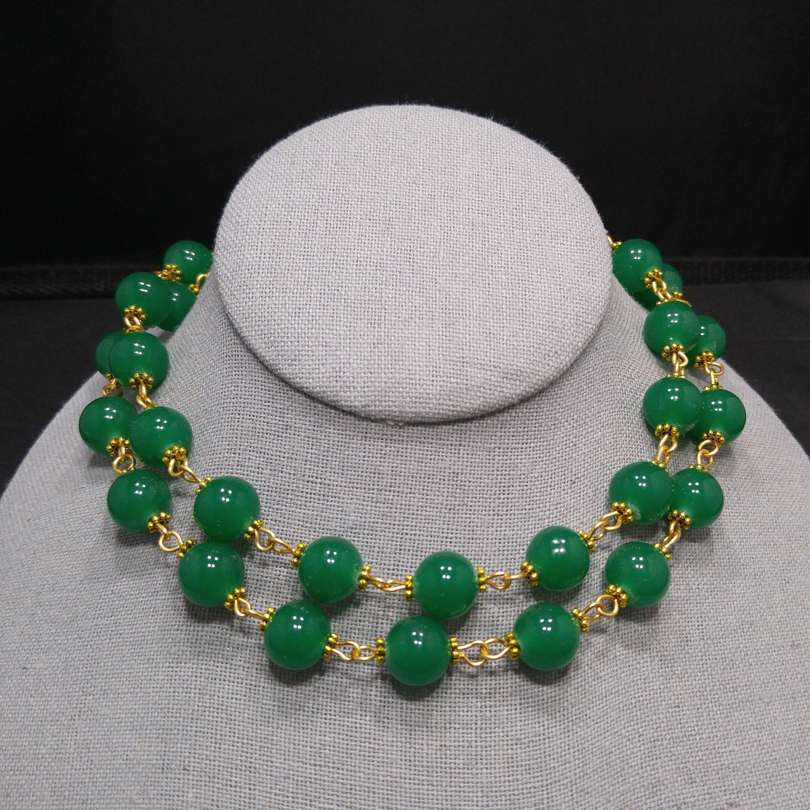*Description: These beads are ceramic glass coated hand-made beads from Japan and imported in the 1960s. They were on plain string so I wire wrapped them on golden brass tarnish resistant wire. They have a gold plated lobster clasp. The spacer beads are also vintage. There are 28 green Japan beads on this necklace. It would be a great necklace to wear on any occasion. The necklace will fit over your head or you may use the lobster clasp. The beads are breakable so be careful not to drop them. This would be a great addition to your vintage jewelry collection or make a great vintage gift!