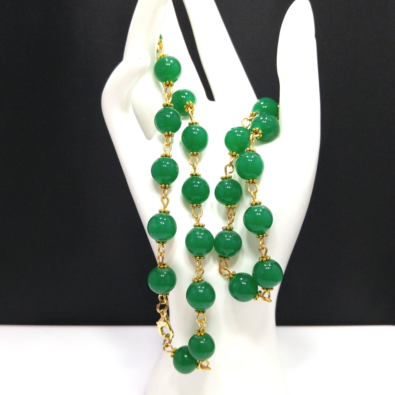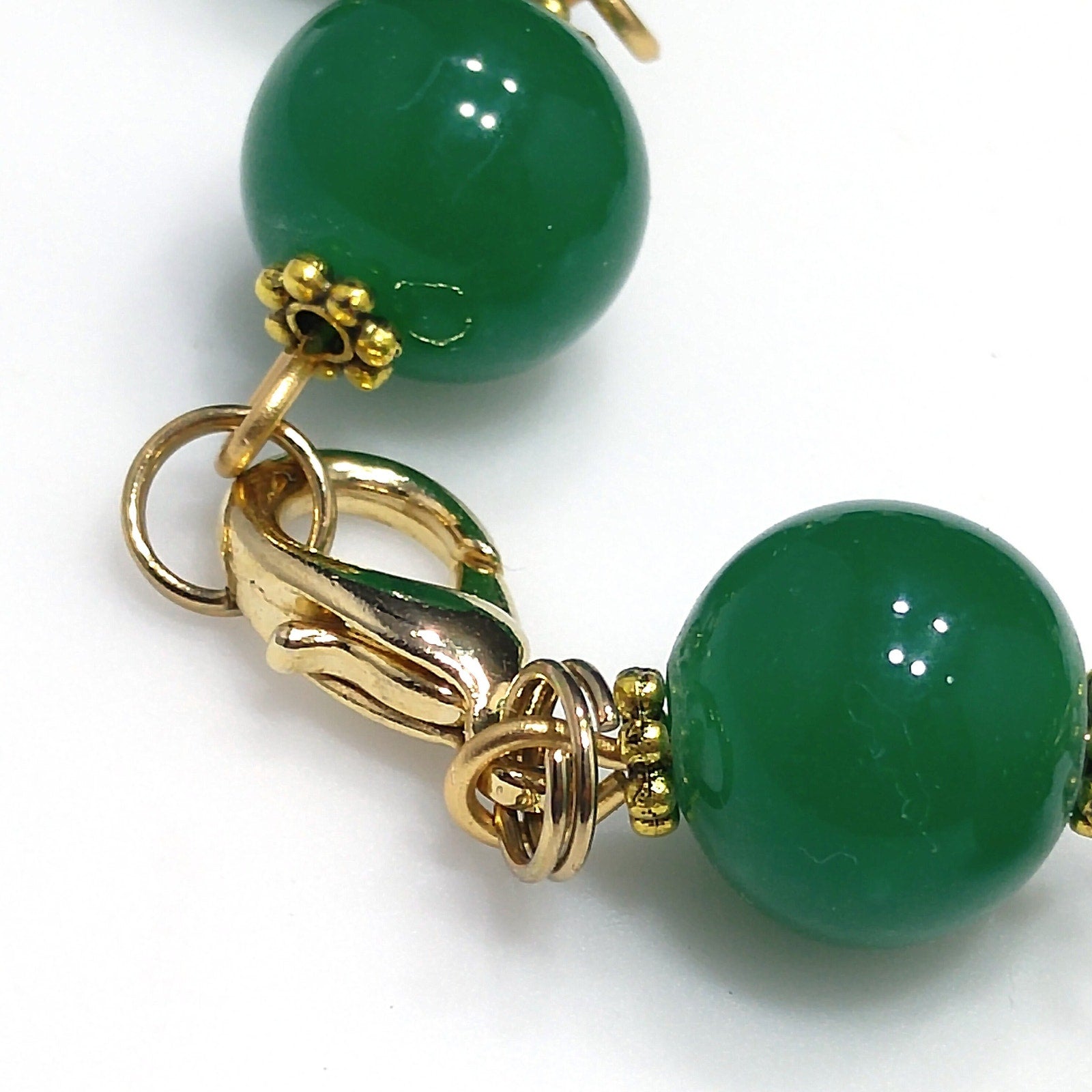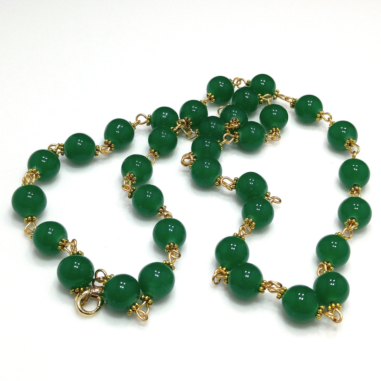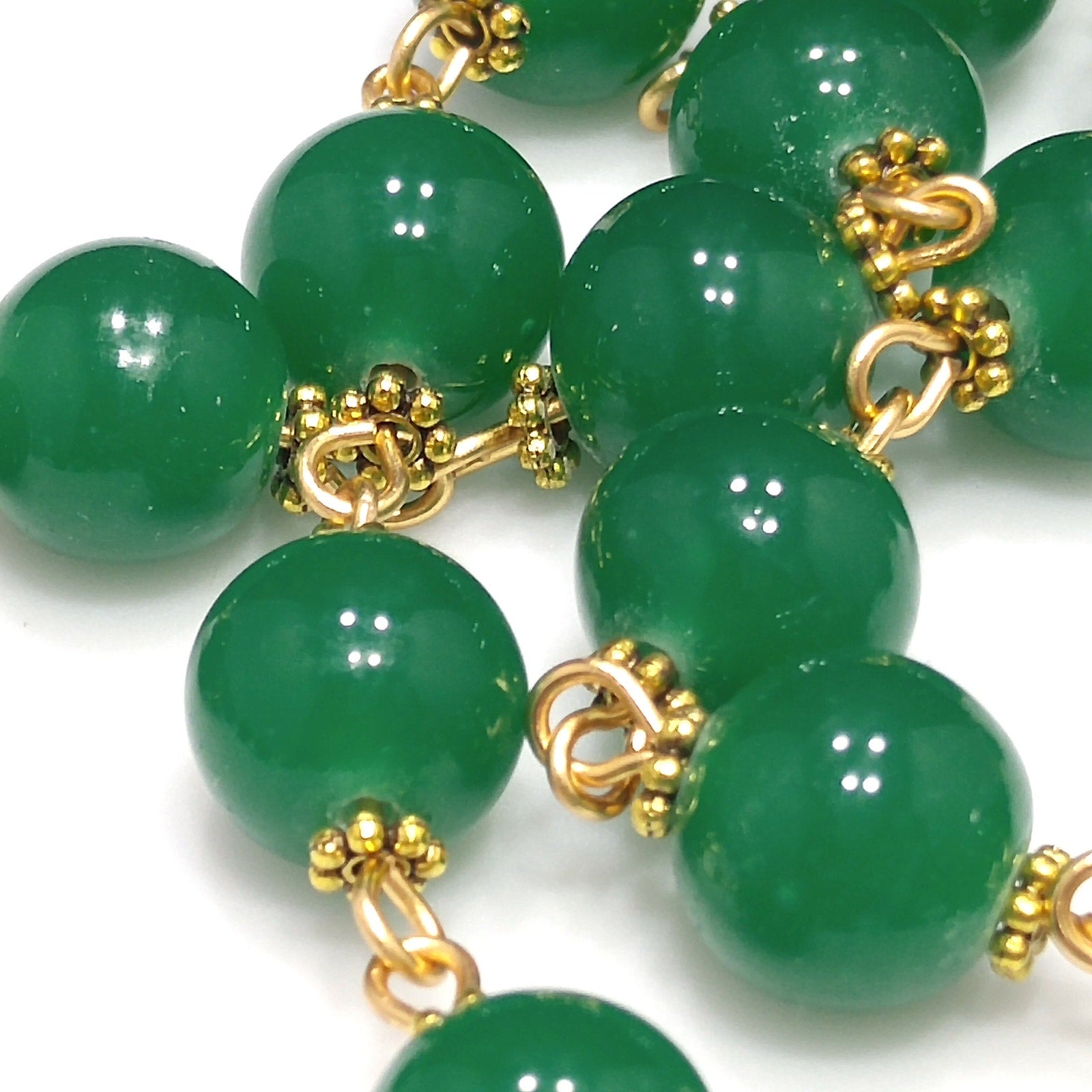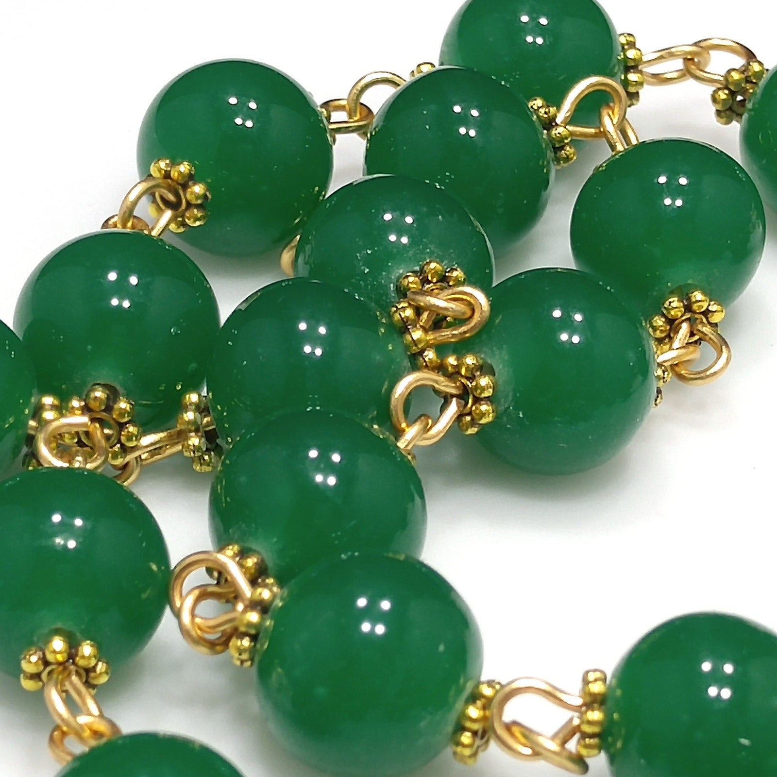 *Description: These beads are ceramic glass coated hand-made beads from Japan and imported in the 1960s. They were on plain string so I wire wrapped them on golden brass tarnish resistant wire. They have a gold plated lobster clasp. The spacer beads are also vintage. There are 28 green Japan beads on this necklace. It would be a great necklace to wear on any occasion. The necklace will fit over your head or you may use the lobster clasp. The beads are breakable so be careful not to drop them. This would be a great addition to your vintage jewelry collection or make a great vintage gift!