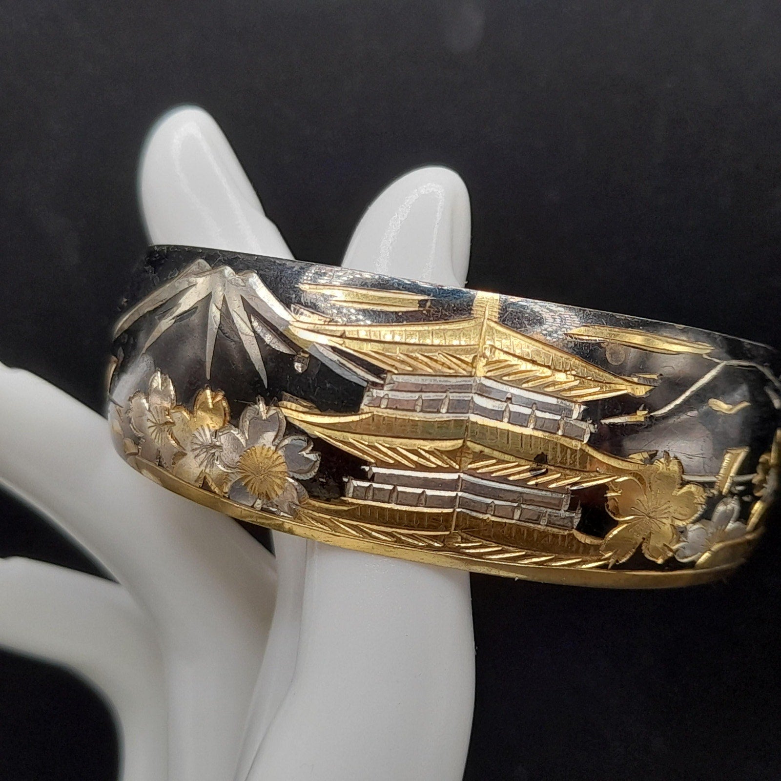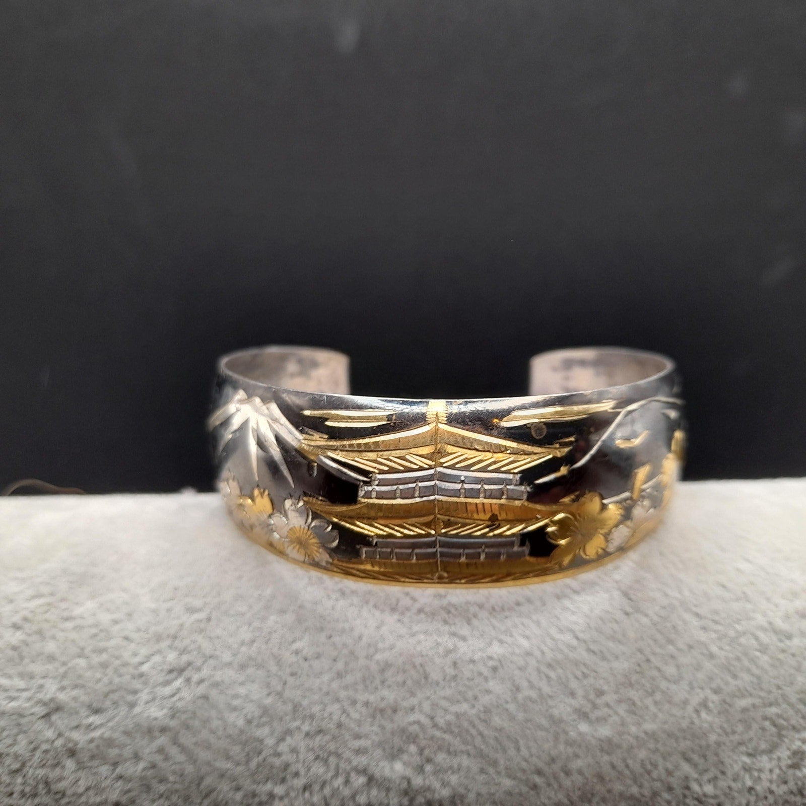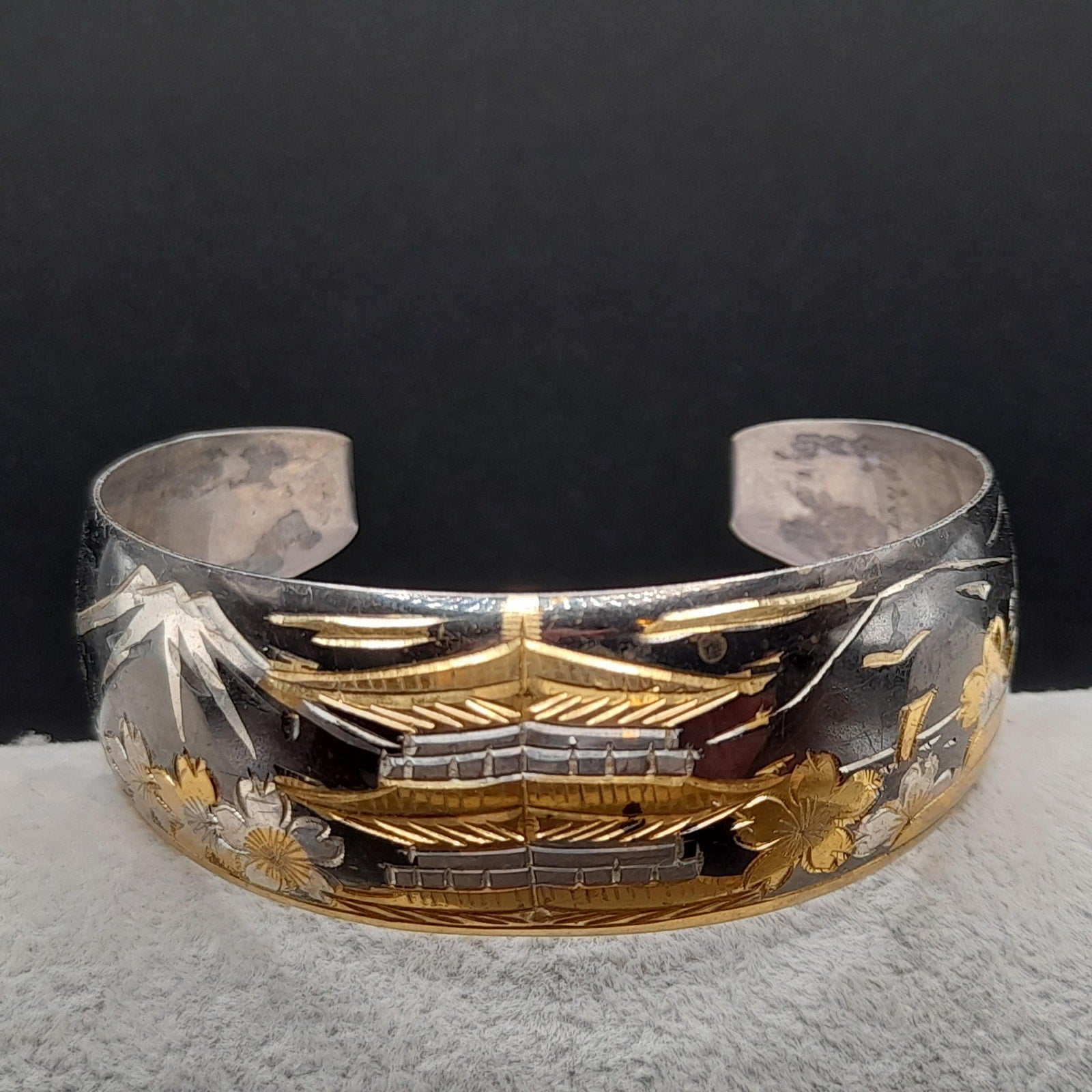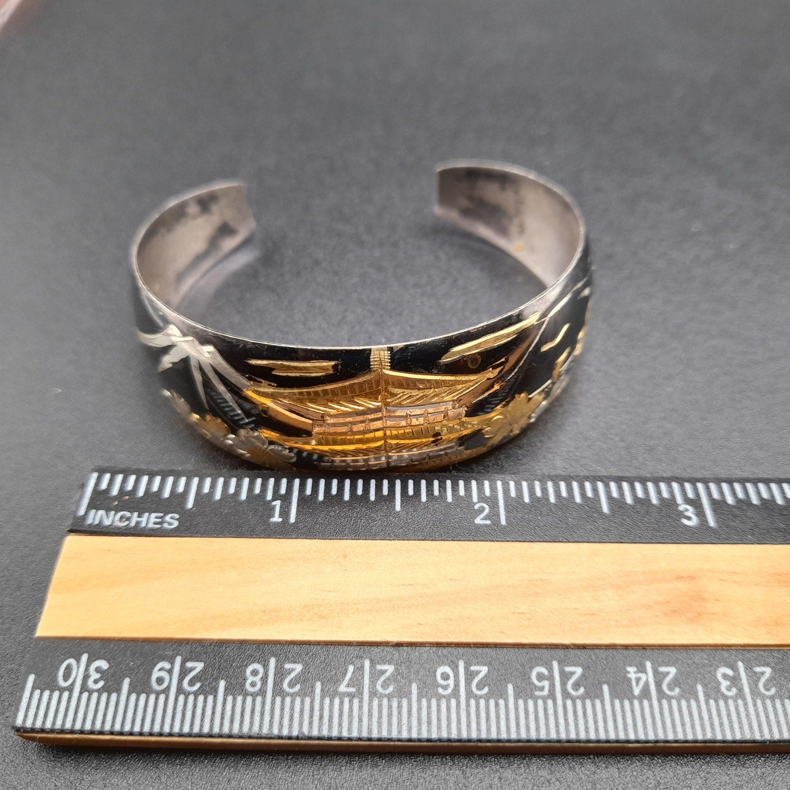 *Description: This is a beautiful Japanese vintage cuff sterling bracelet from the 1960s. The inside of the bracelet is stamped JAPAN STERLING. The cuff has damascene style Mt. Fuji Pagoda Japanese Scene Panorama around the sides. This would be a great addition to your vintage jewelry collection or make a great vintage gift!