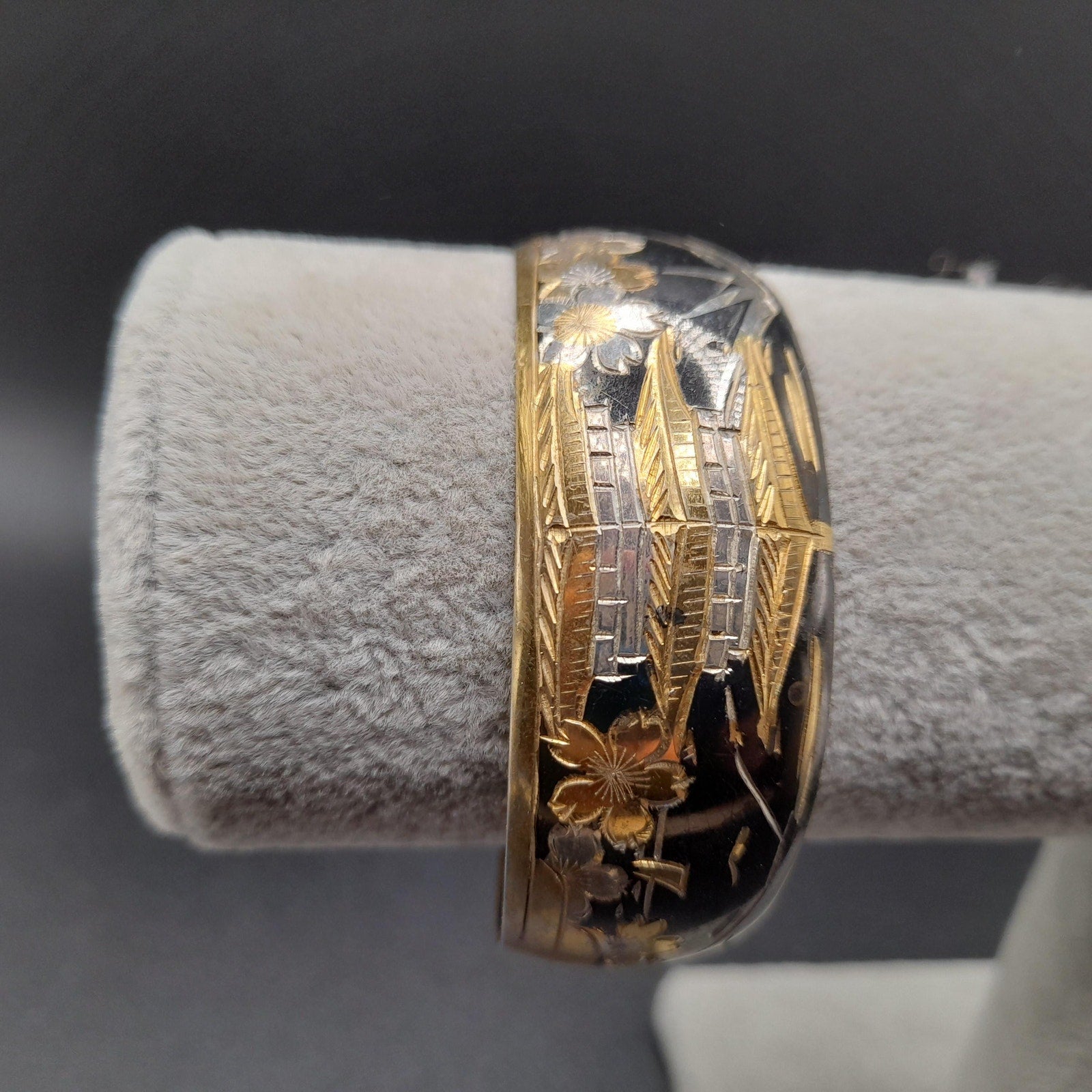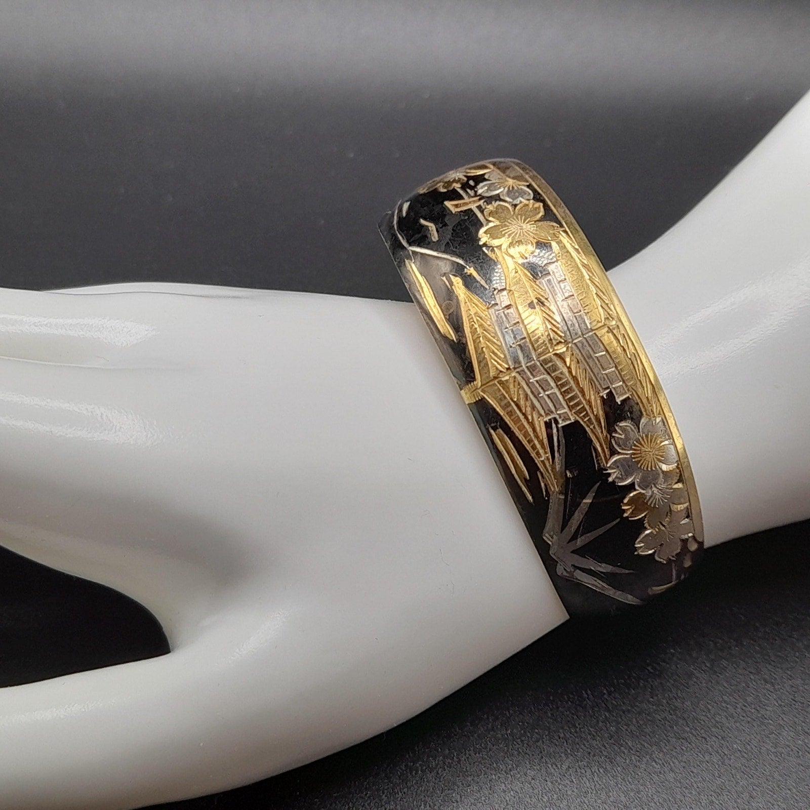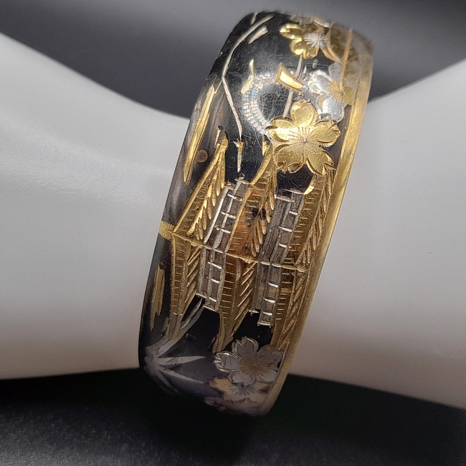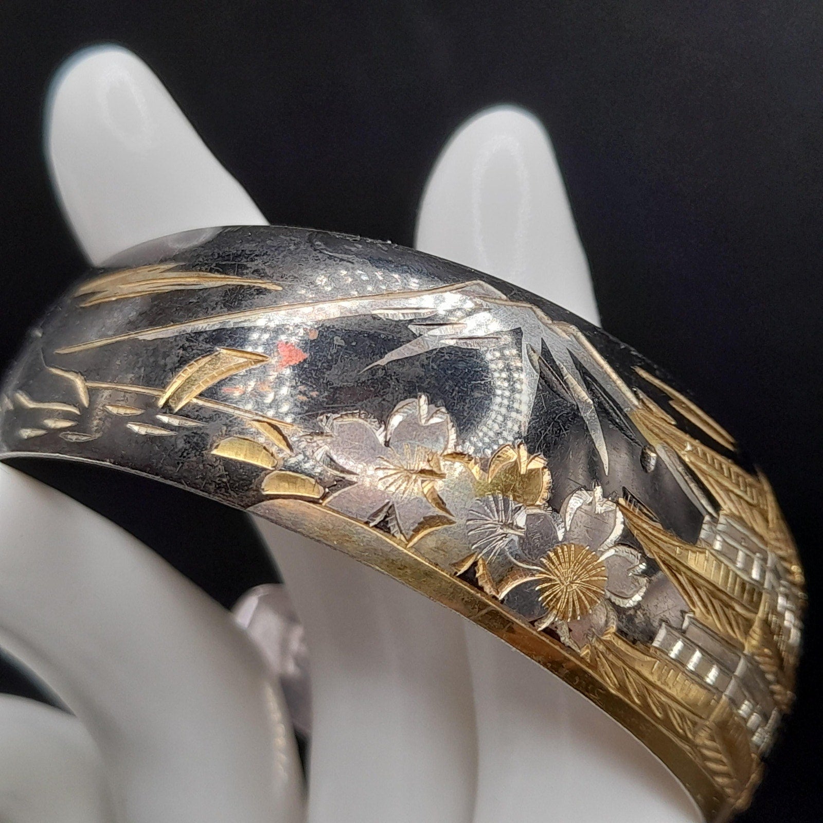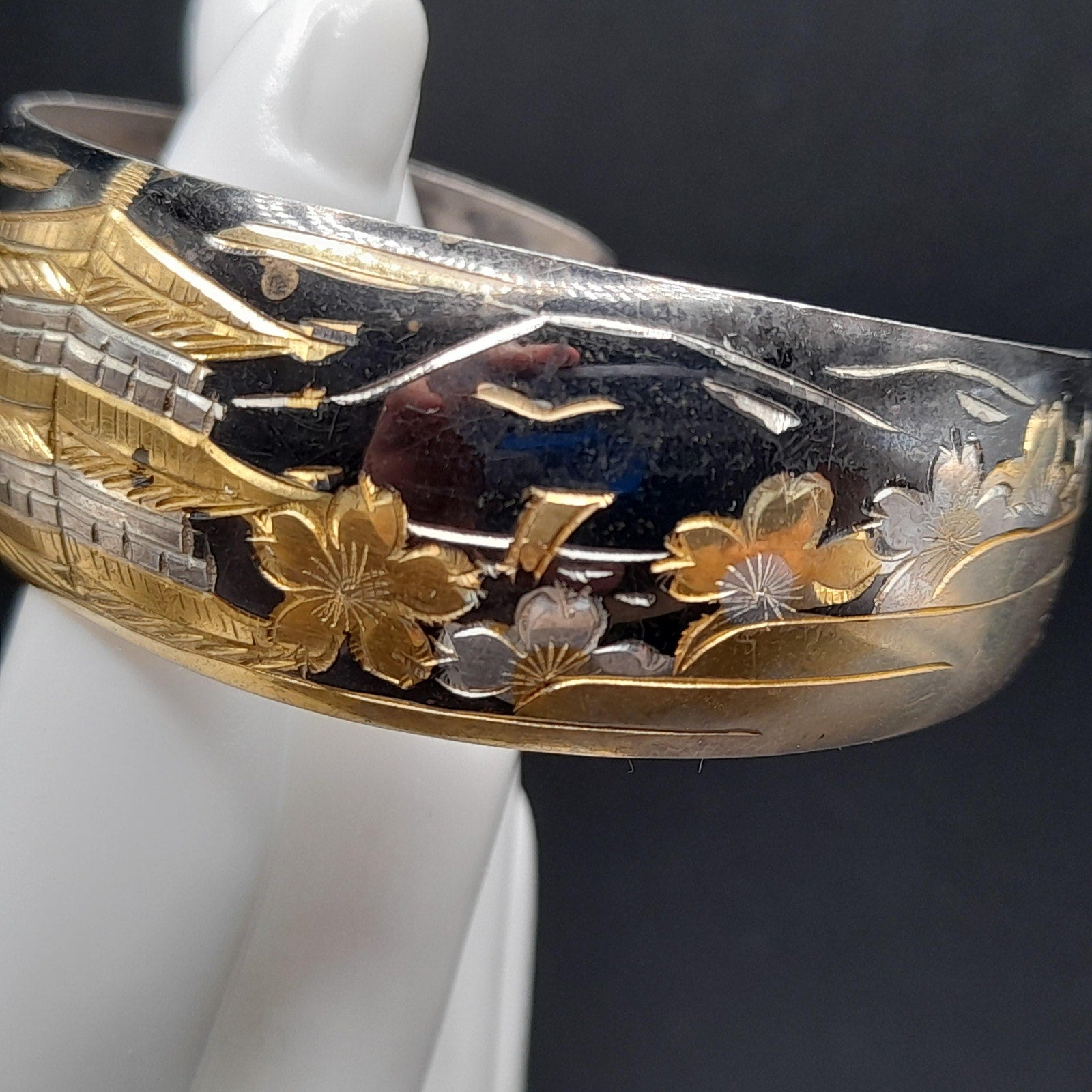 *Description: This is a beautiful Japanese vintage cuff sterling bracelet from the 1960s. The inside of the bracelet is stamped JAPAN STERLING. The cuff has damascene style Mt. Fuji Pagoda Japanese Scene Panorama around the sides. This would be a great addition to your vintage jewelry collection or make a great vintage gift!