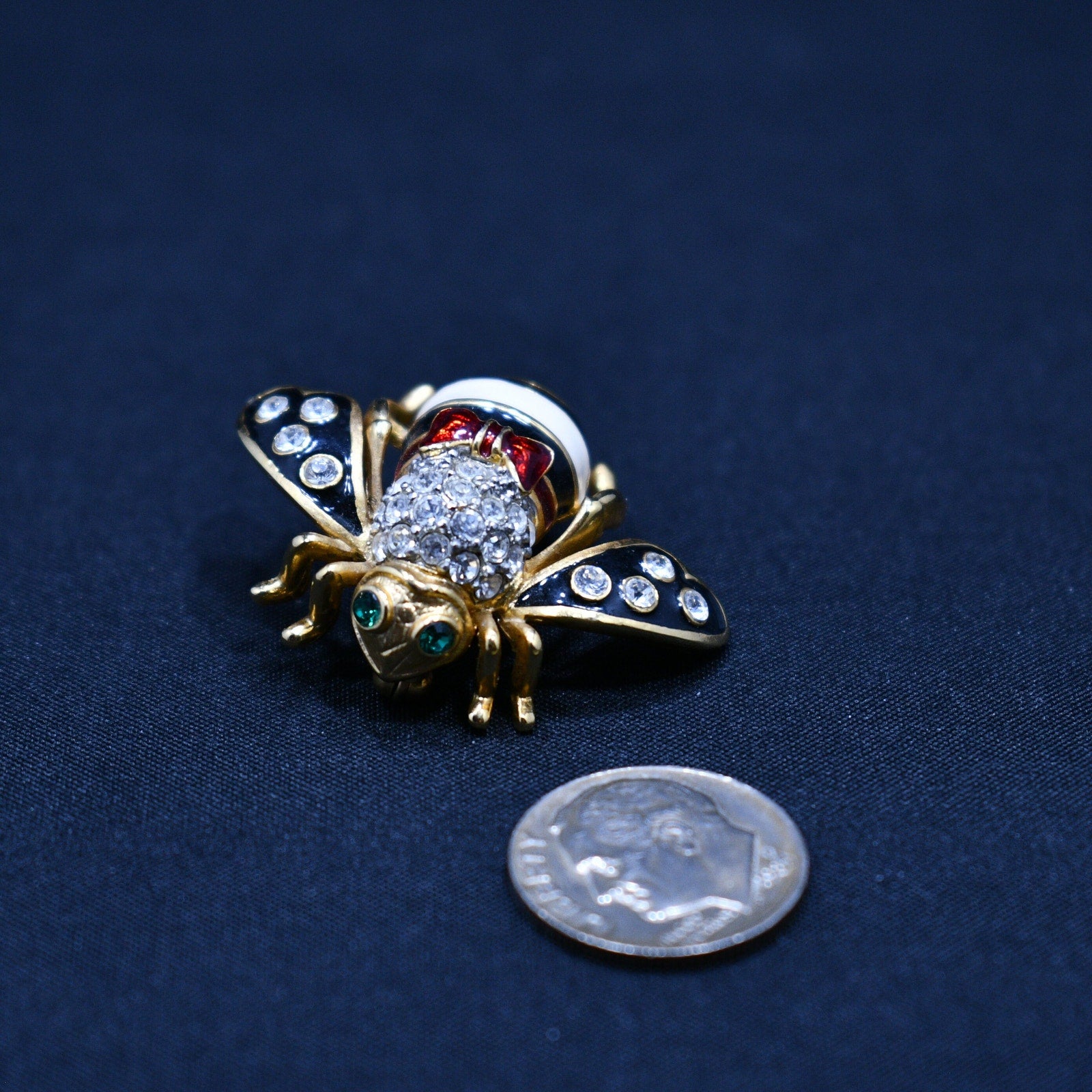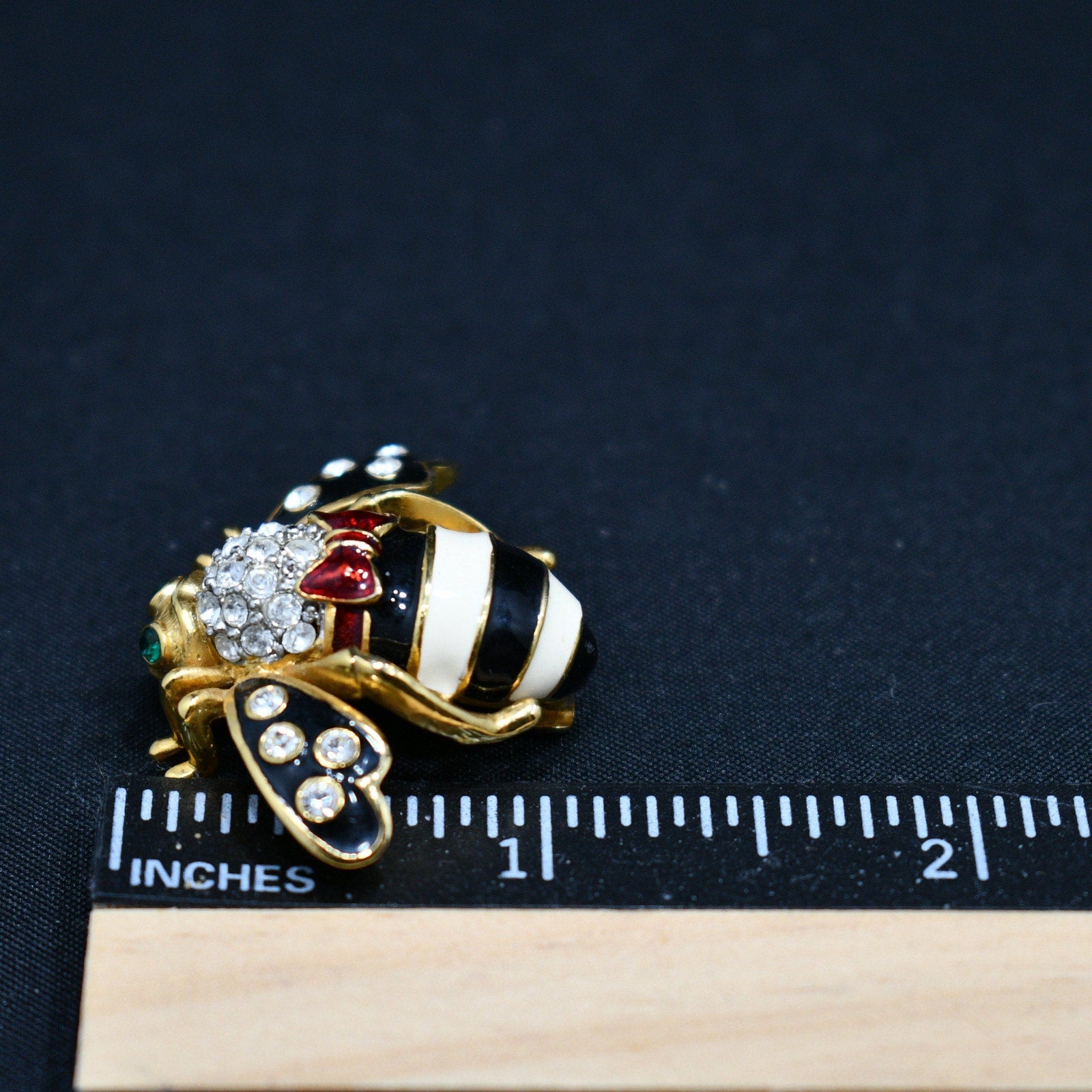 *Description: This is a great Joan Rivers bee brooch in black, white, and red enamel with clear rhinestones and two green rhinestone eyes from the 1990s. This great bee brooch by Joan Rivers is very collectible and is gold plated. This would be a great addition to your vintage jewelry collection or make a great vintage gift!