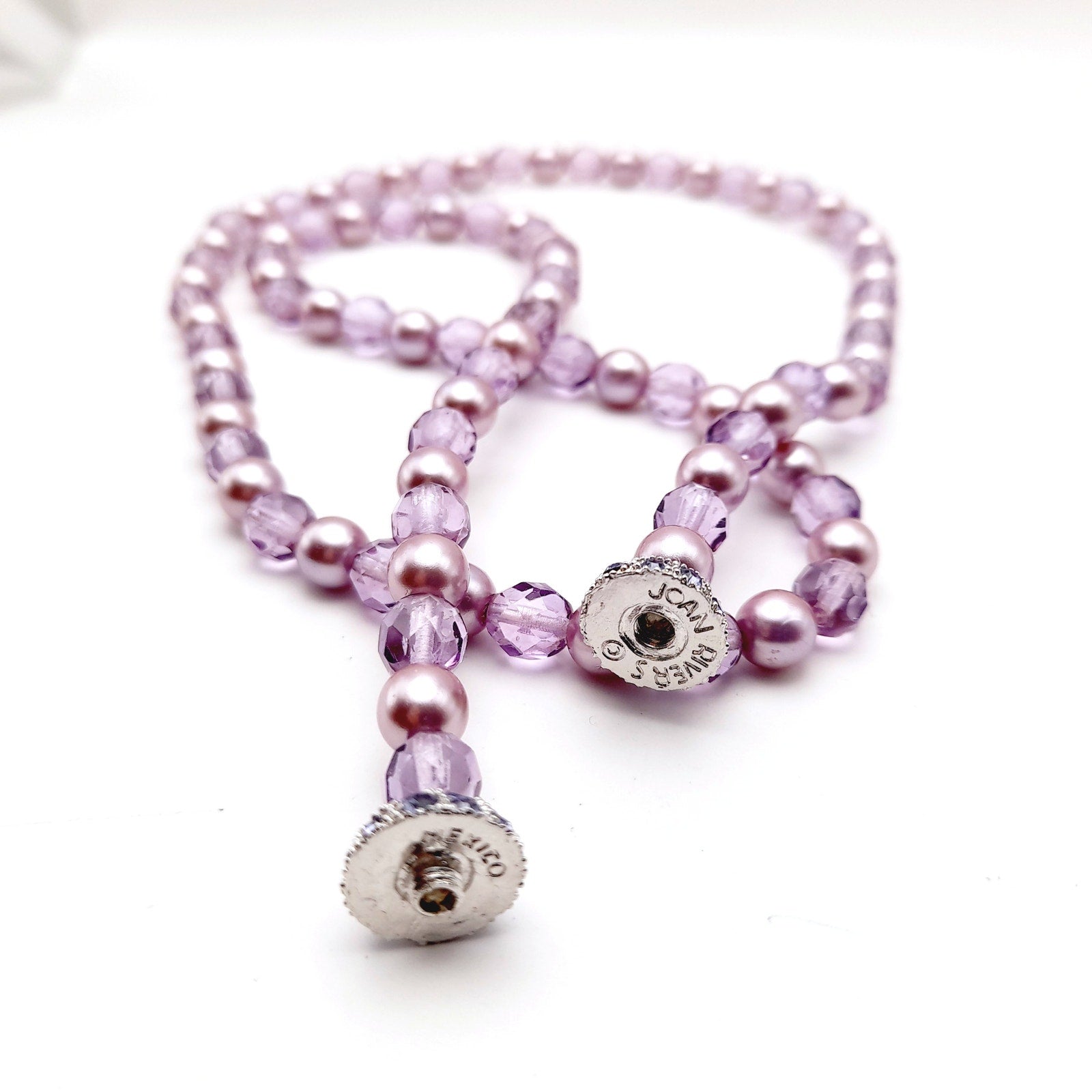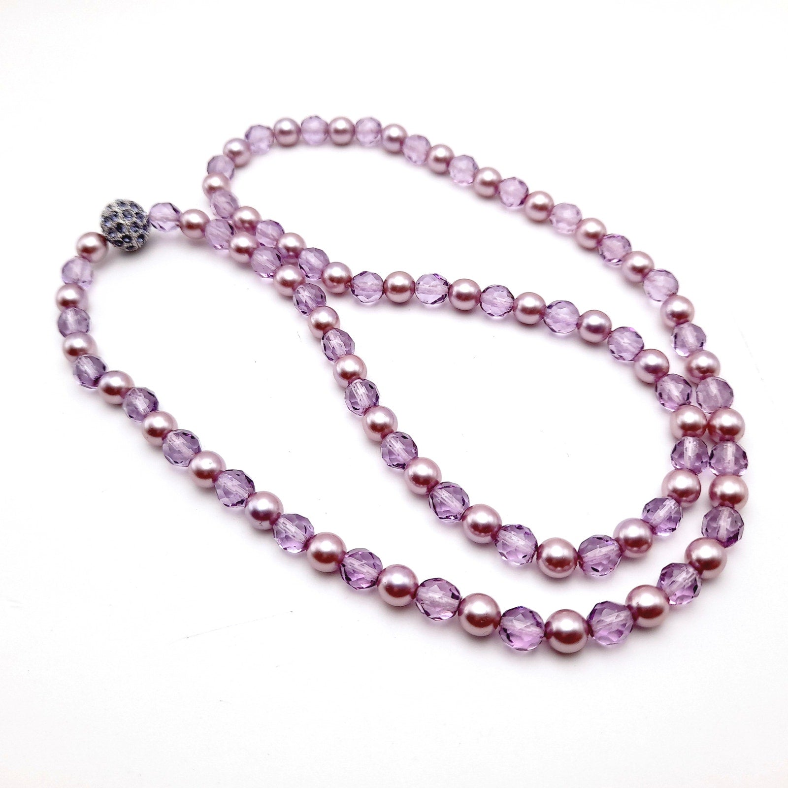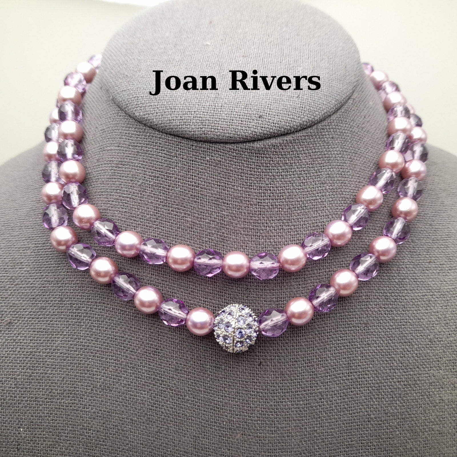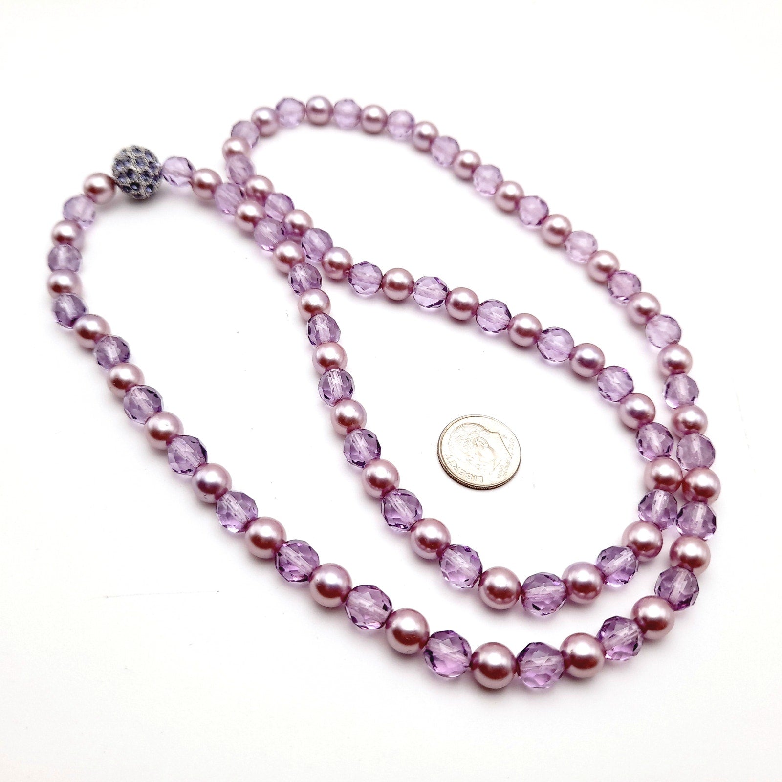Elegant and timeless, this Joan Rivers vintage beaded necklace features luminous lavender glass pearls and sparkling lavender crystal beads, finished with a beautiful rhinestone-embellished screw clasp. Measuring 30 inches long, this strand is versatile enough to wear long or doubled for a layered look.