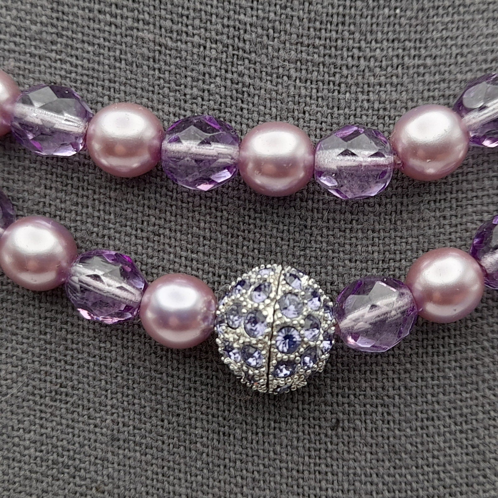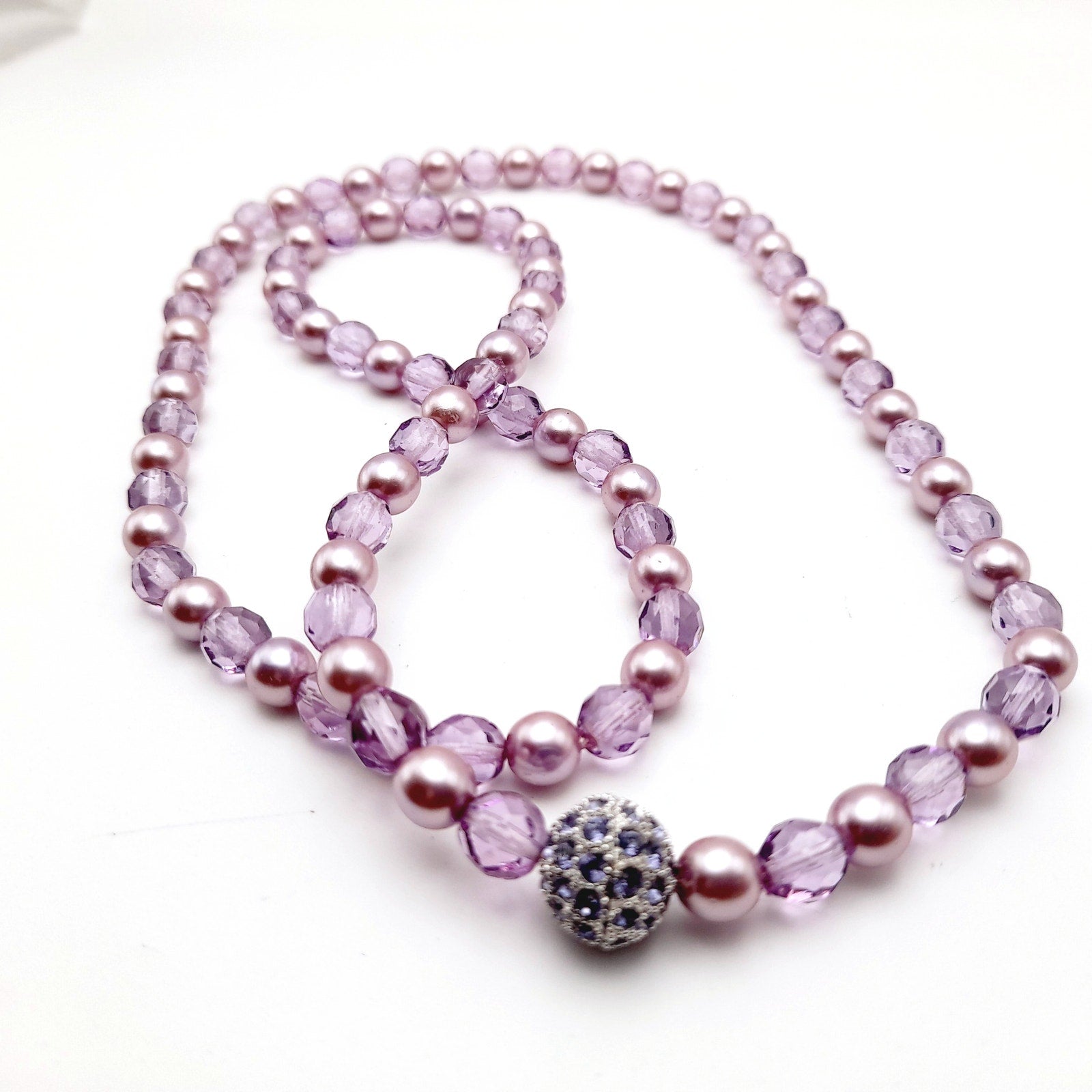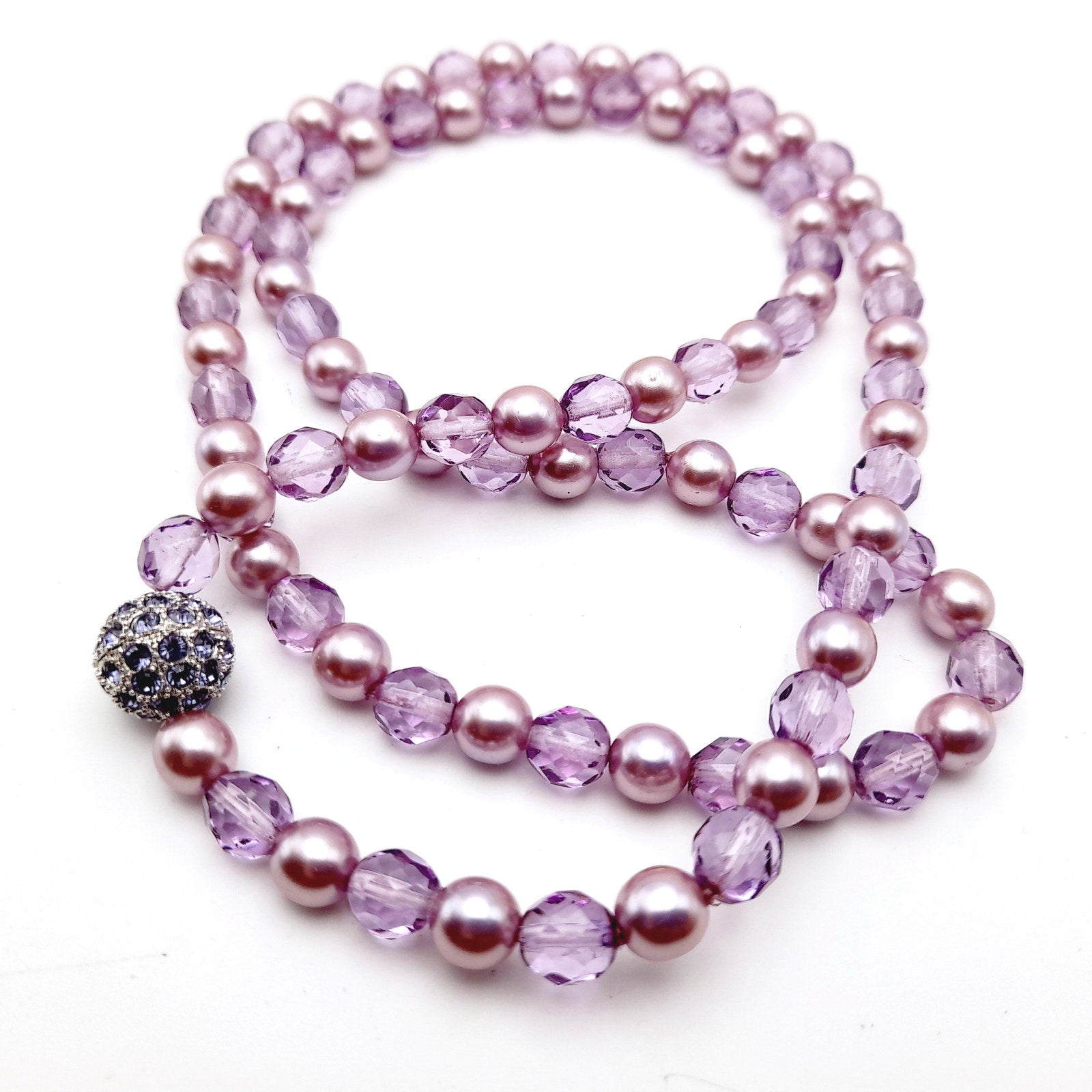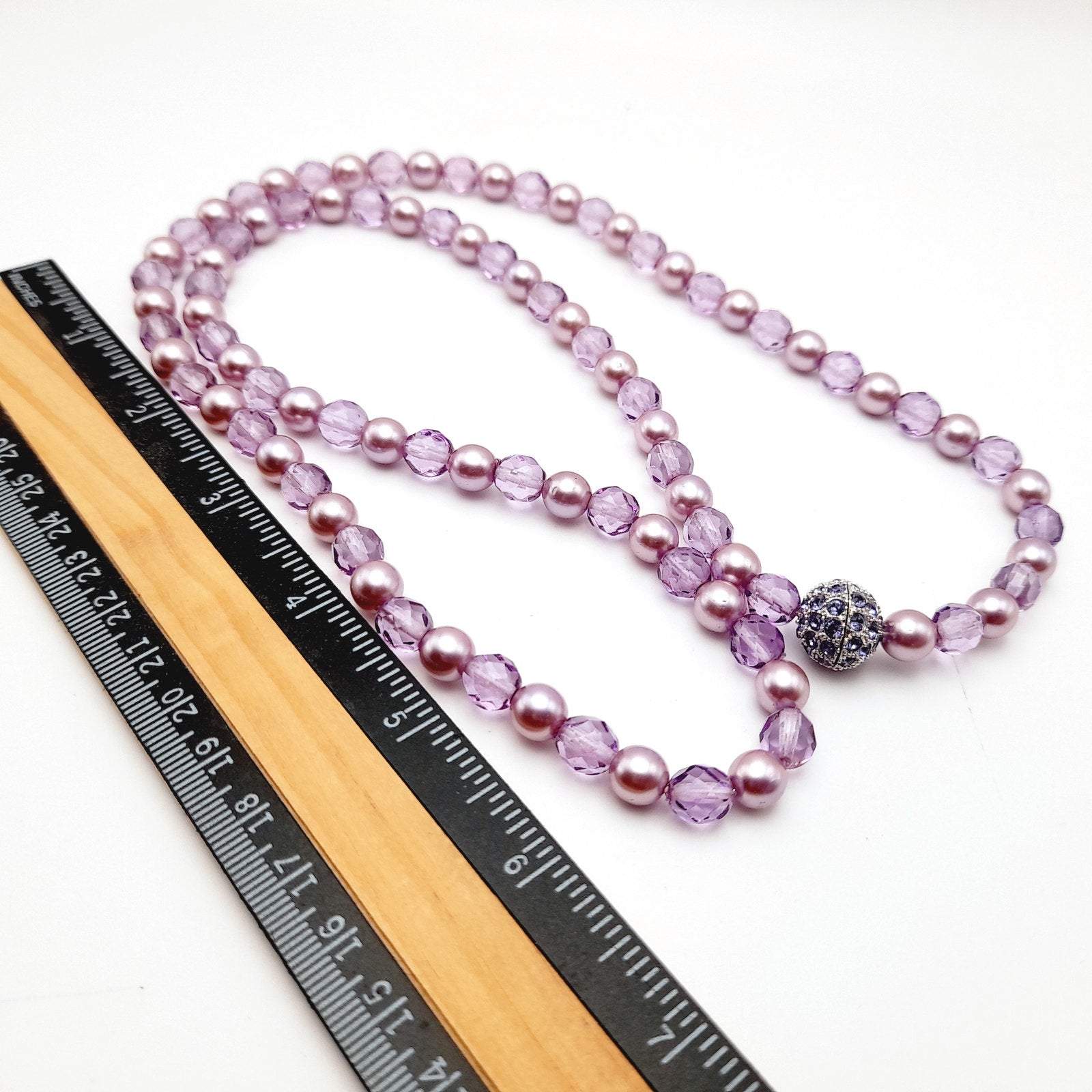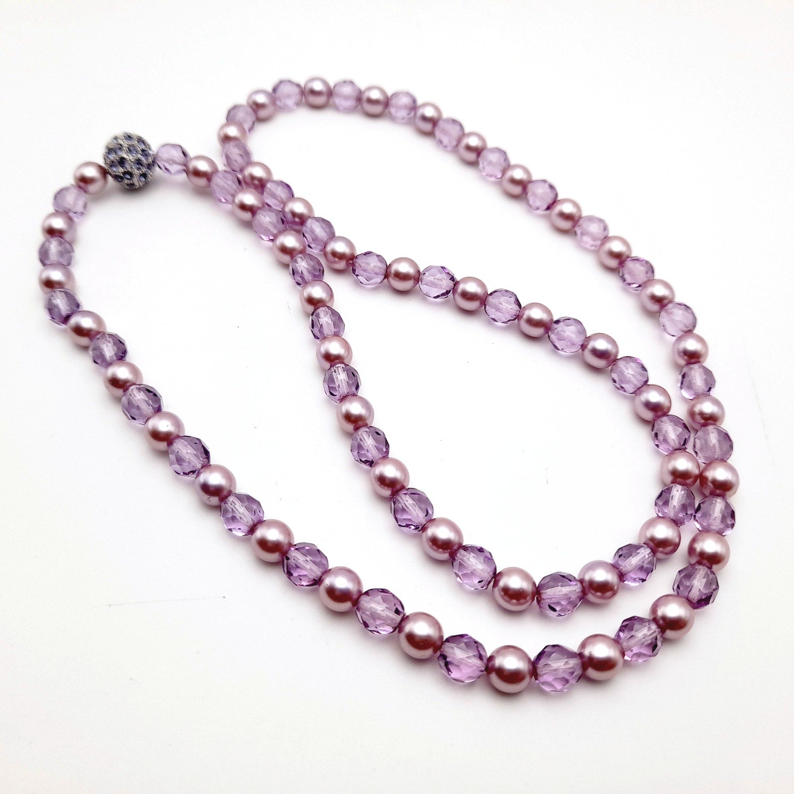 Vintage Joan Rivers Lavender Glass Pearls Crystal Beaded Necklace, Rhinestone Screw Clasp