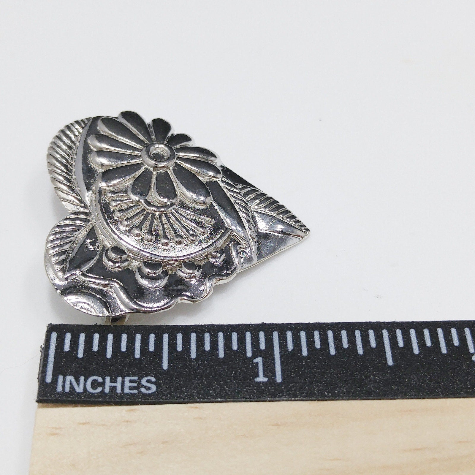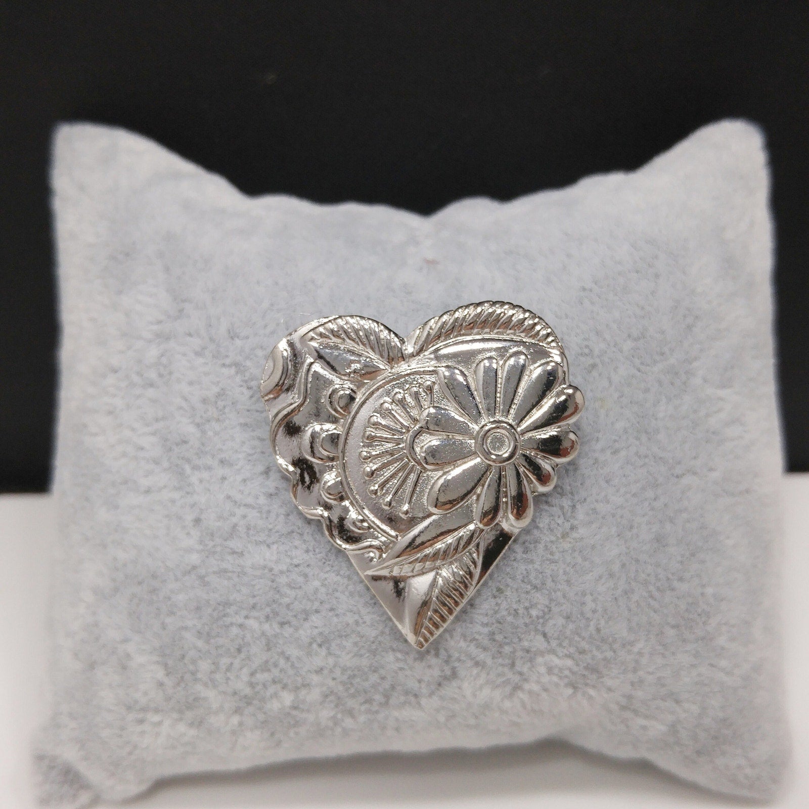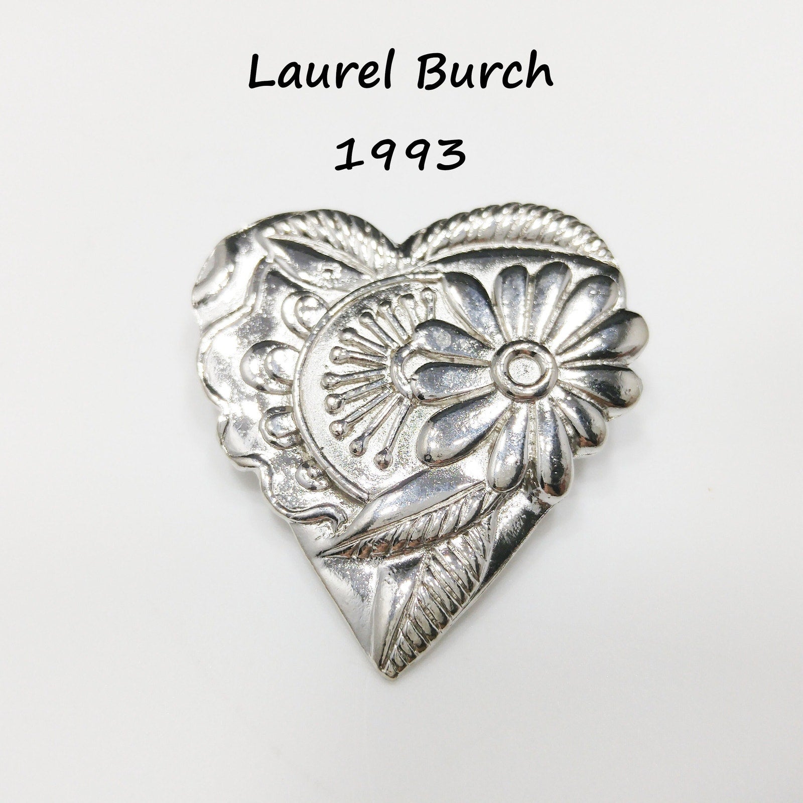 *Description: This is a beautiful Laurel Burch floral heart brooch in all silver tone from 1993. Within the heart are several flowers which are slightly raised within the design. The date is on the back of the brooch along with the artist's signature. This would be a great addition to your vintage jewelry collection or make a great vintage gift!