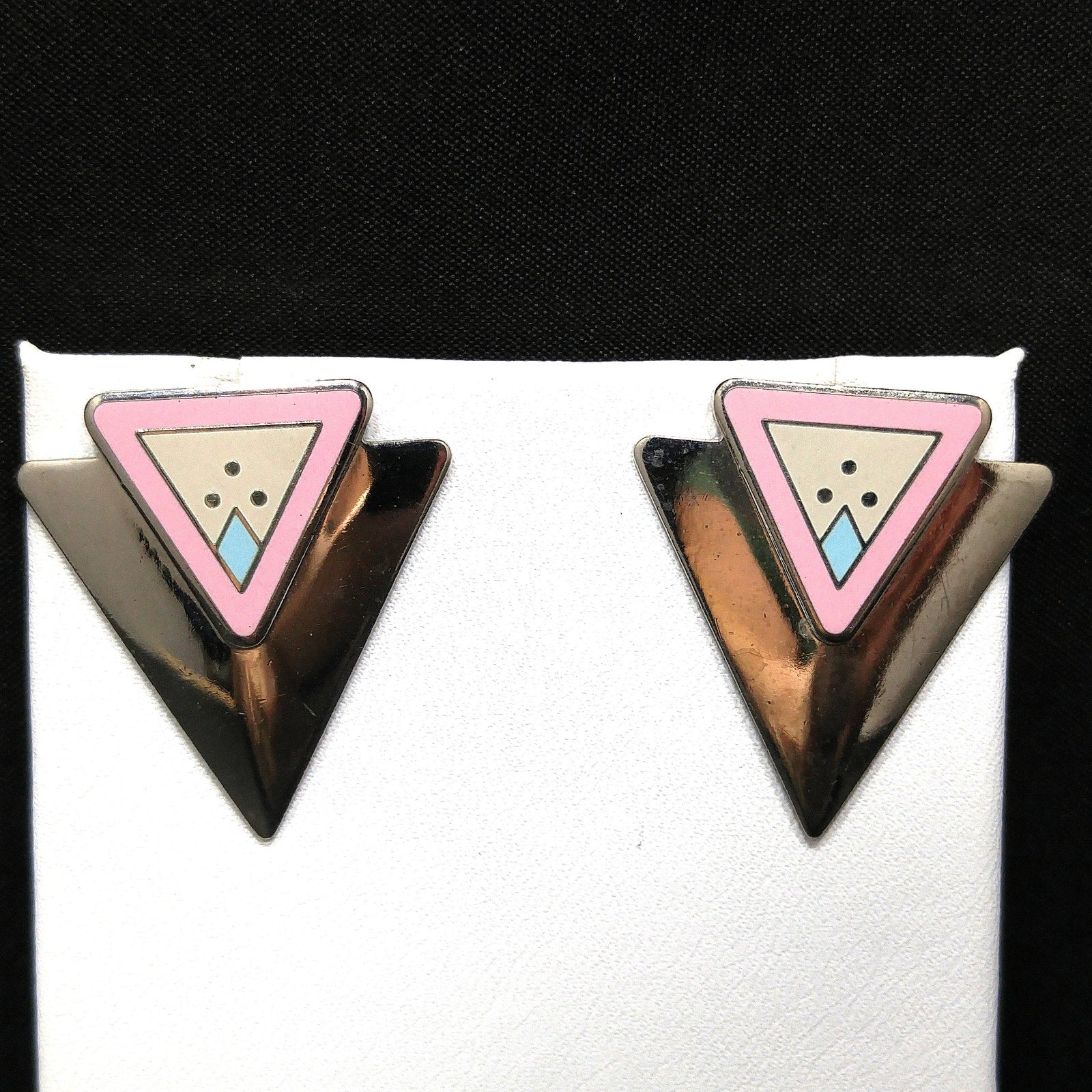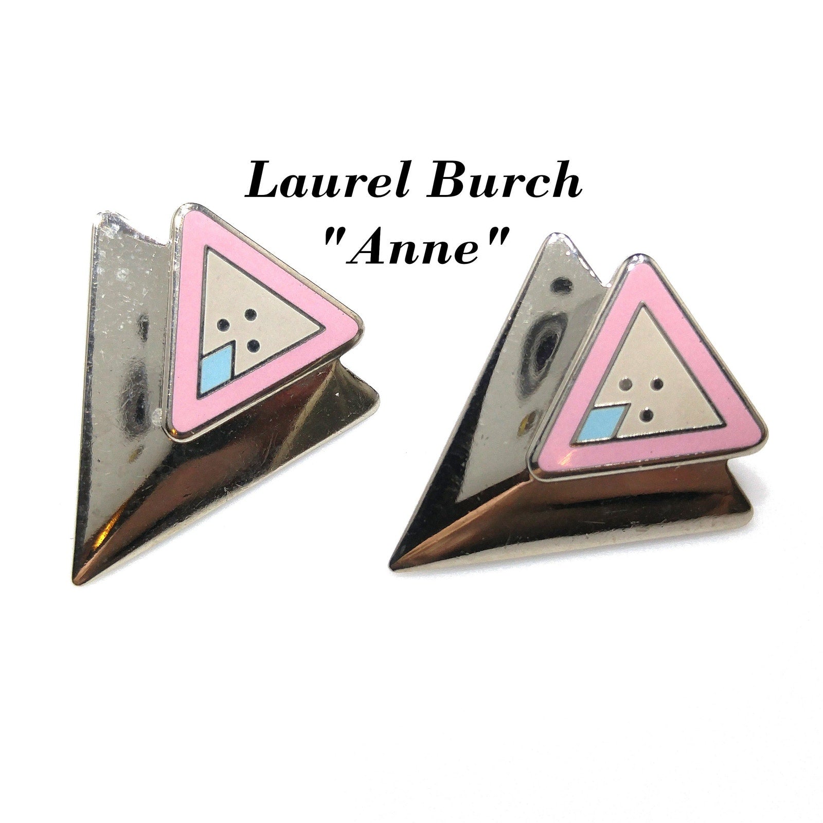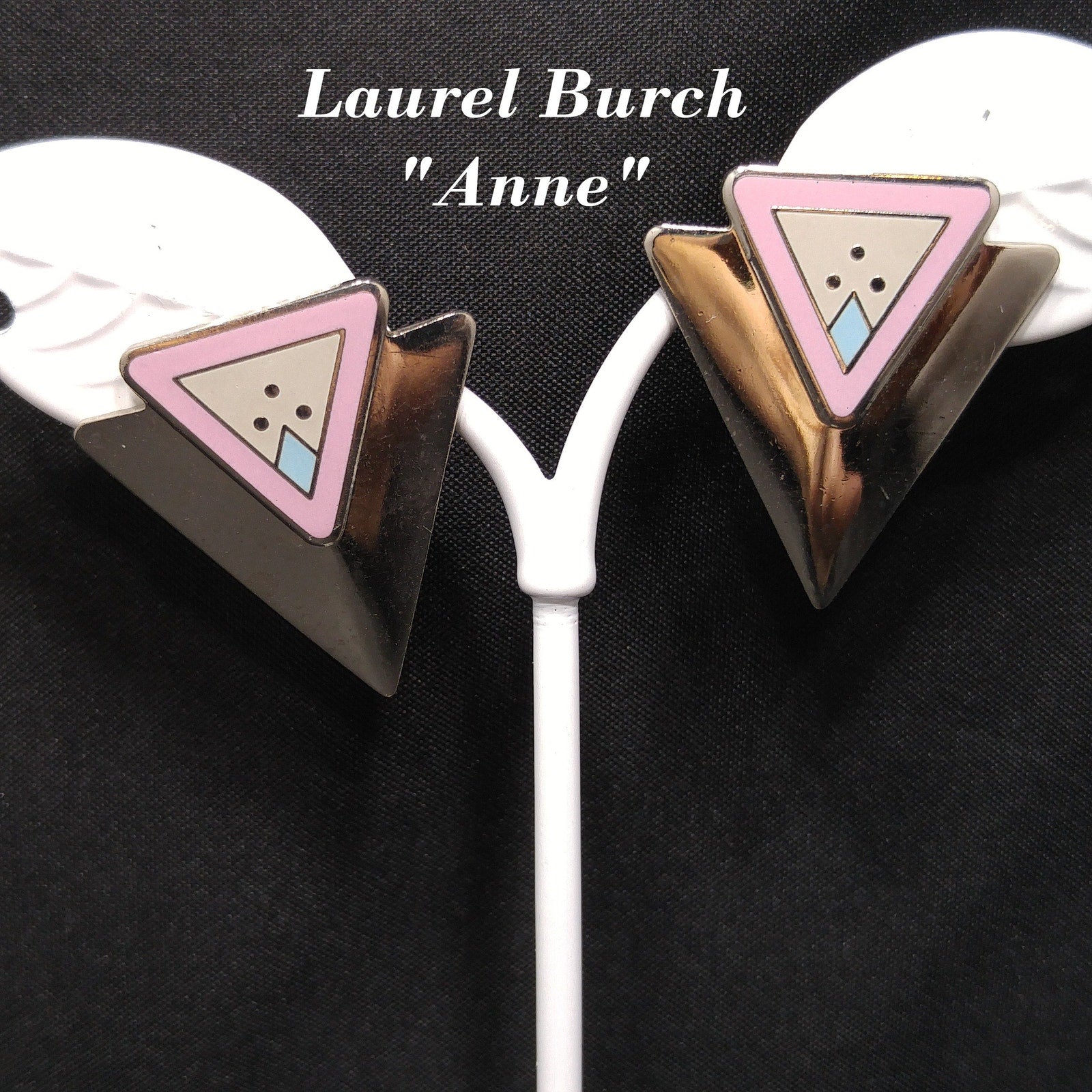*Description: This is a great pair of Laurel Burch triangular earrings entitled "ANNE" with very reflective rhodium plating, silver tone, and enamel in pink, beige, and light blue; all on the smaller triangle from the 1980s. The larger triangle is silver reflective plating and anything you see on the photos are reflections of my shirt, camera, etc. The smaller triangle is all cloisonné and enamel is soft pastel colors. This would be a great addition to your vintage jewelry collection or make a great vintage gift!