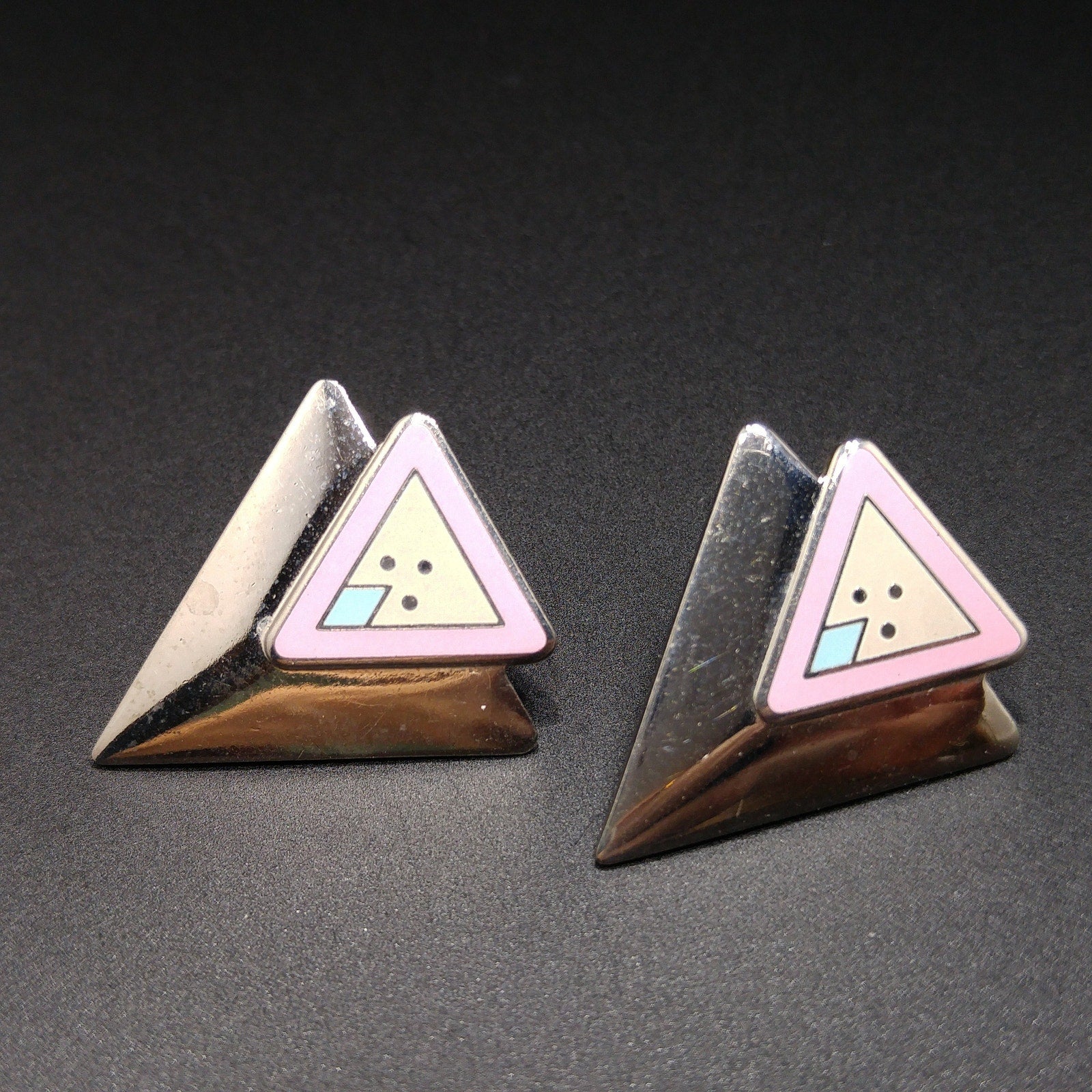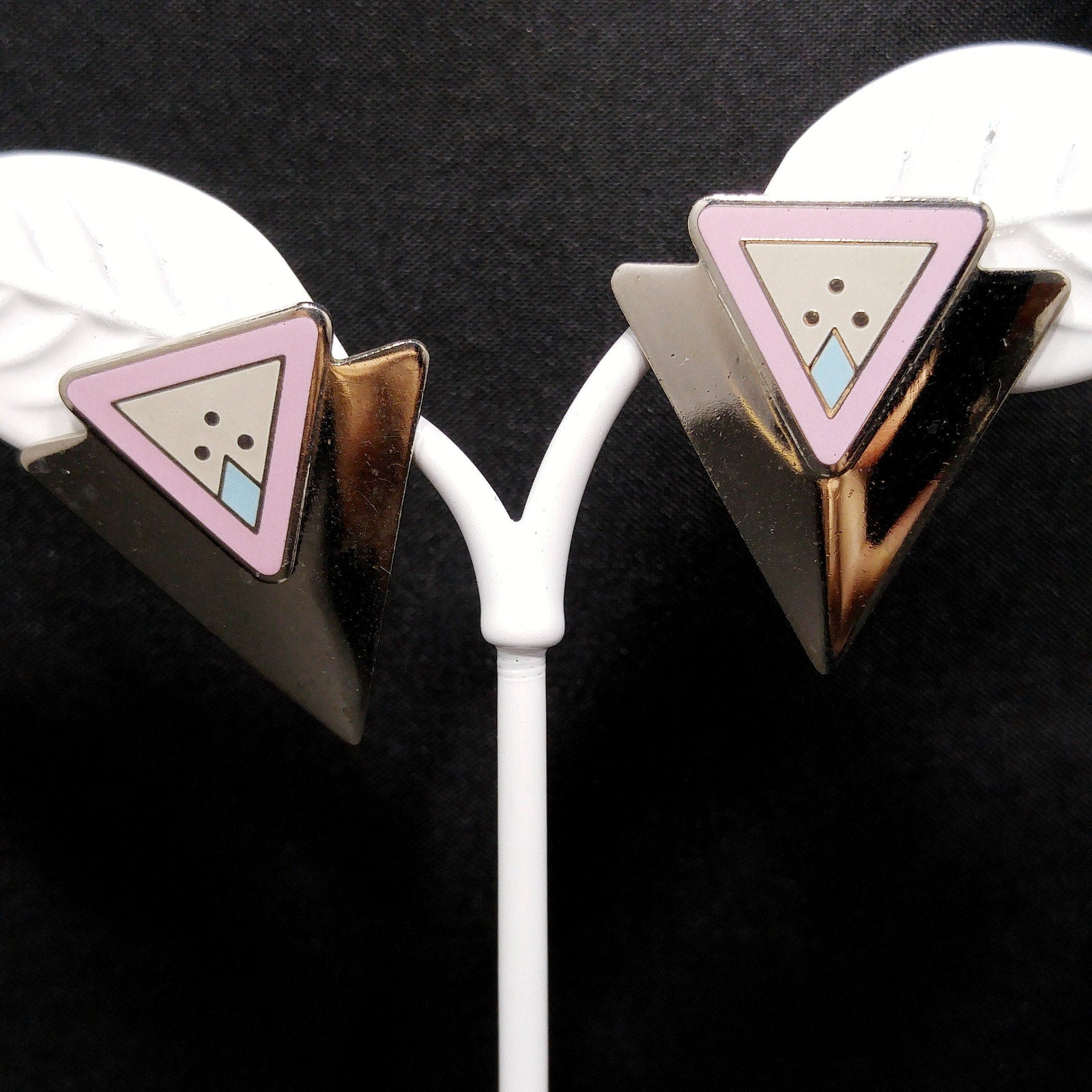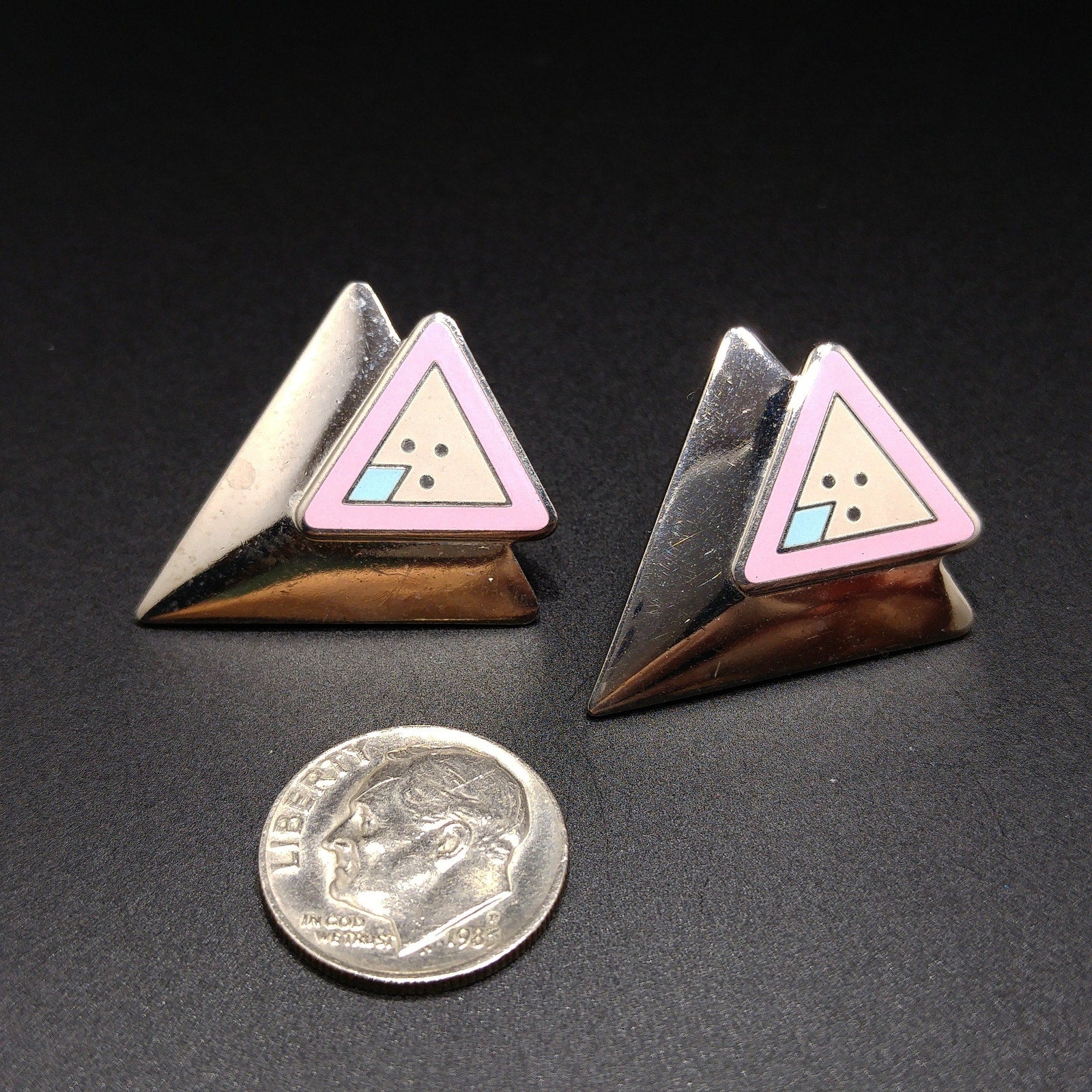 *Description: This is a great pair of Laurel Burch triangular earrings entitled "ANNE" with very reflective rhodium plating, silver tone, and enamel in pink, beige, and light blue; all on the smaller triangle from the 1980s. The larger triangle is silver reflective plating and anything you see on the photos are reflections of my shirt, camera, etc. The smaller triangle is all cloisonné and enamel is soft pastel colors. This would be a great addition to your vintage jewelry collection or make a great vintage gift!