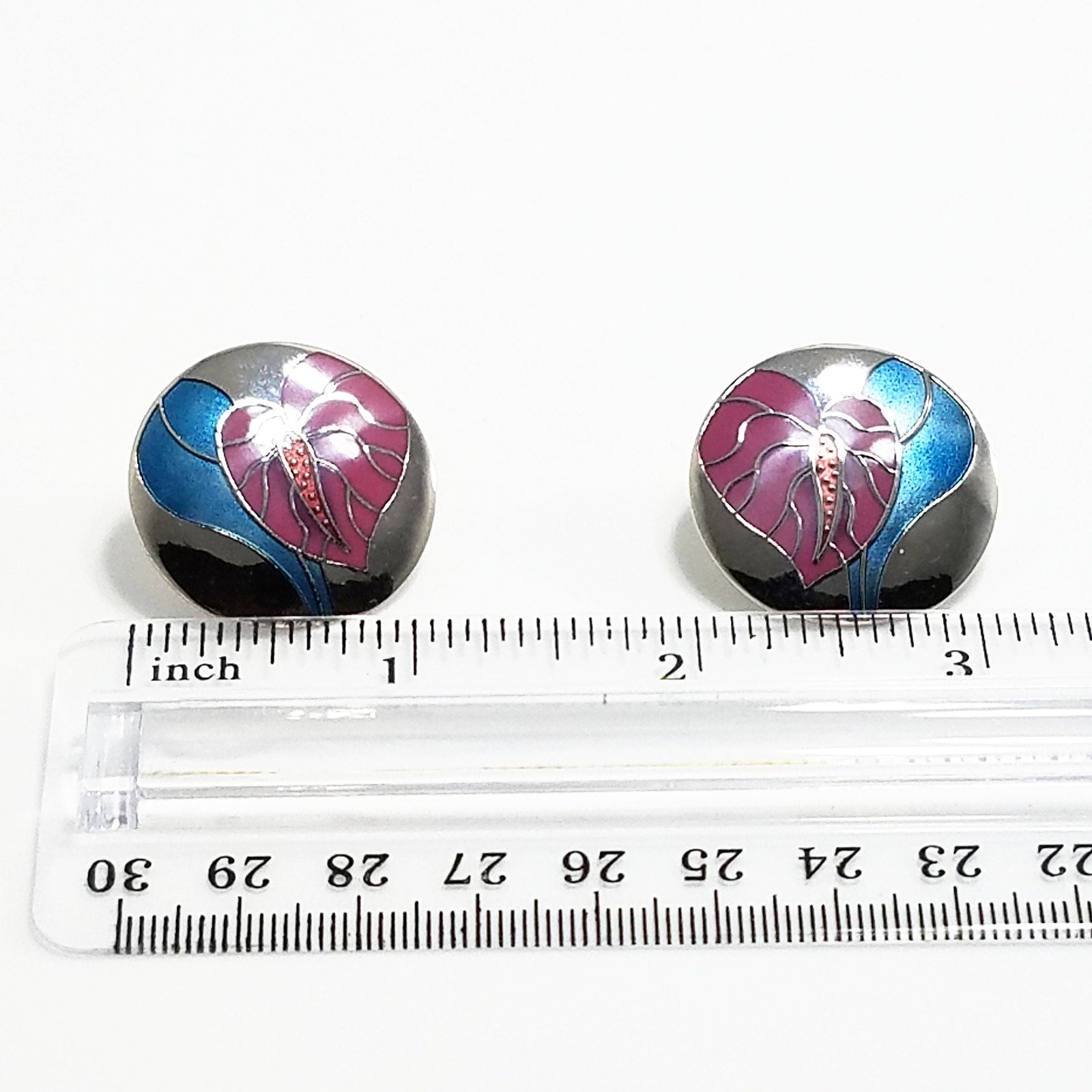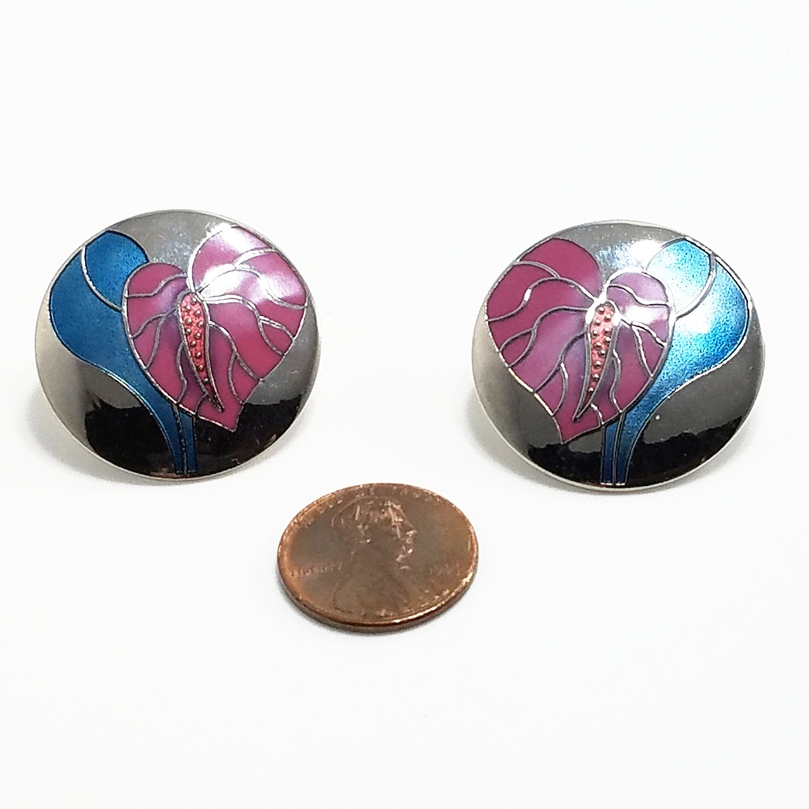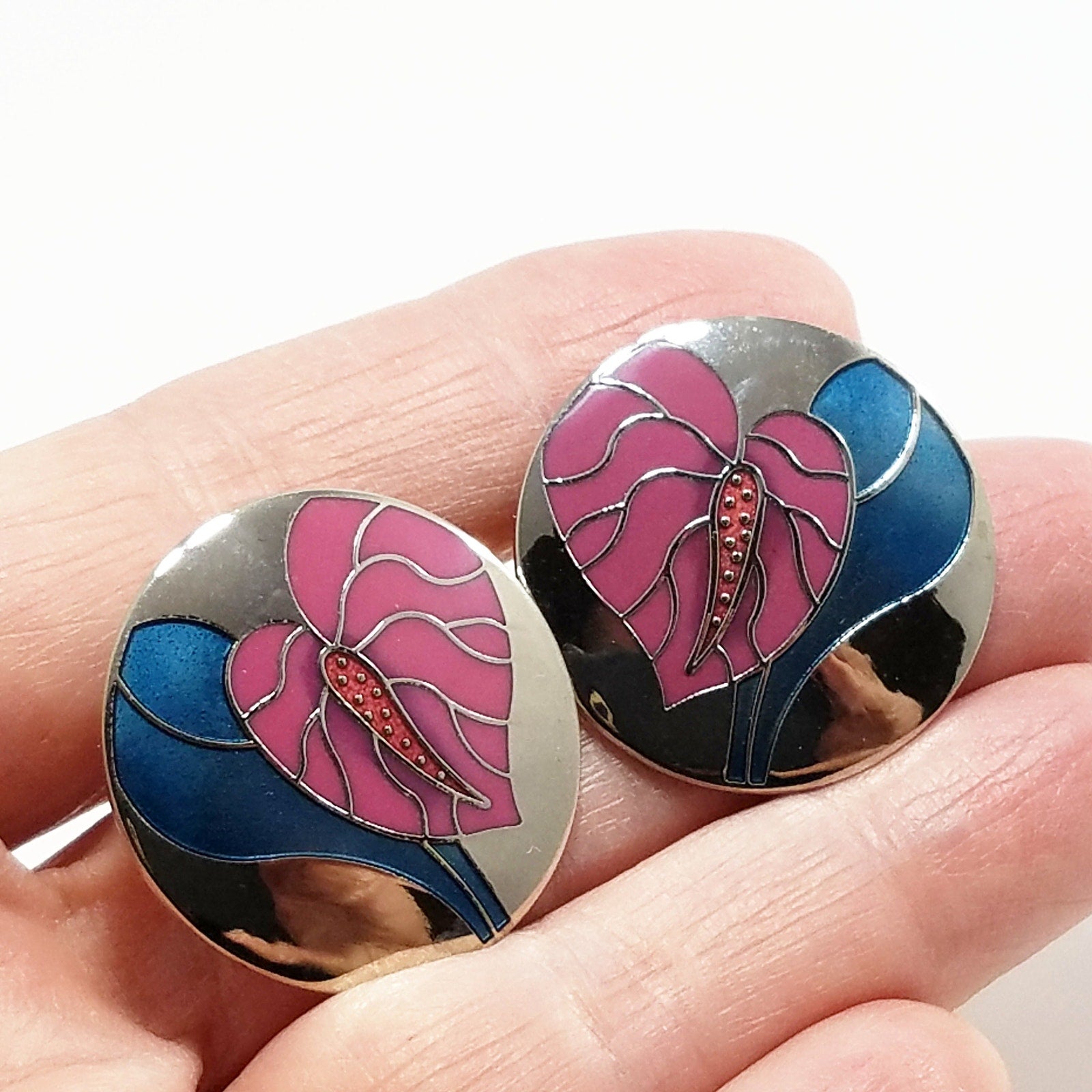 *Description: This is a beautiful pair of Laurel Burch Vintage earrings from the 1980s. These are Cloisonne' art earrings with silver tone trim and mirror-like silver reflective background with deep pink enamel antherium and blue enamel leaves. White gold filled posts.