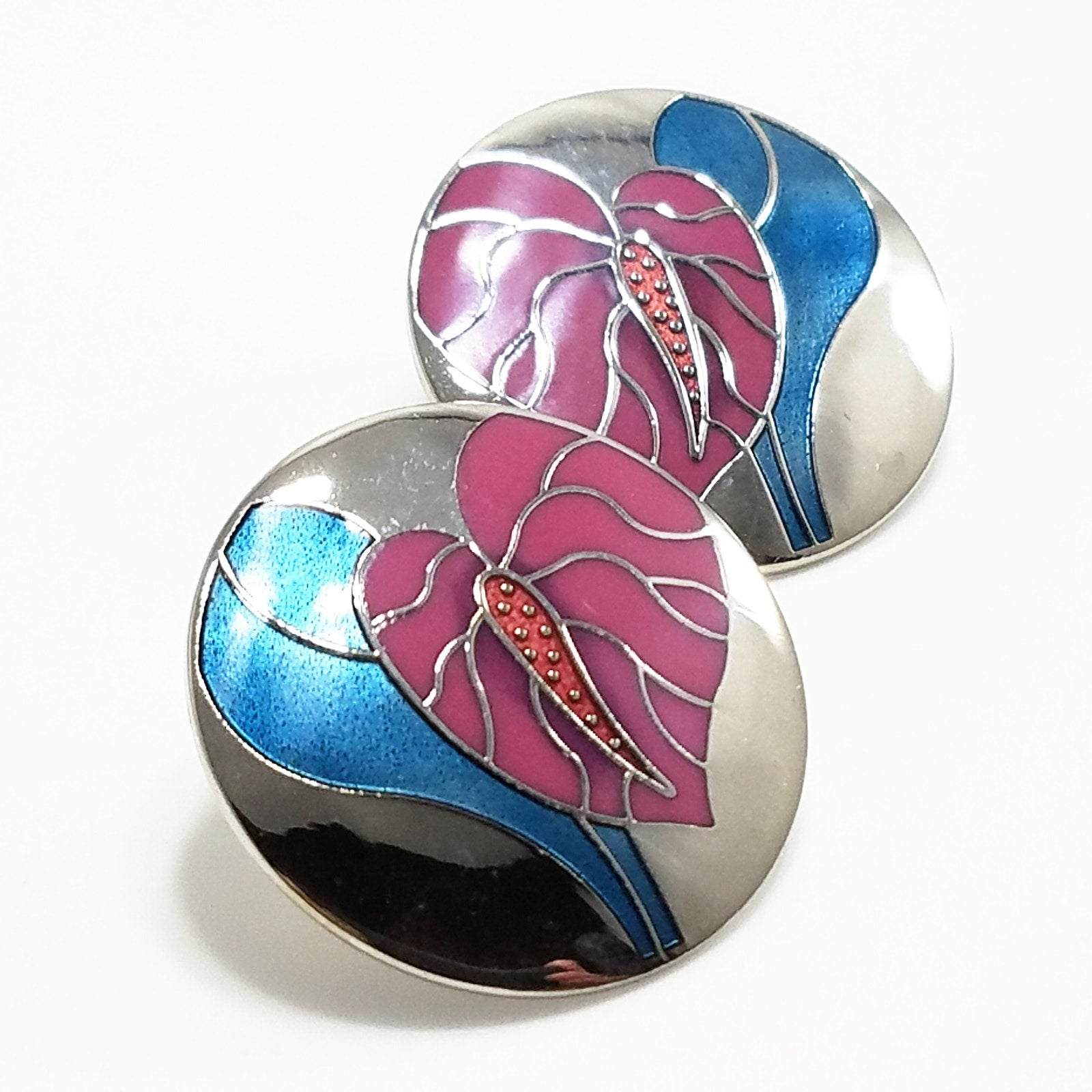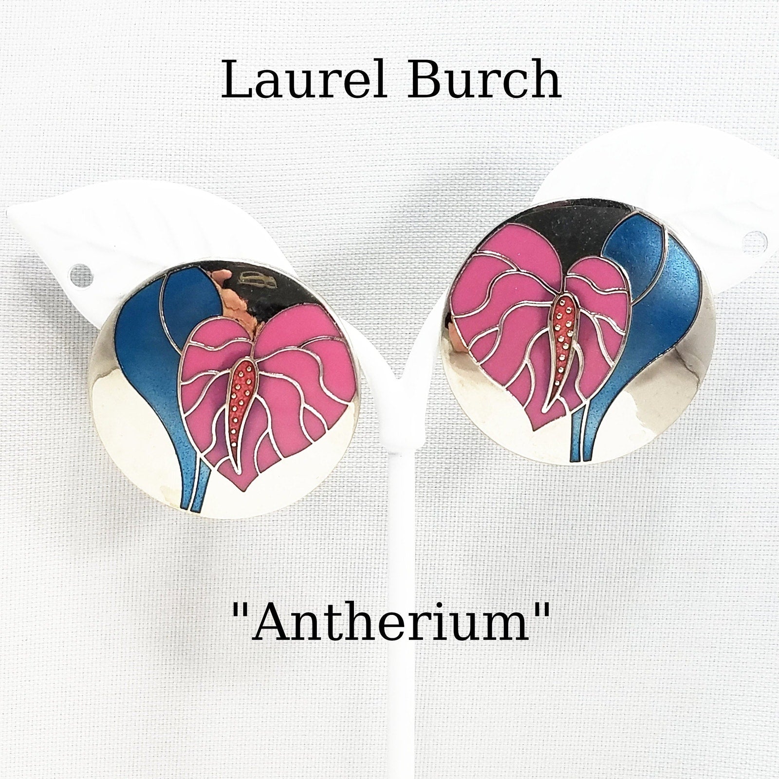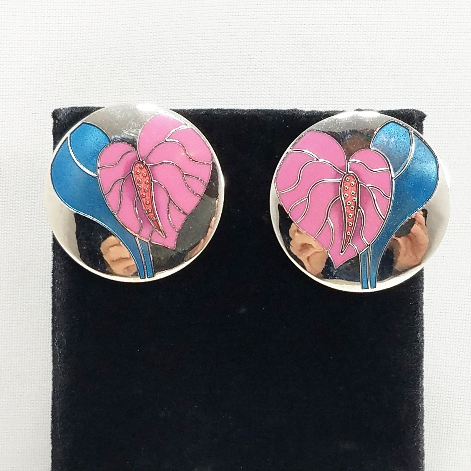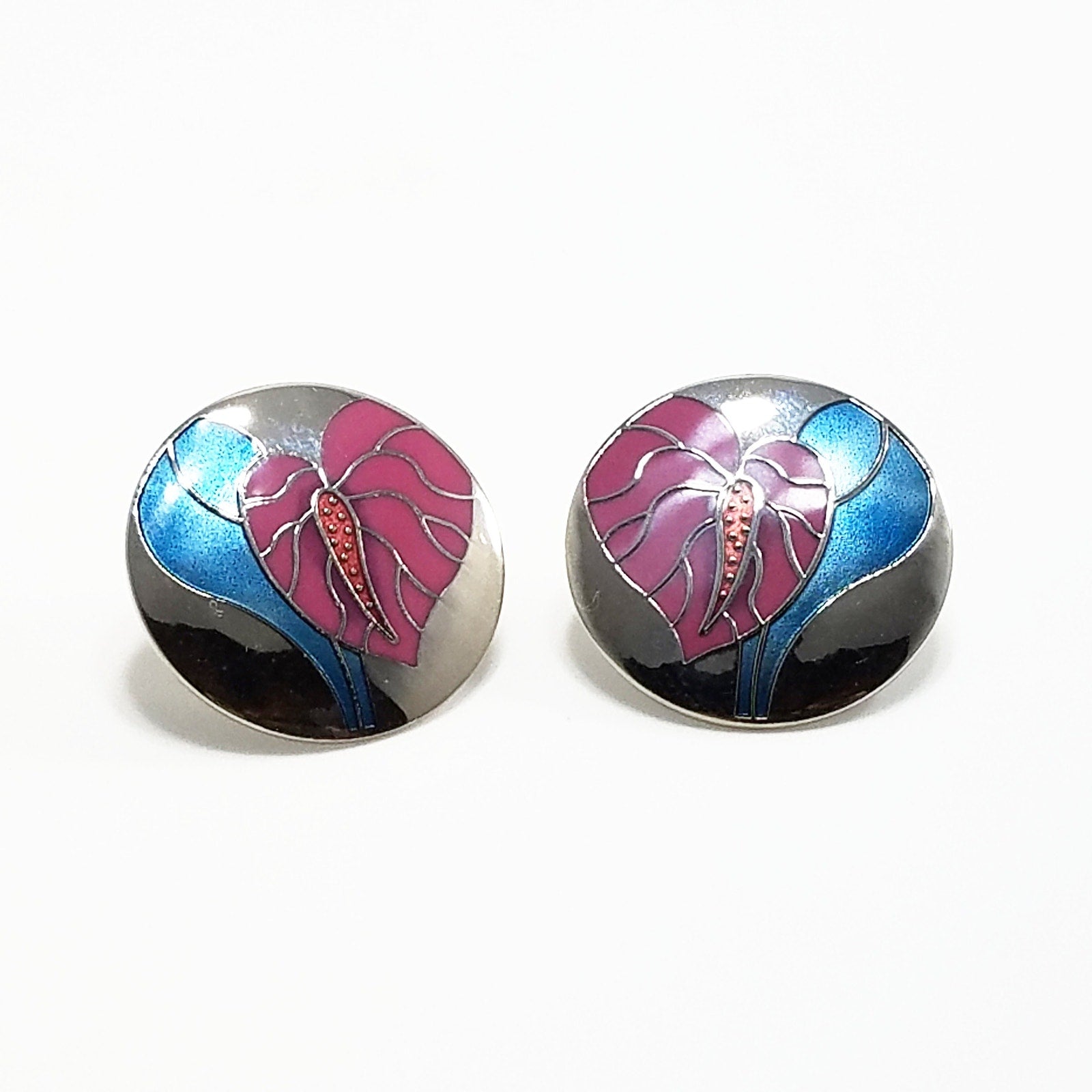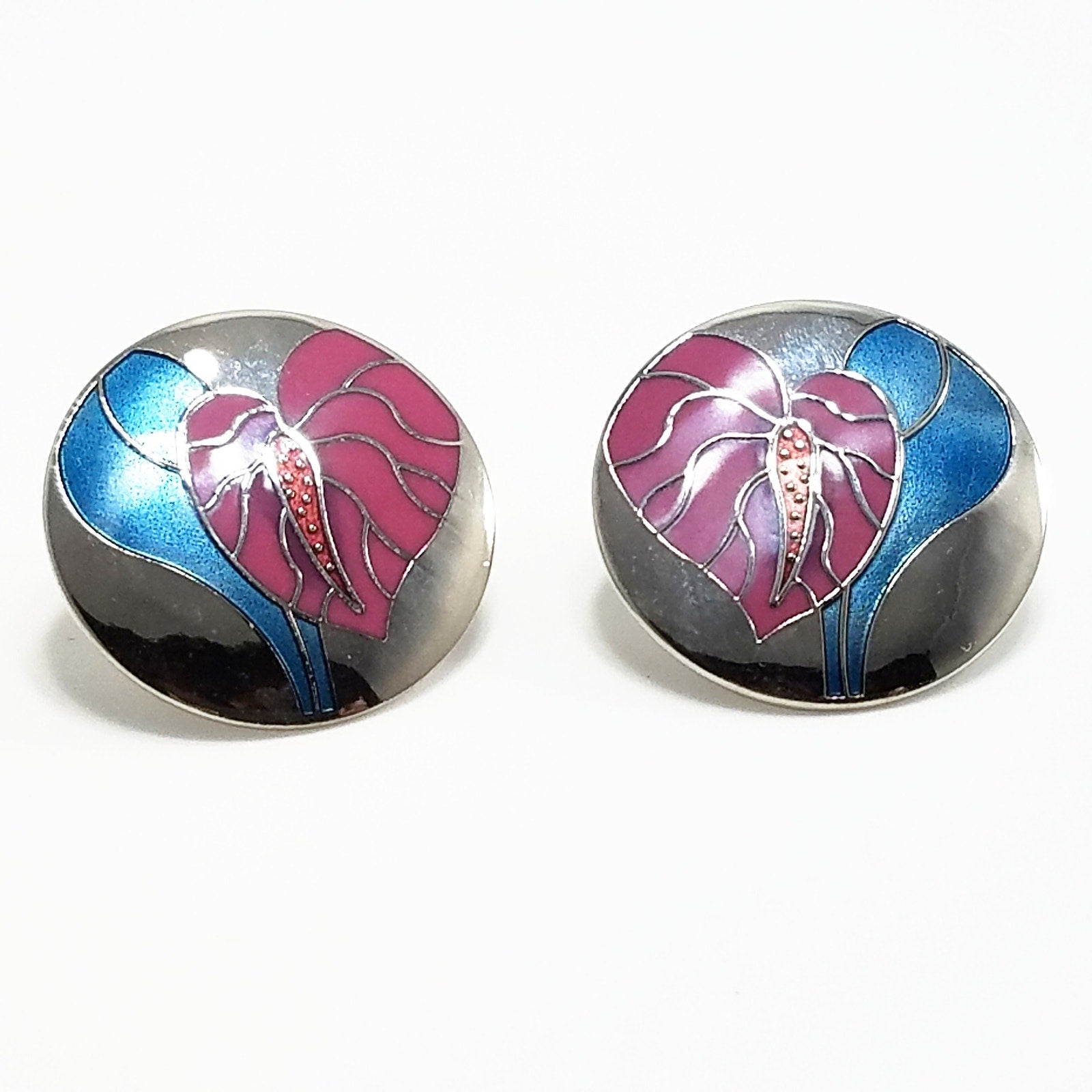 Vintage Laurel Burch "Antherium" Earrings Post Enamel Pink Antherium Blue Leaves Silver Tone Rhodium Plated Background Cloisonne 1980s Vintage Jewelry