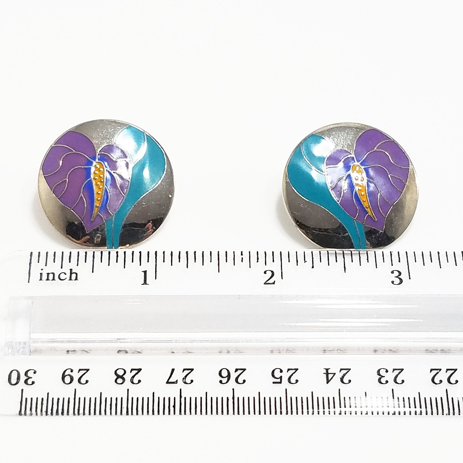 Vintage Laurel Burch "Antherium" Earrings Post Enamel Lavender Antherium Teal Leaves Silver Tone Background Cloisonne 1980s Vintage Jewelry