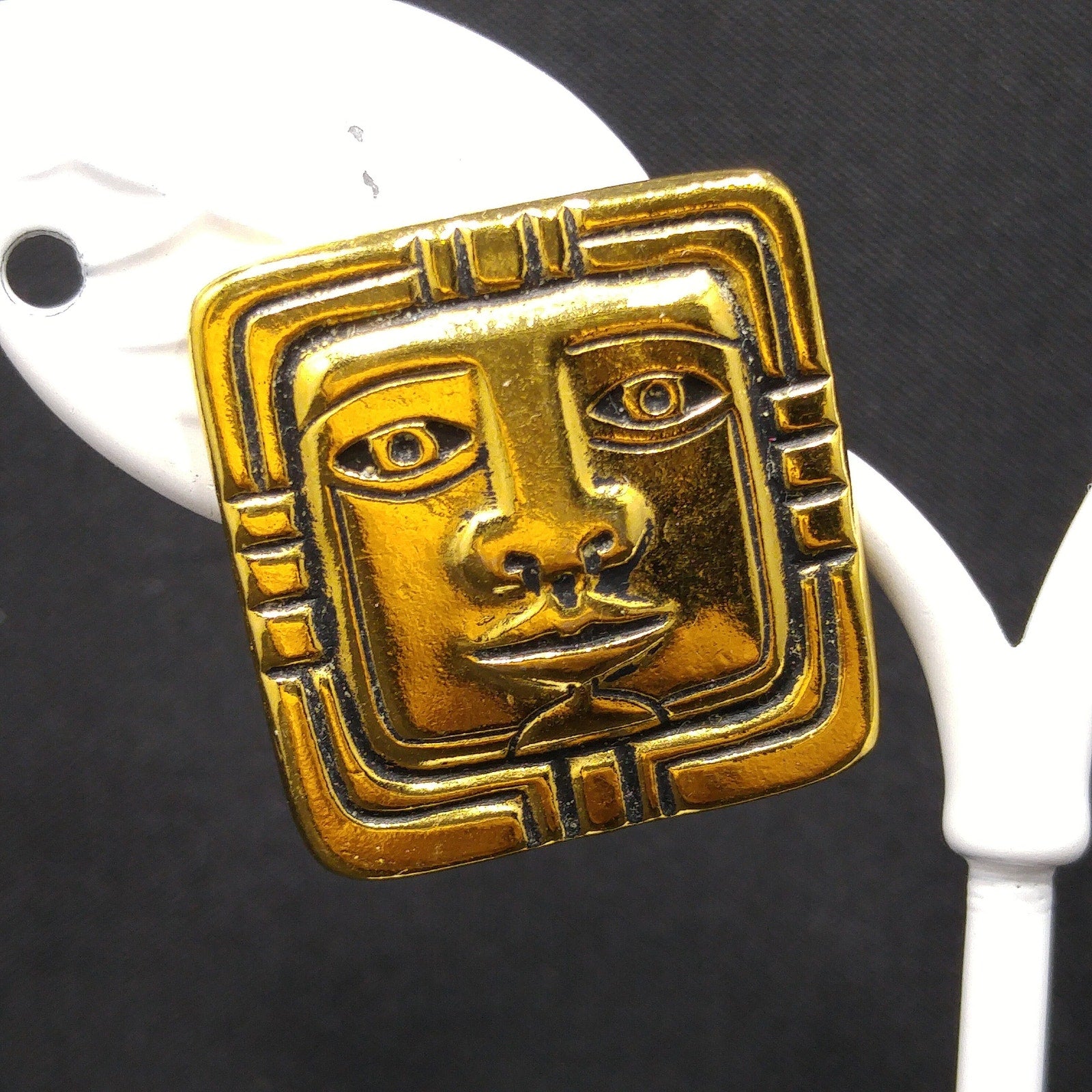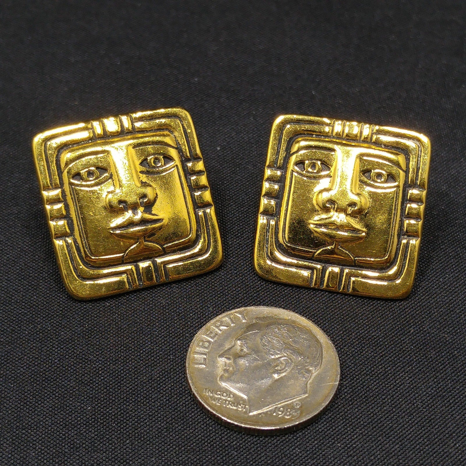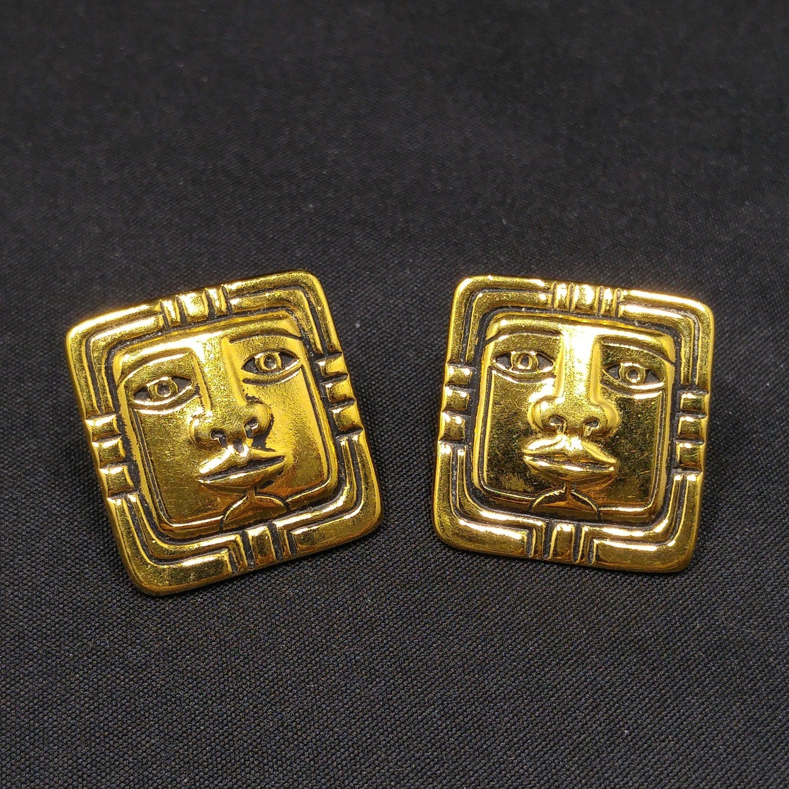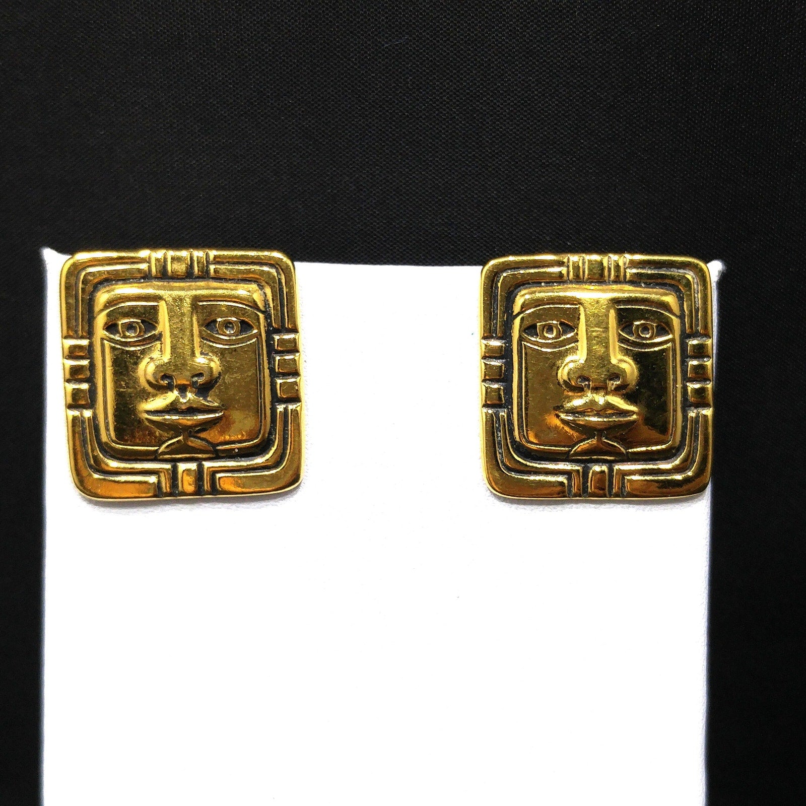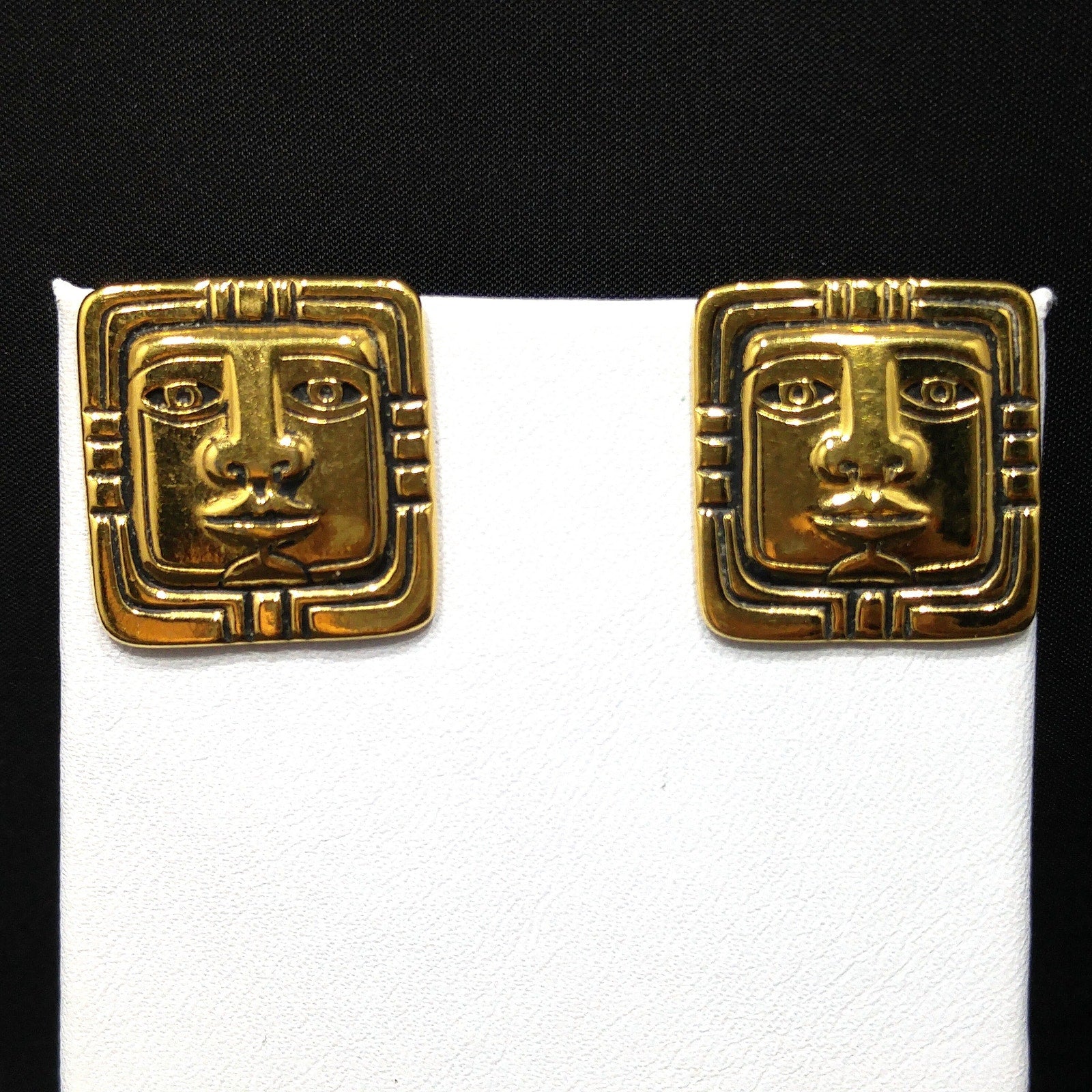 Vintage Laurel Burch Aztec Face Post Earrings, Gold Plated