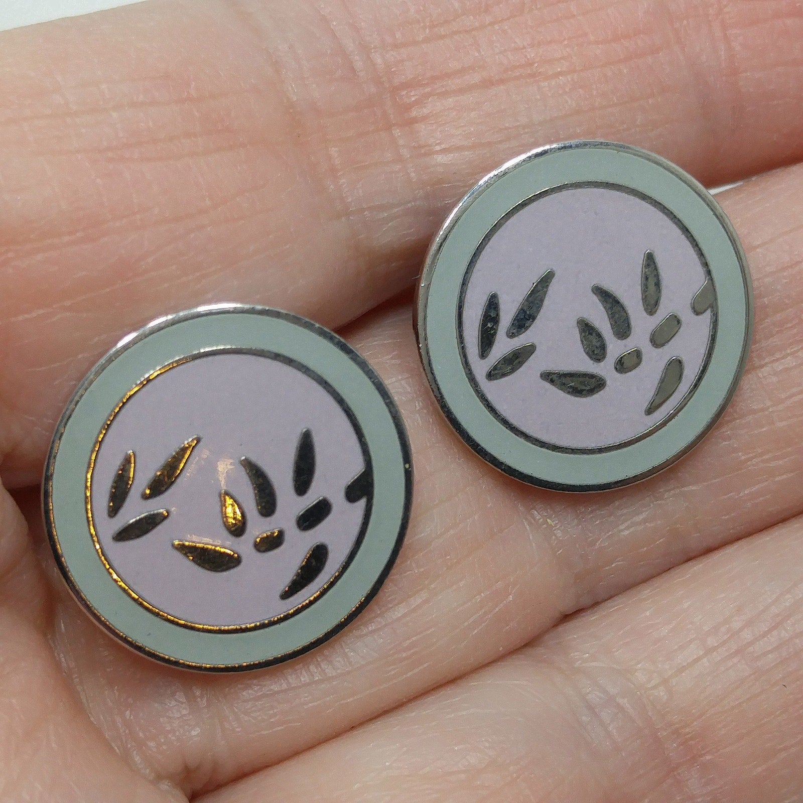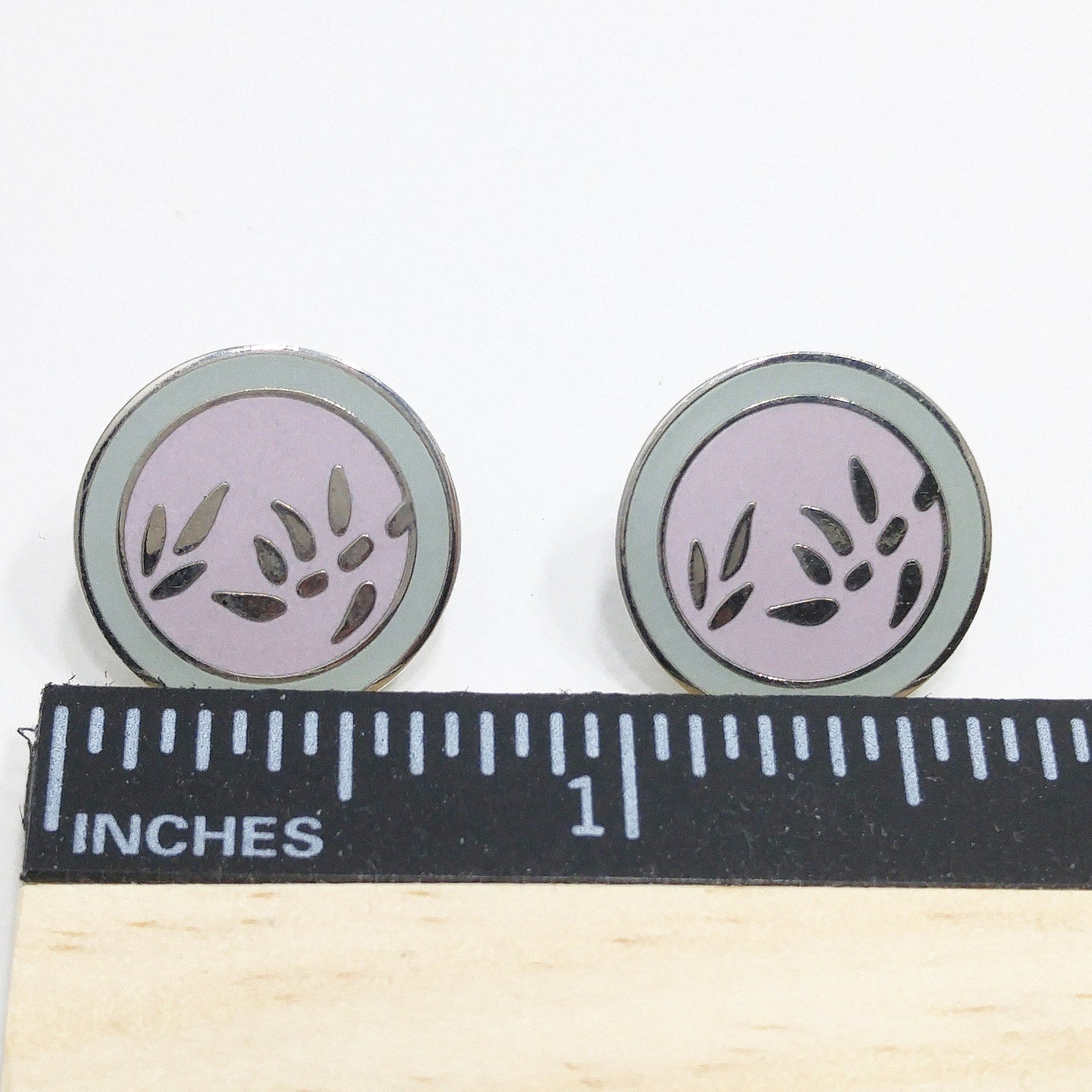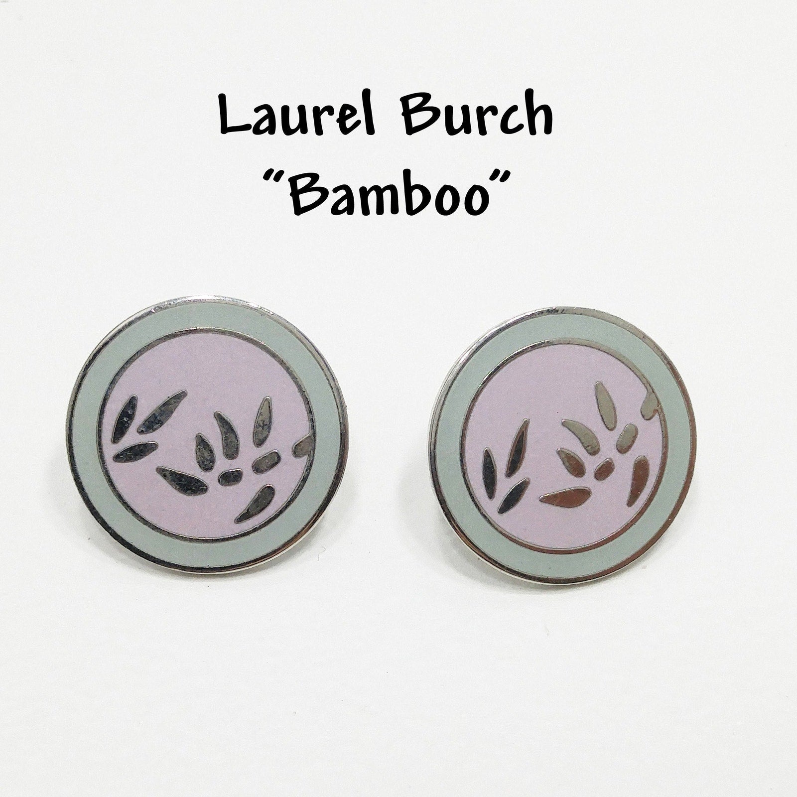 *Description: This is a beautiful pastel pair of Laurel Burch "Bamboo" post earrings from the 1980s. The cloisonne and backing a silver tone gold plate and the enamel is a pink/lavender center with silver bamboo; outlined in a mint green/gray enamel. The color of these earrings look slightly different depending on the lights. The color combination is beautiful and are lovely pastel enamel colors.