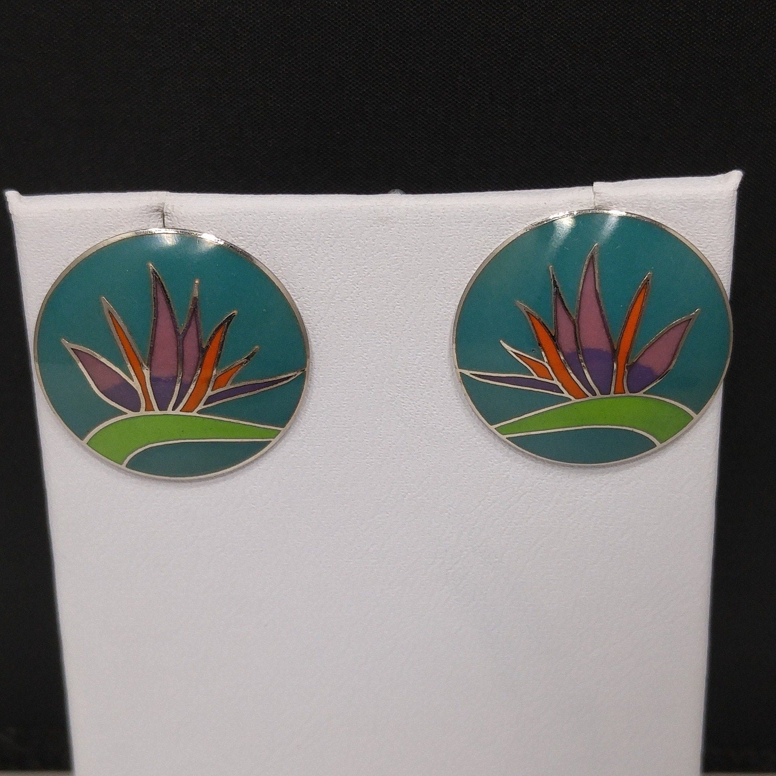 Vintage Laurel Burch Bird of Paradise Post Earrings, Silver Tone Cloisonné