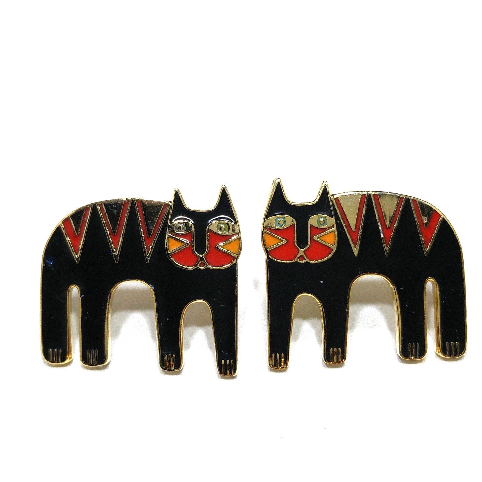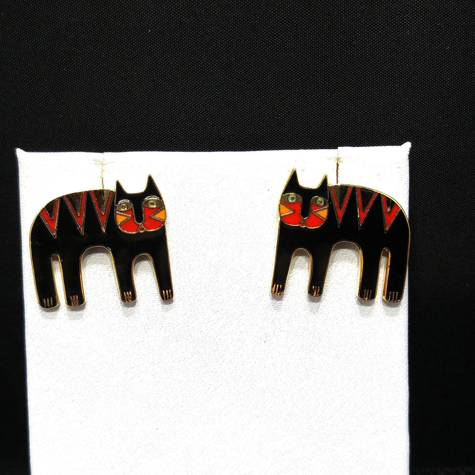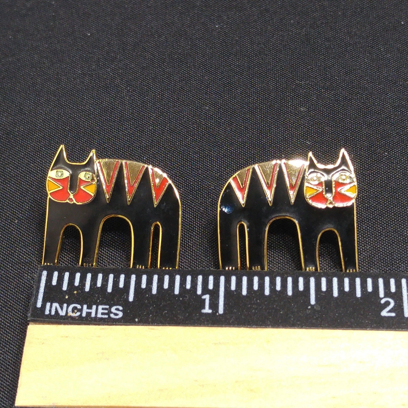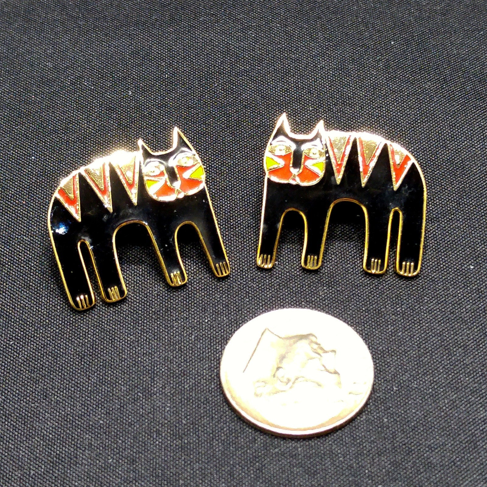 *Description: This is a good pair of Laurel Burch black enamel cat earrings with cloisonne gold plate from the 1980s. The posts are gold filled and they have push back clasps. The cats have red and yellow on their faces and red triangles on their backs. The cats are facing each other. There is a small indentation on the left earring. Please see photos for details. No enamel is missing but it is slightly pushed in. This would be a great addition to your vintage jewelry collection or make a great vintage gift!