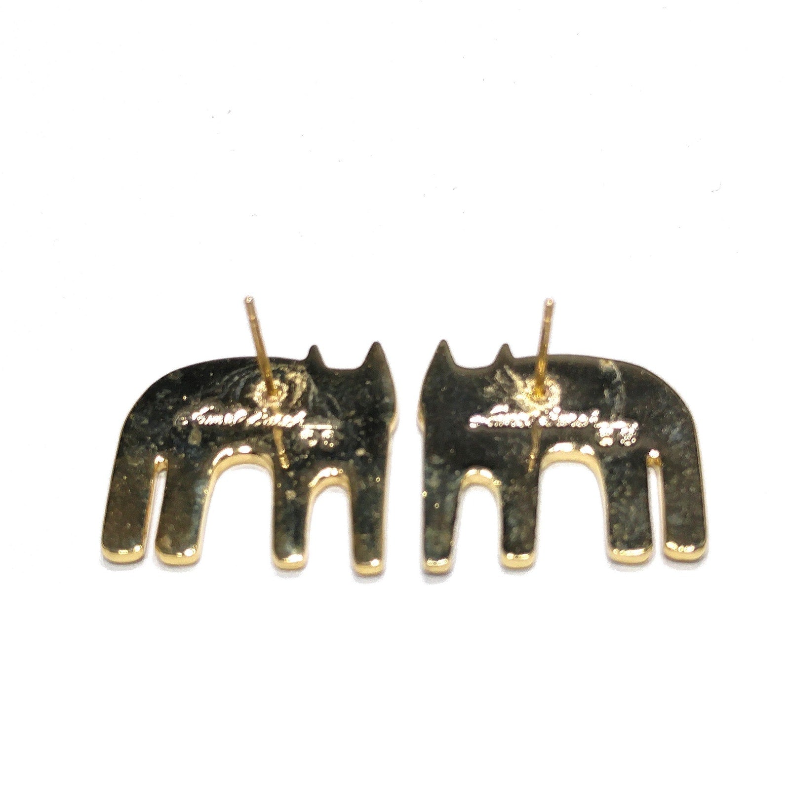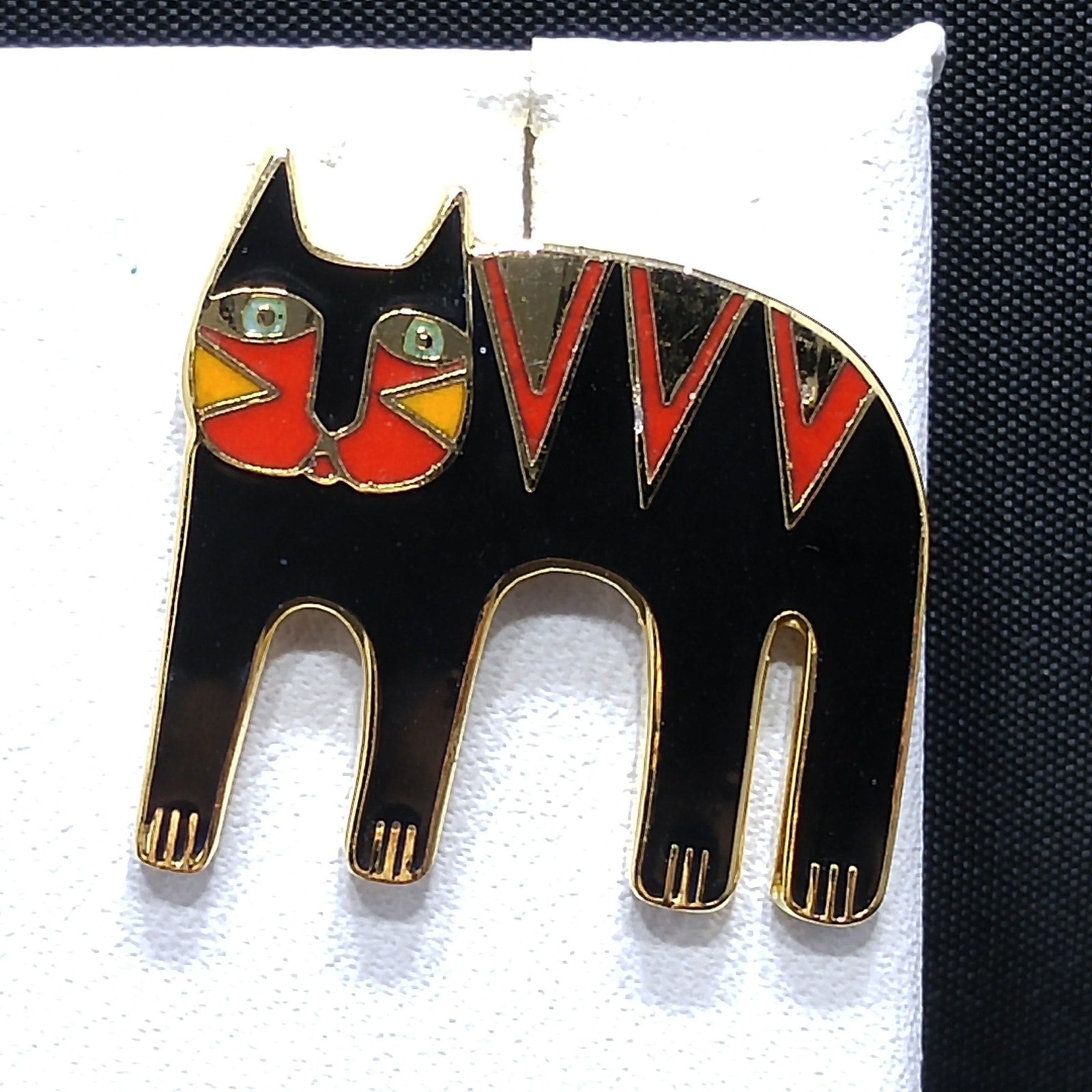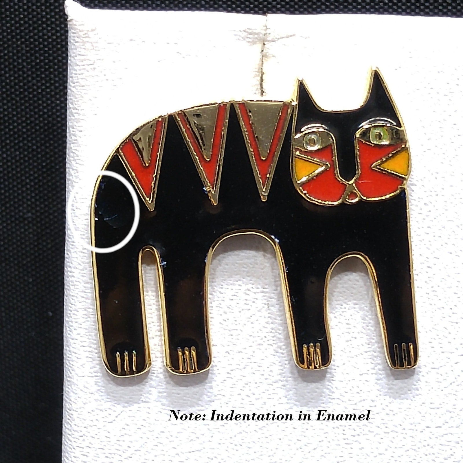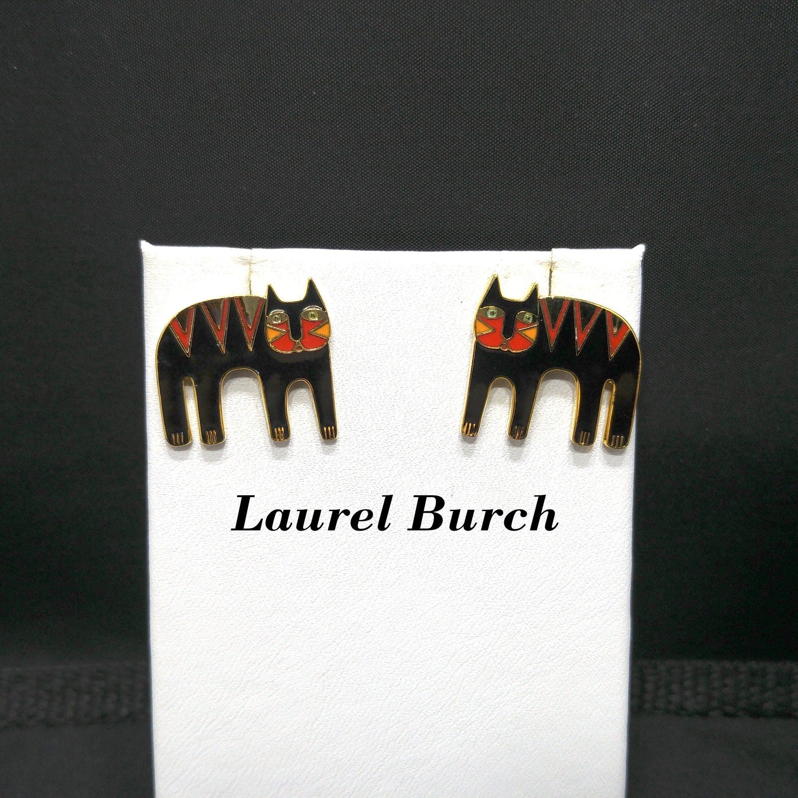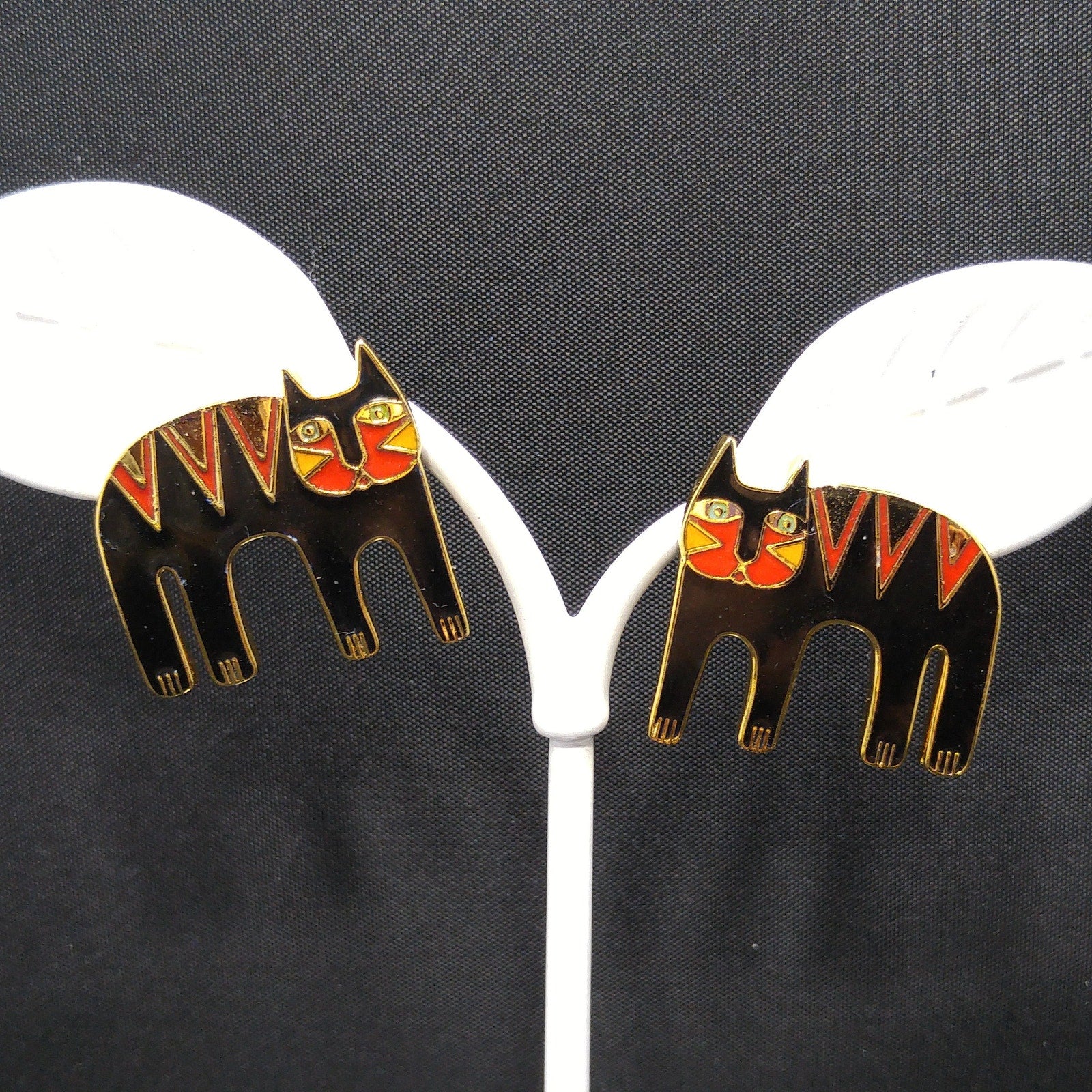 *Description: This is a good pair of Laurel Burch black enamel cat earrings with cloisonne gold plate from the 1980s. The posts are gold filled and they have push back clasps. The cats have red and yellow on their faces and red triangles on their backs. The cats are facing each other. There is a small indentation on the left earring. Please see photos for details. No enamel is missing but it is slightly pushed in. This would be a great addition to your vintage jewelry collection or make a great vintage gift!
