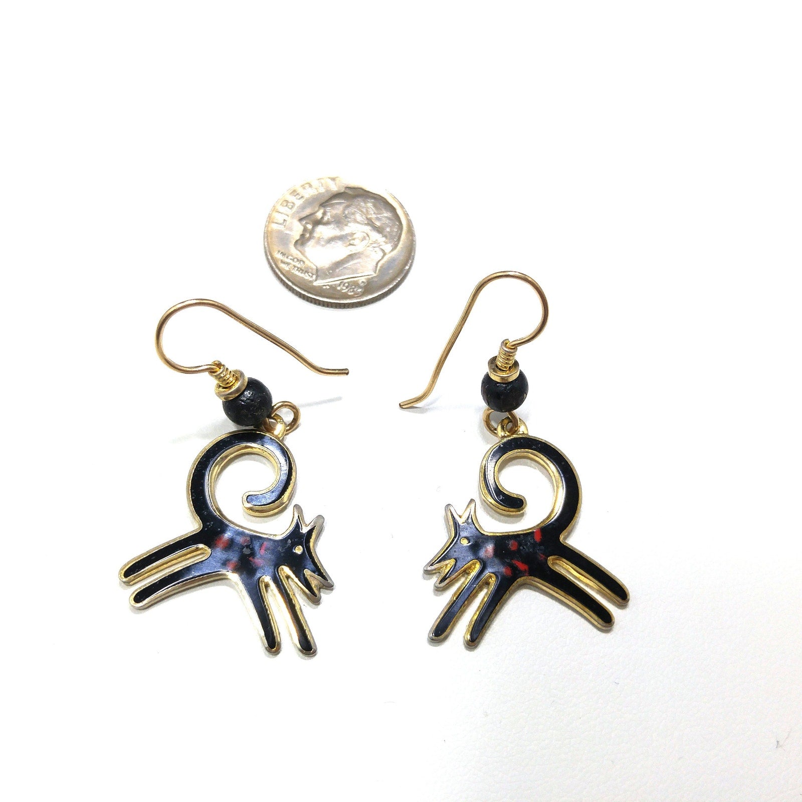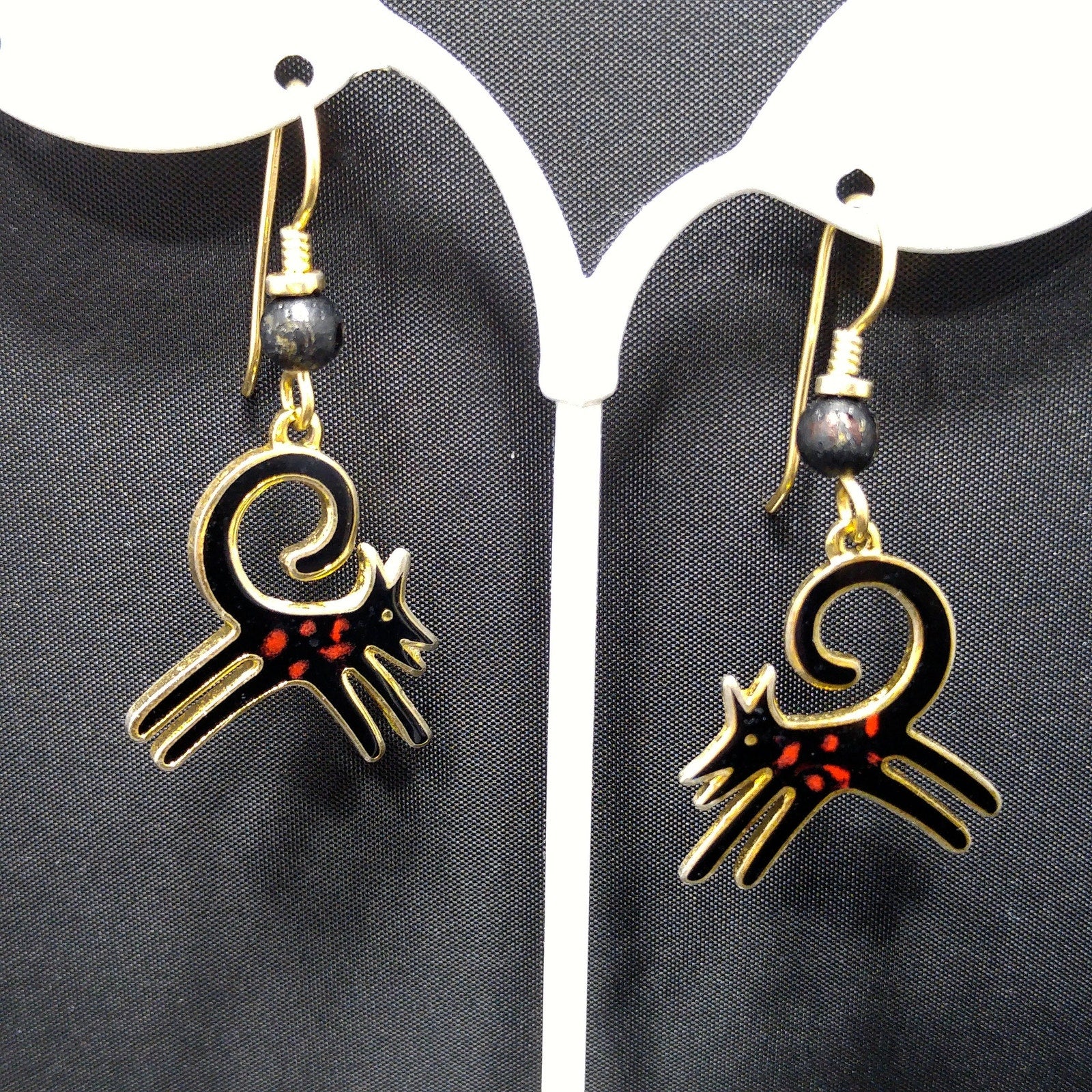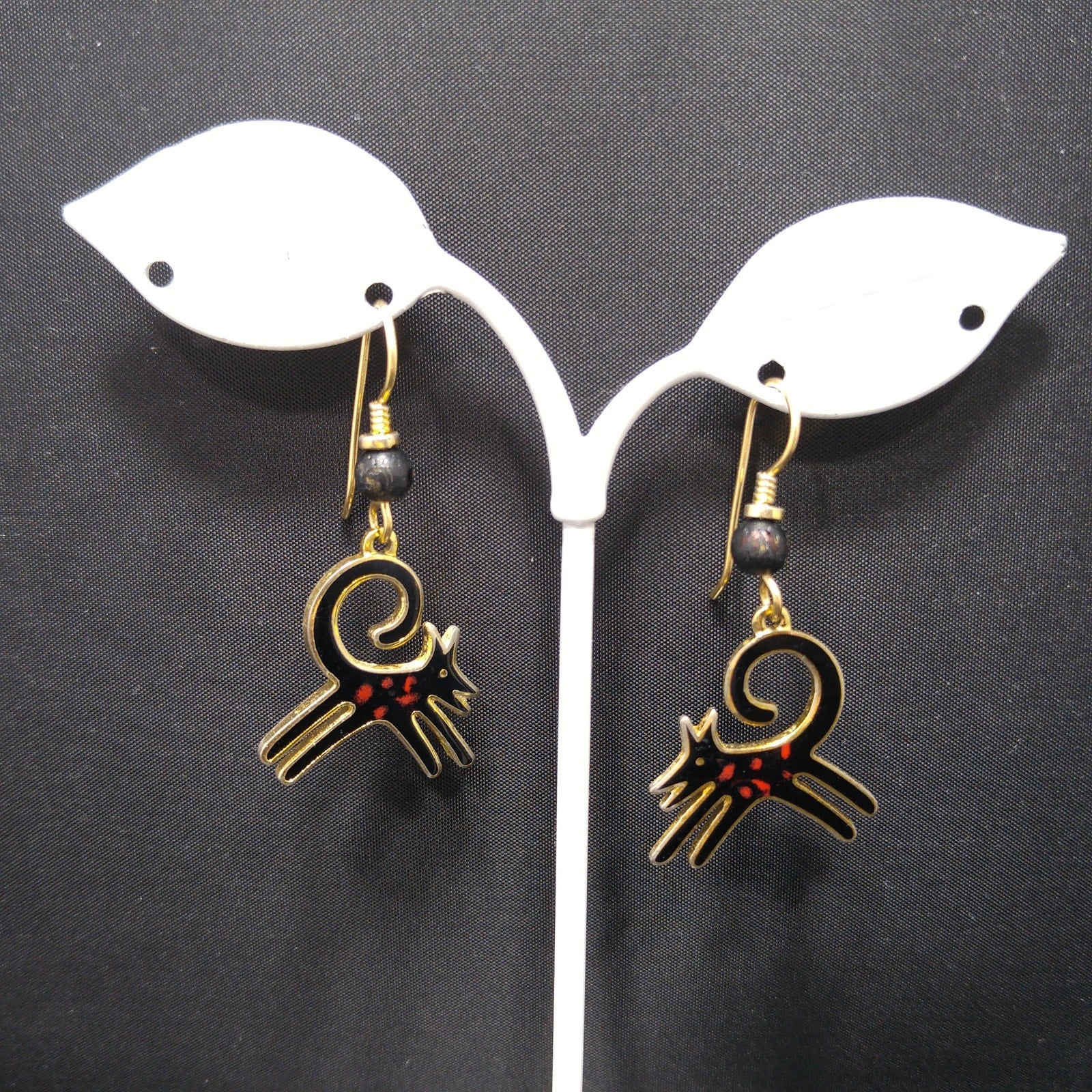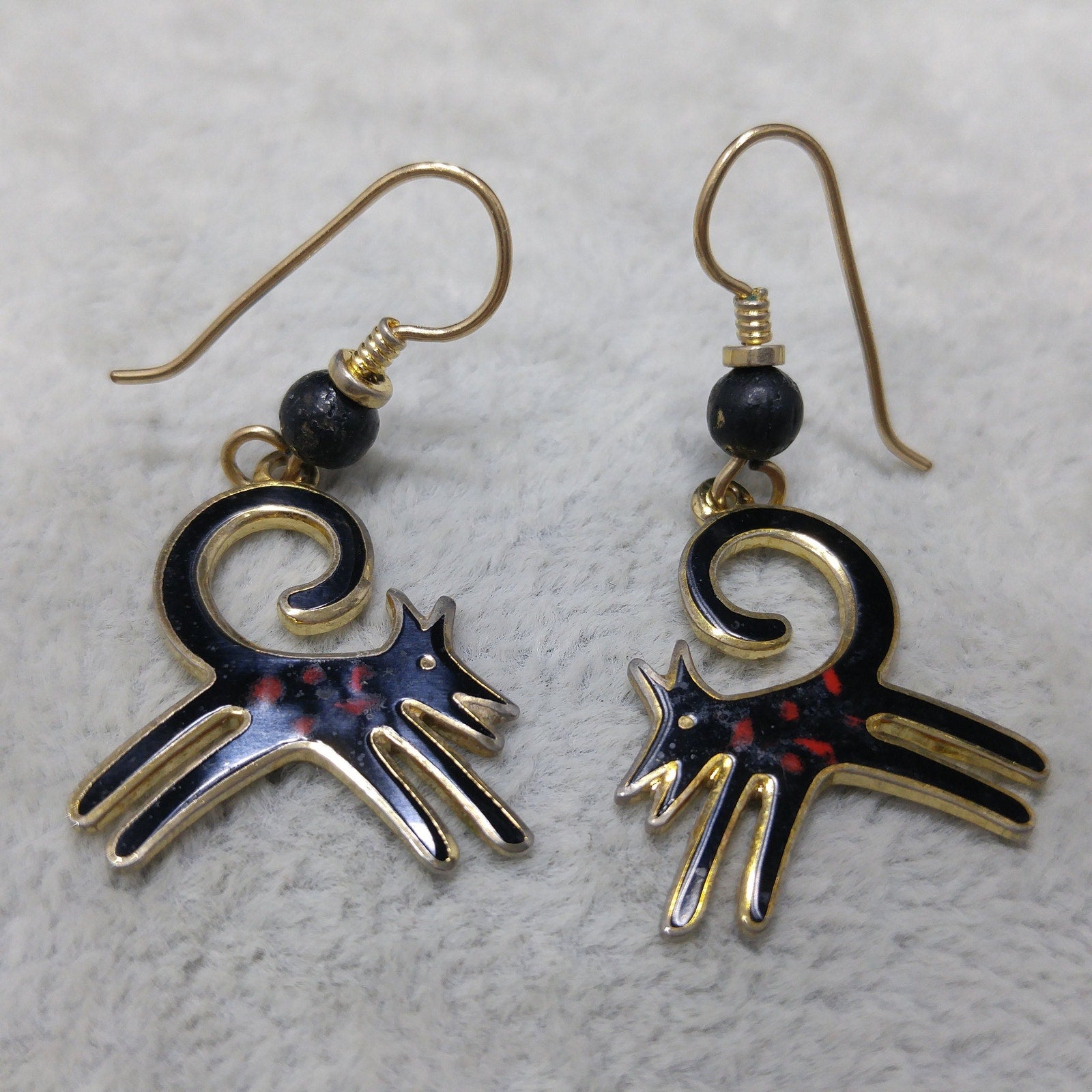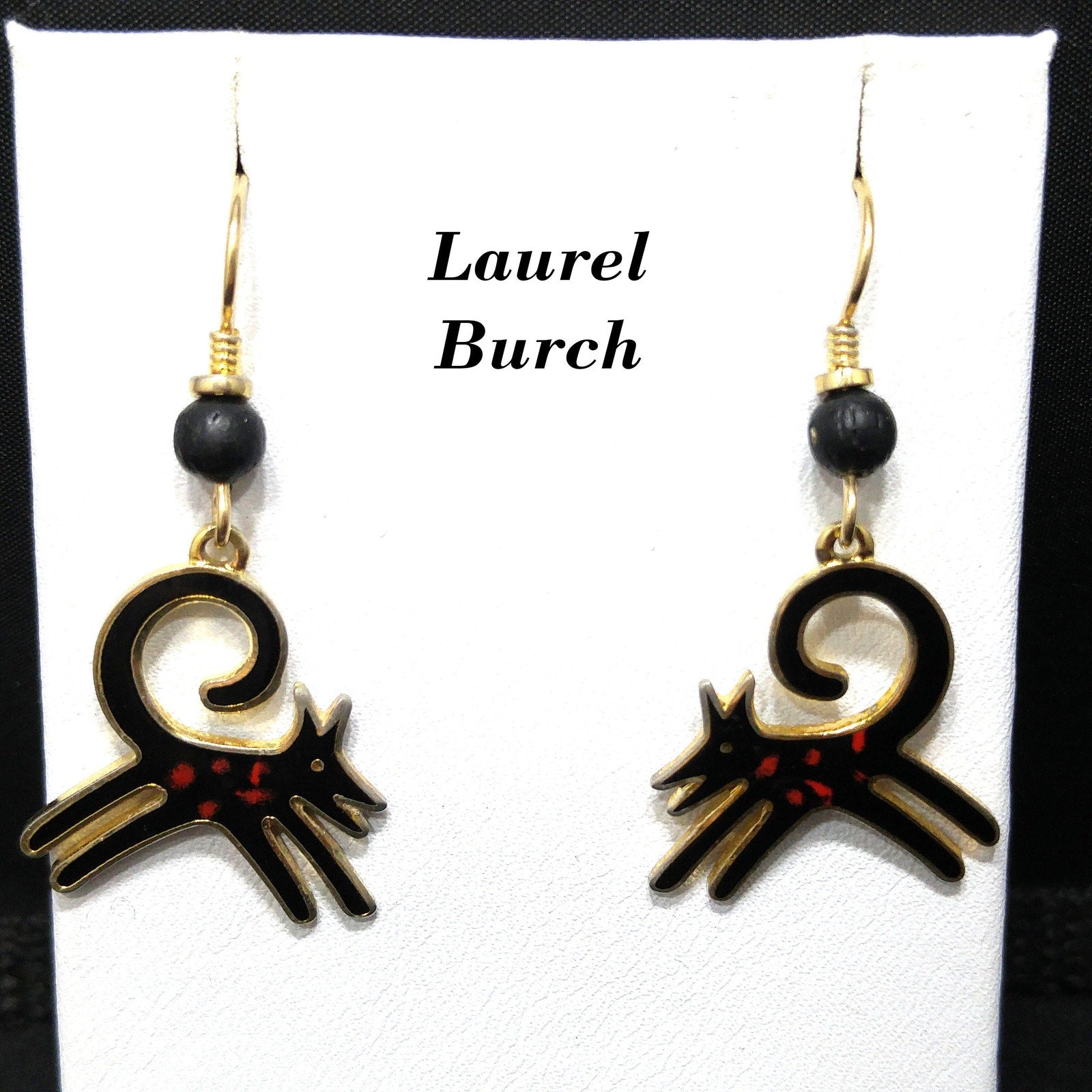 *Description: This is a great pair of black dog earrings by Laurel Burch from the 1980s. The black enamel dogs have a splash of red along the body and they appear to be running with their tail high and curved in the air. The enamel is outlined in gold plated cloisonne and backing. The bead is wooden and painted black. The ear wires are gold filled and each earrings is stamped Laurel Burch on the back. This would be a great addition to your vintage jewelry collection or make a great vintage gift!