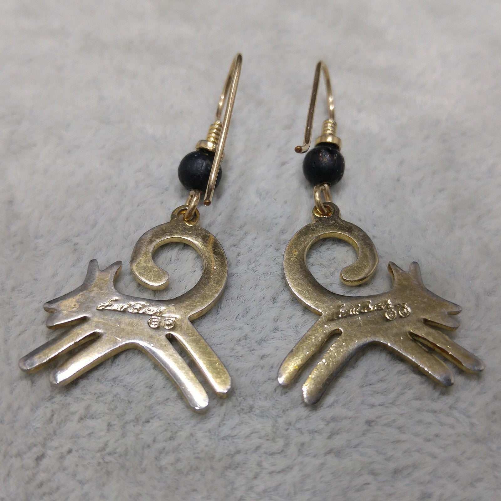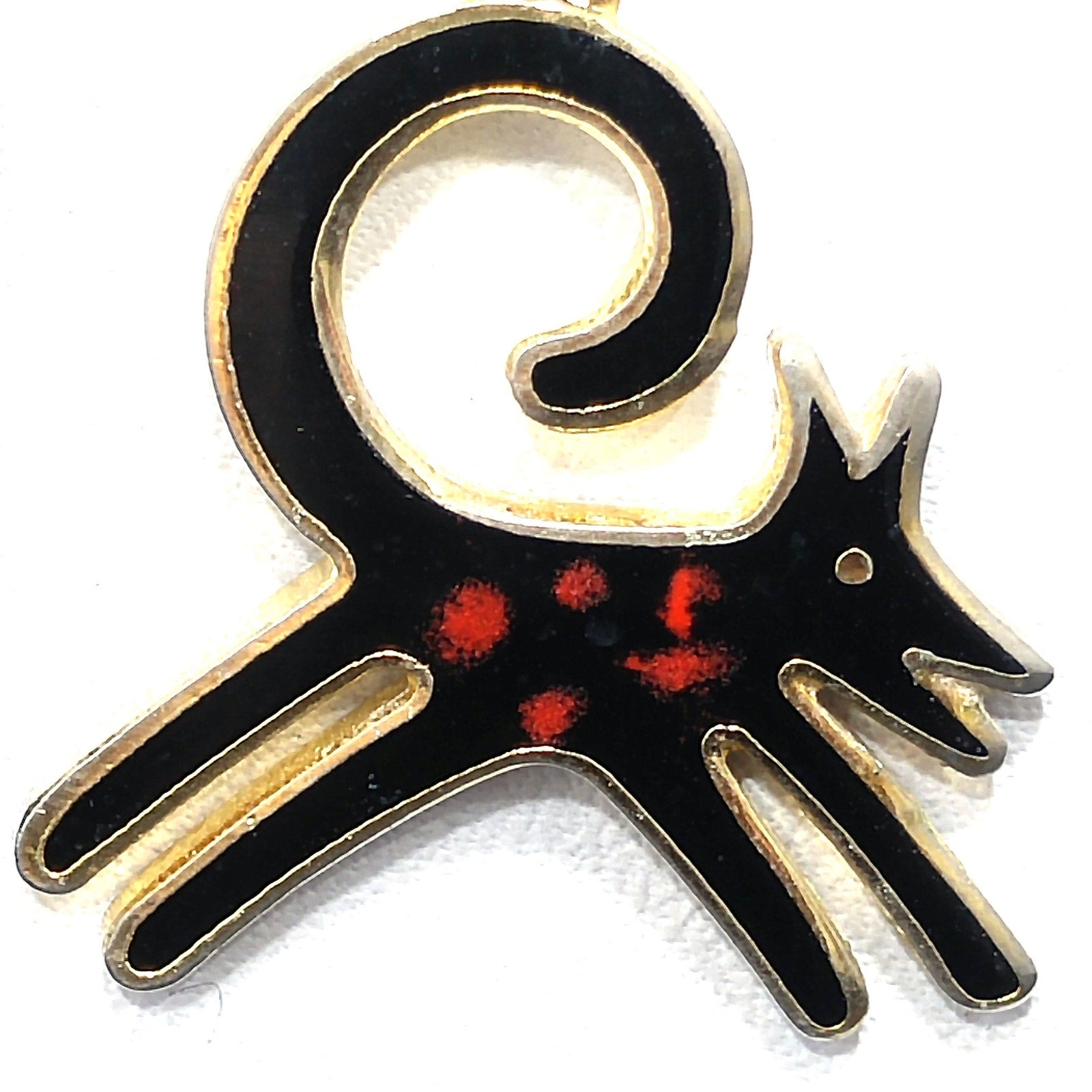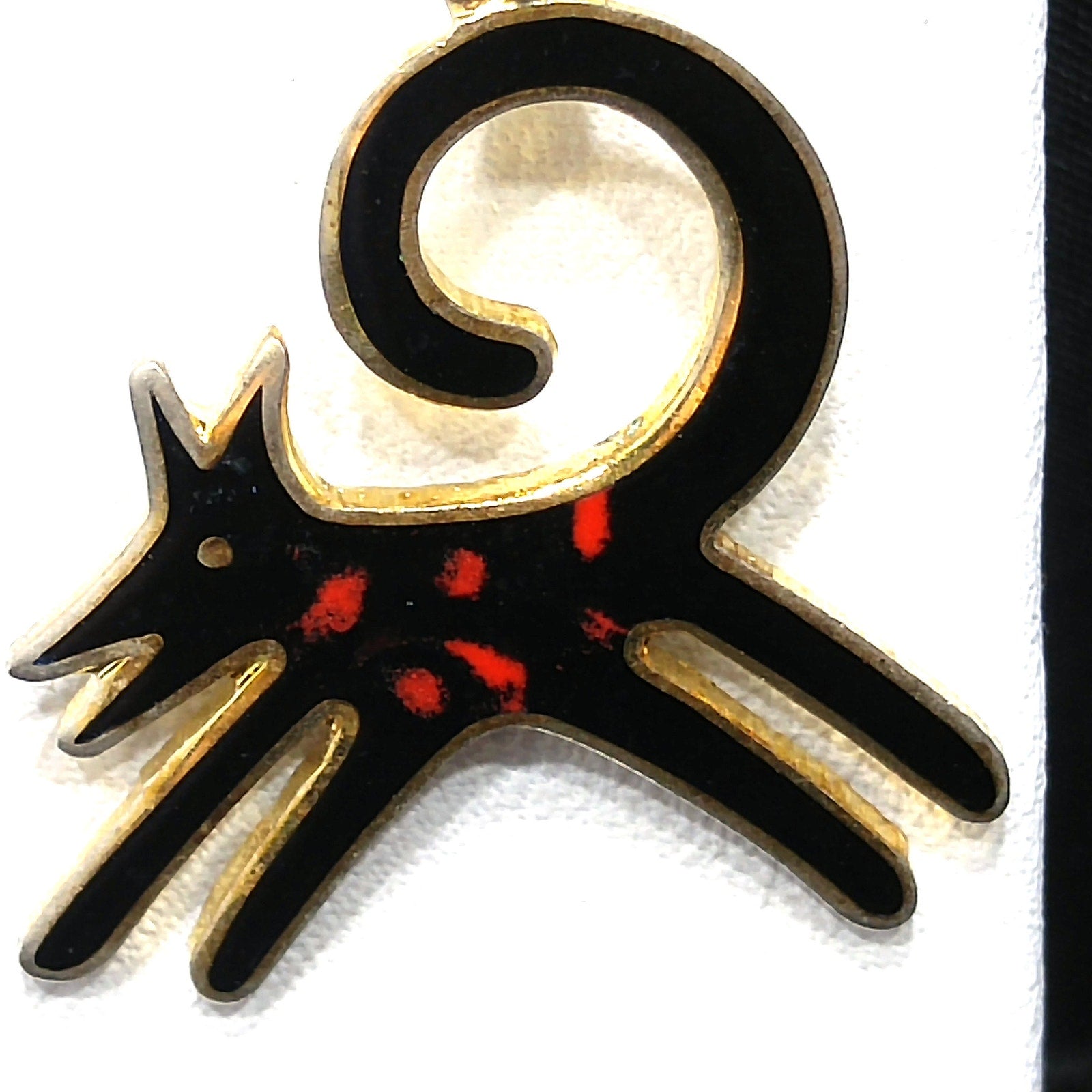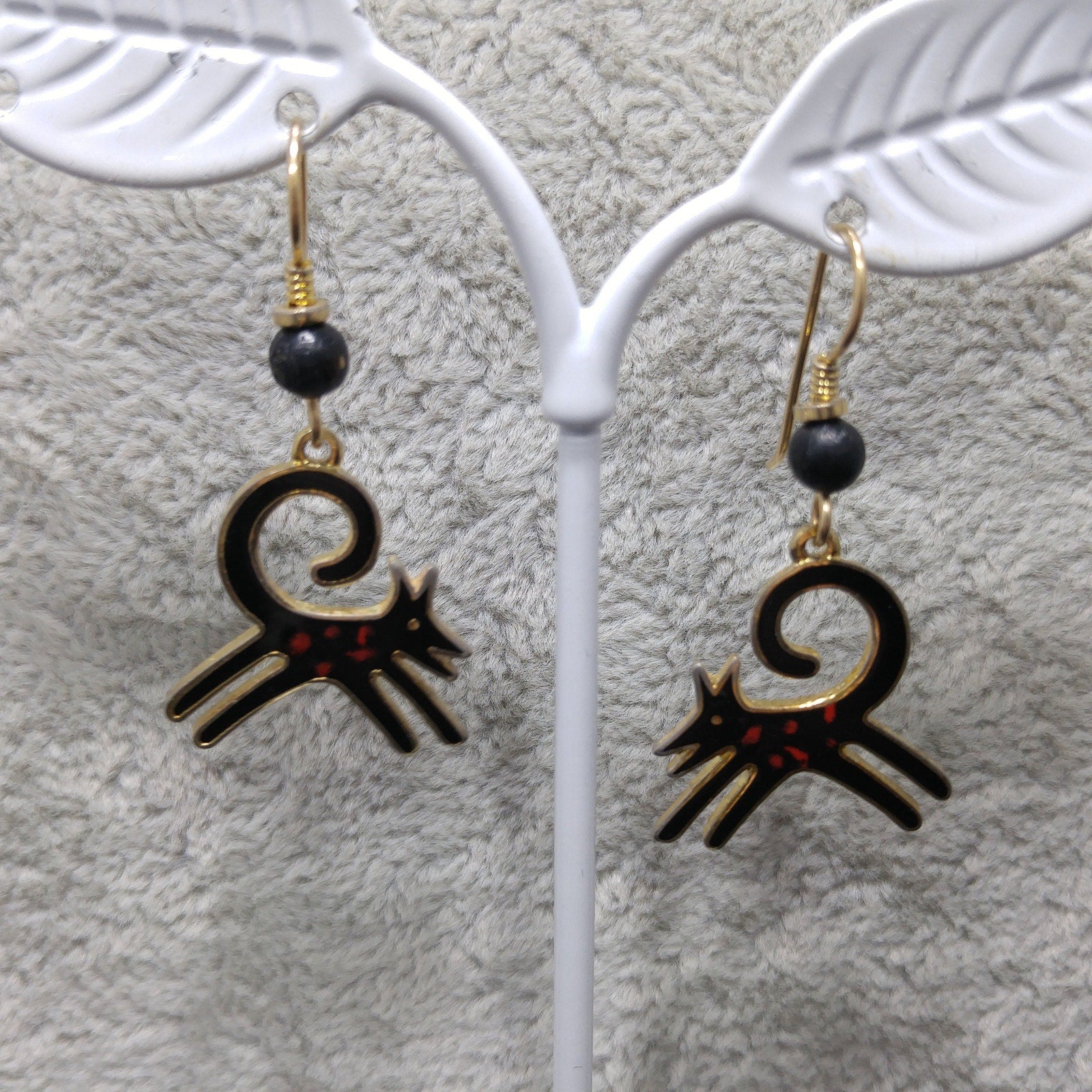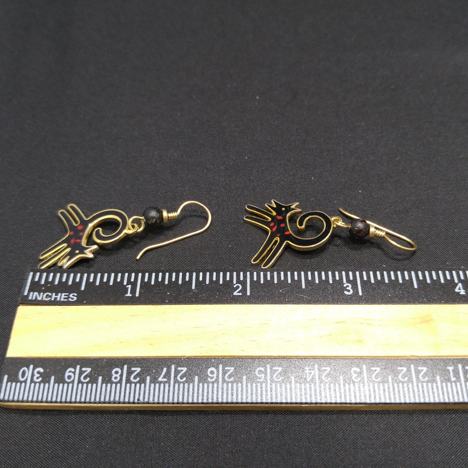 *Description: This is a great pair of black dog earrings by Laurel Burch from the 1980s. The black enamel dogs have a splash of red along the body and they appear to be running with their tail high and curved in the air. The enamel is outlined in gold plated cloisonne and backing. The bead is wooden and painted black. The ear wires are gold filled and each earrings is stamped Laurel Burch on the back. This would be a great addition to your vintage jewelry collection or make a great vintage gift!