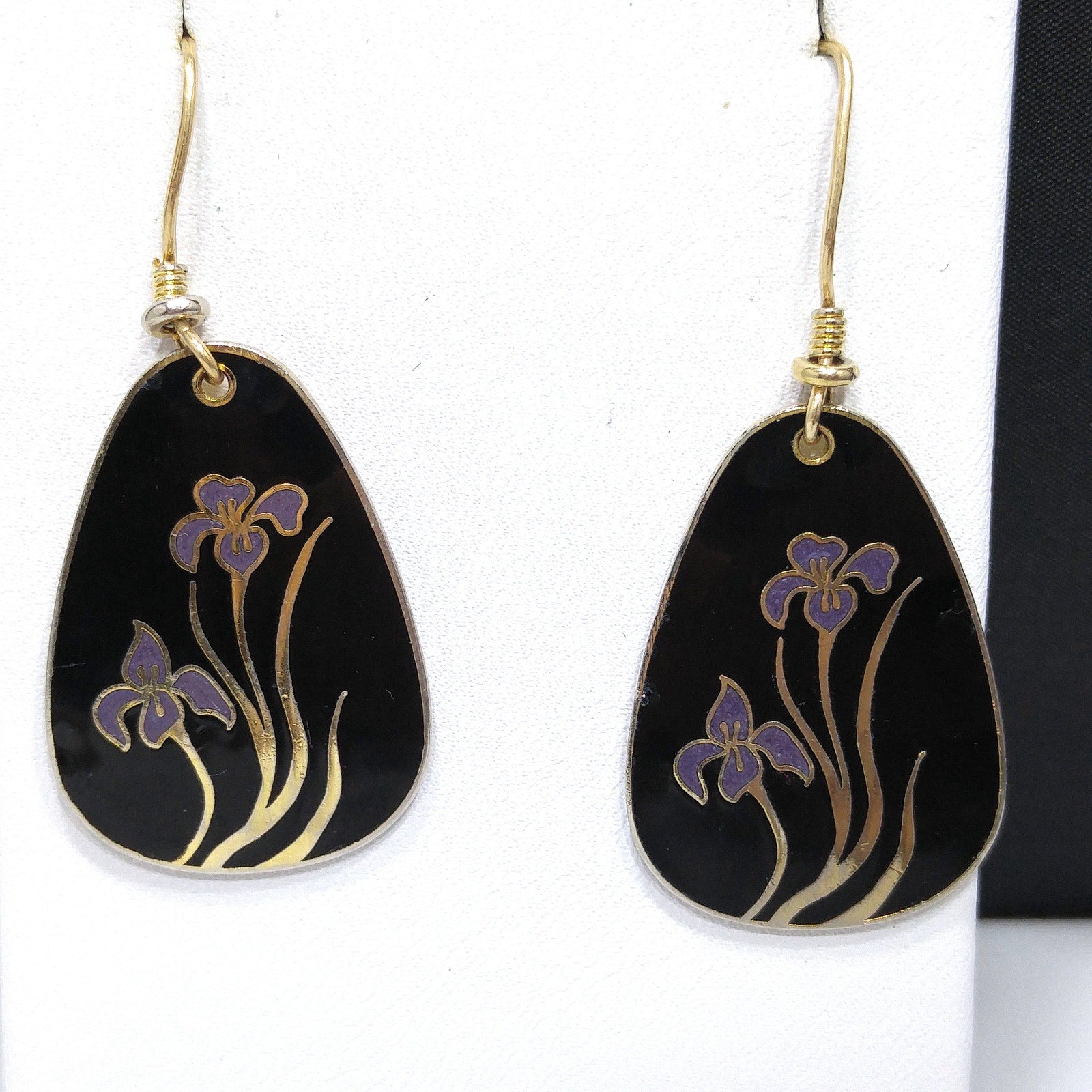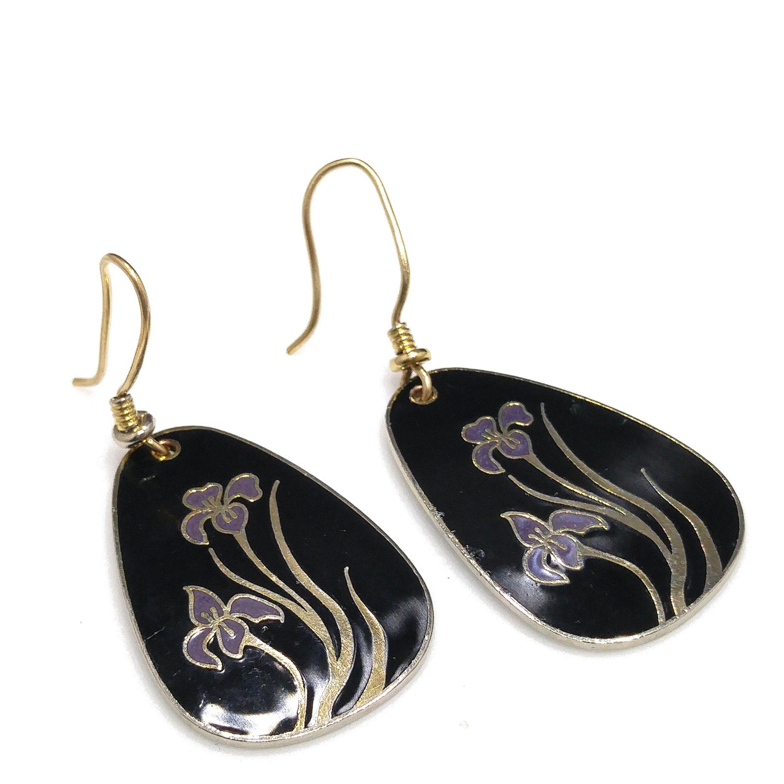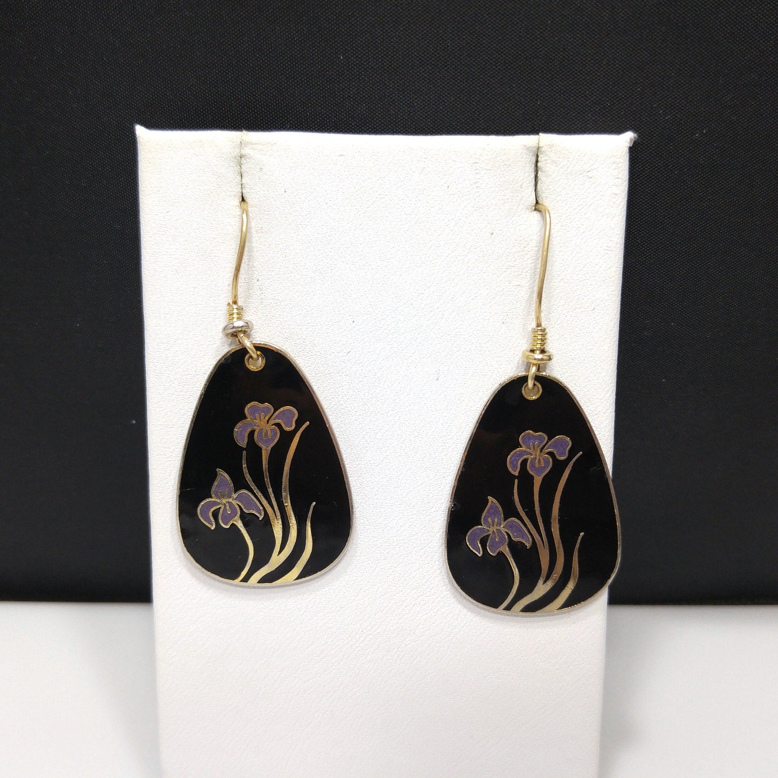 *Description: This is a beautiful pair of Laurel Burch purple lily cloisonne earrings with a black enamel background and gold plated outlines and backing from the 1980s. There are two lilies on each earring. The enamel has a few dings and dents but nothing is broken. Review close up photos for details prior to purchase. The outlines and backing is gold plated and stamped Laurel Burch on the back. This is one of her older designs where she just stamped her name on the back with no design name. Also some of the gold plating is worn around the edges on the backs. Ear wires are gold filled and have been slightly bent. This would be a great addition to your vintage jewelry collection or make a great vintage gift!