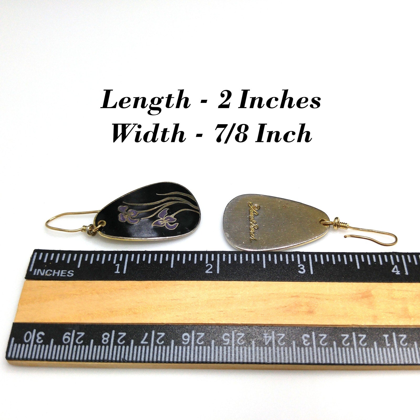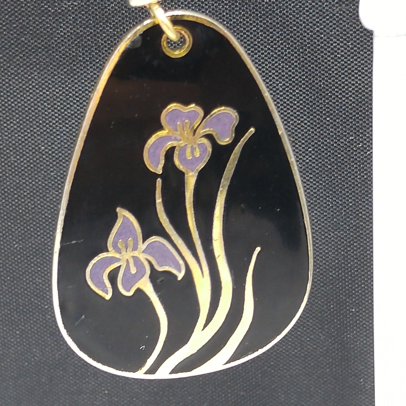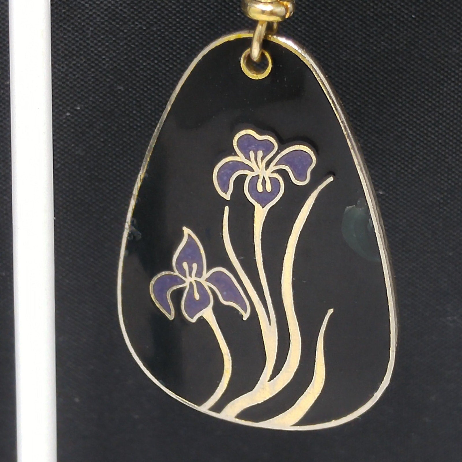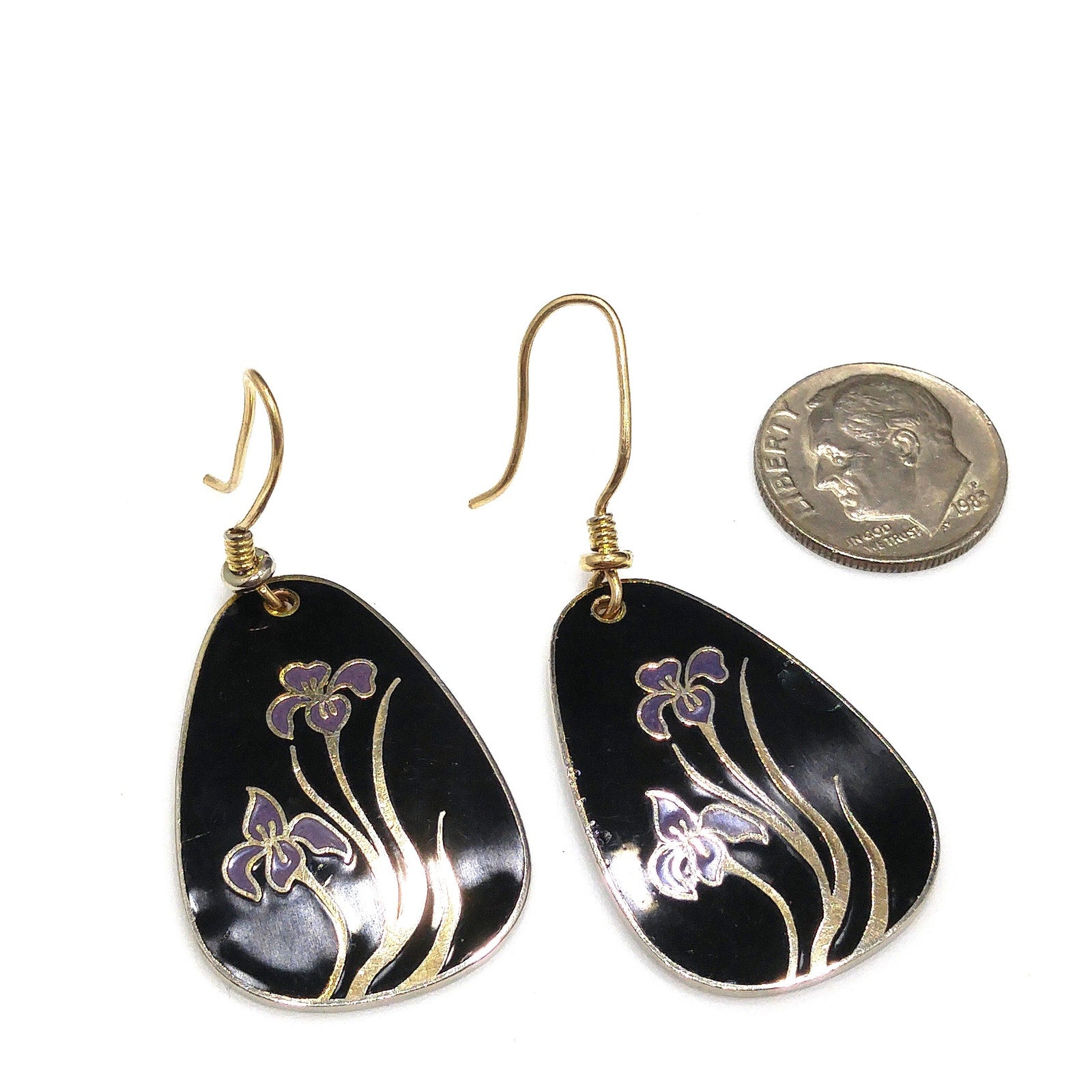 *Description: This is a beautiful pair of Laurel Burch purple lily cloisonne earrings with a black enamel background and gold plated outlines and backing from the 1980s. There are two lilies on each earring. The enamel has a few dings and dents but nothing is broken. Review close up photos for details prior to purchase. The outlines and backing is gold plated and stamped Laurel Burch on the back. This is one of her older designs where she just stamped her name on the back with no design name. Also some of the gold plating is worn around the edges on the backs. Ear wires are gold filled and have been slightly bent. This would be a great addition to your vintage jewelry collection or make a great vintage gift!