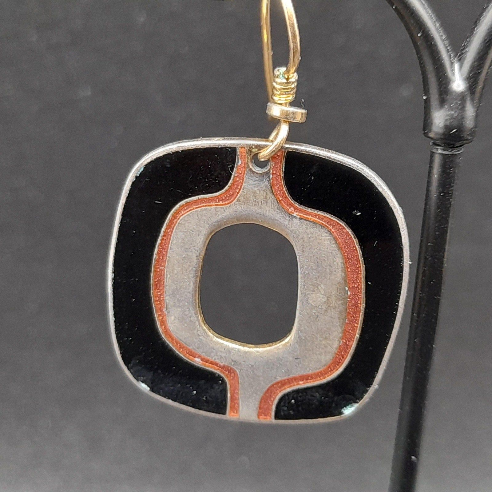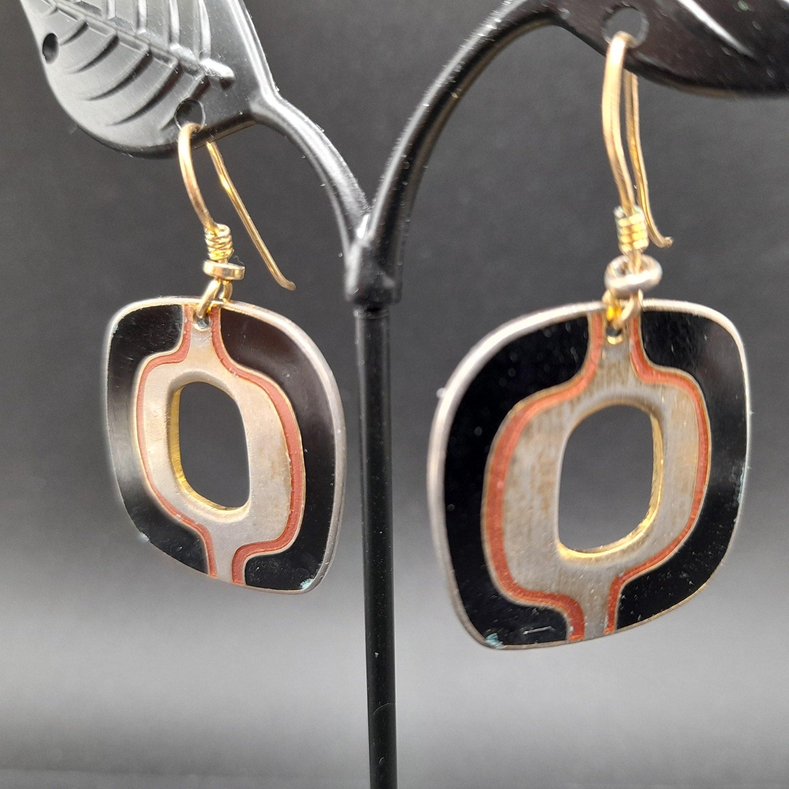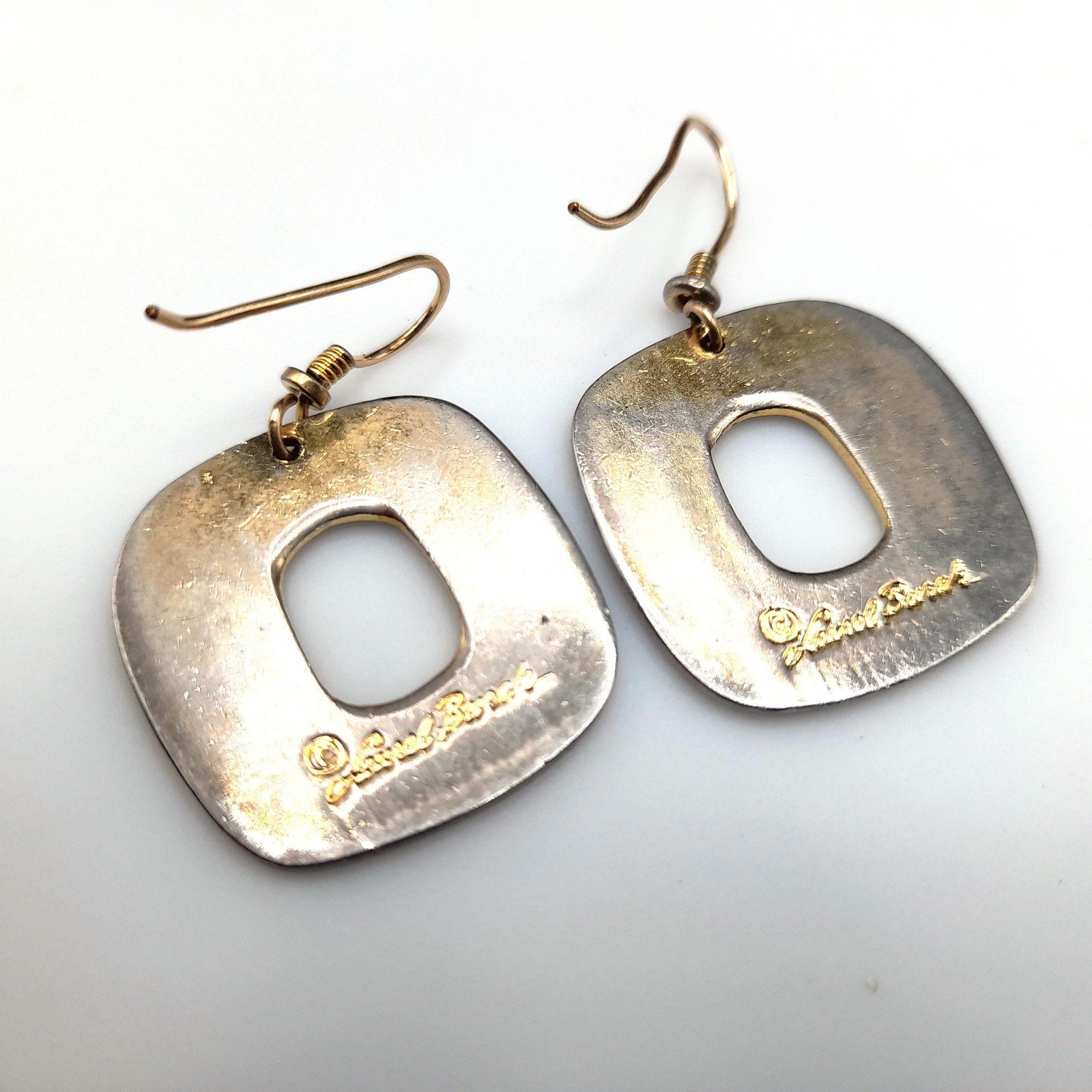 *Description: This is an early pair of Laurel Burch drop earrings with an open work design with black enamel outlined in metallic pink on a gold plated backing from the 1980s. The ear wires are gold filled and slightly misshapen. There is wear on the gold plating on the backs due to the age as this was one of the earlier designs. This would be a great addition to your vintage jewelry collection or make a great vintage gift!
