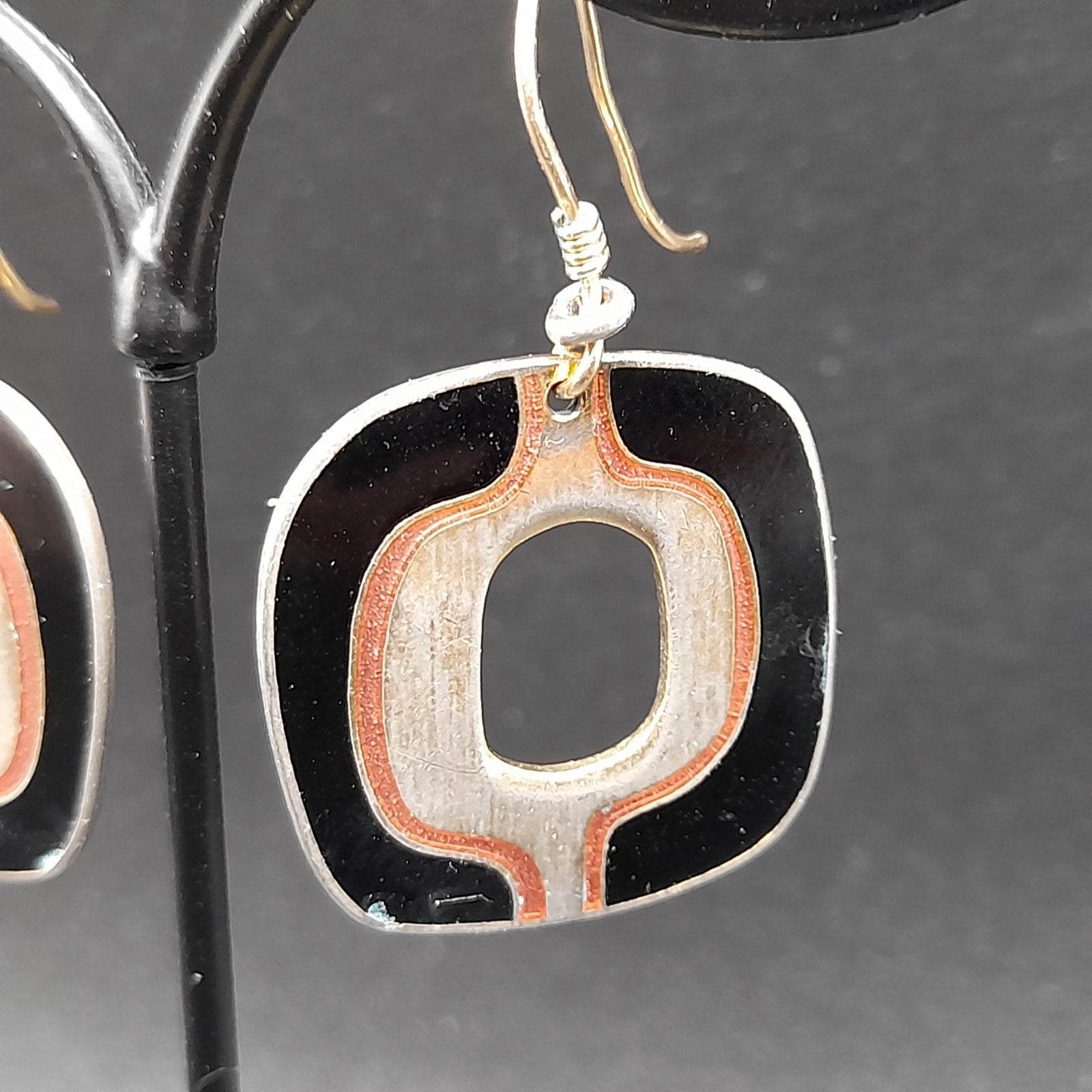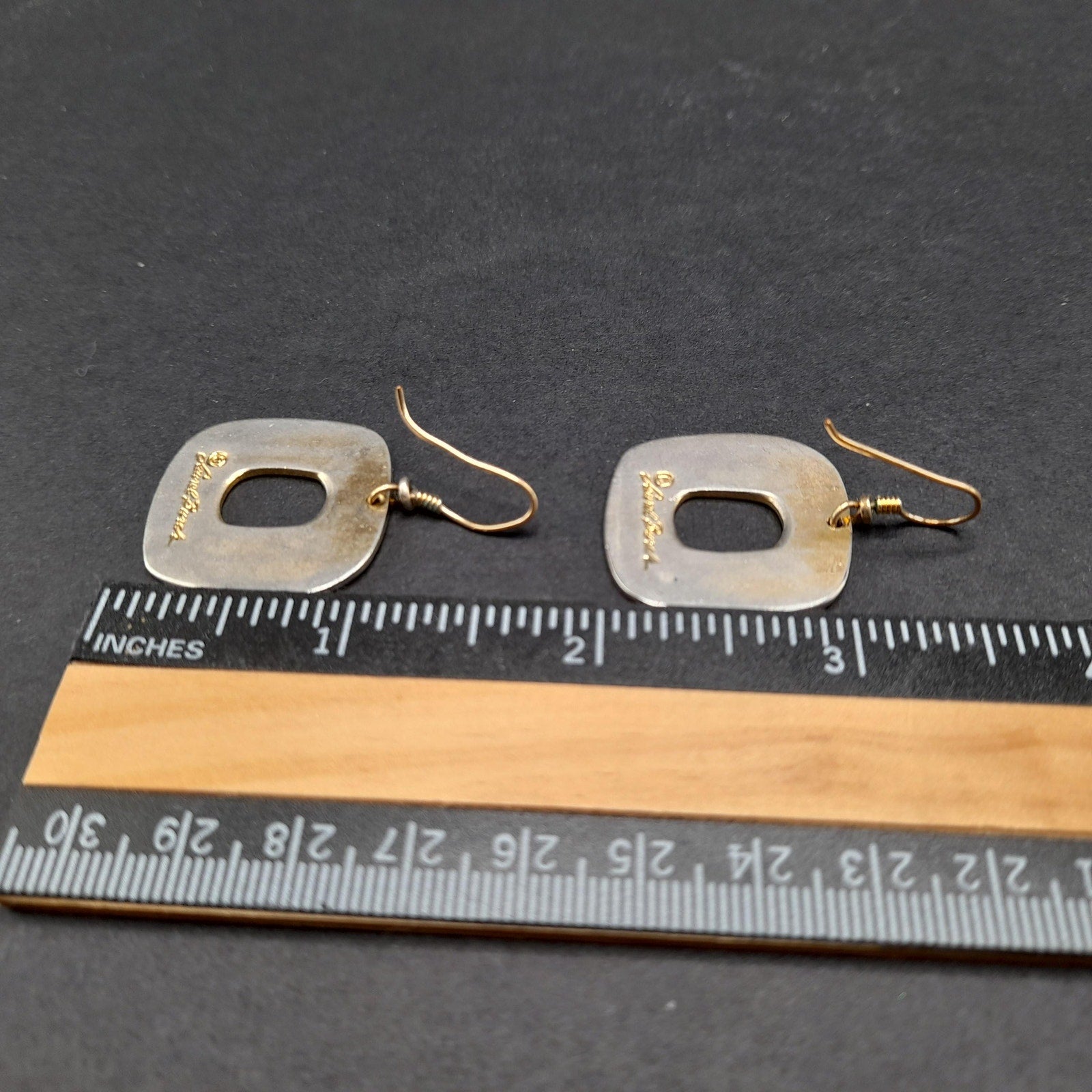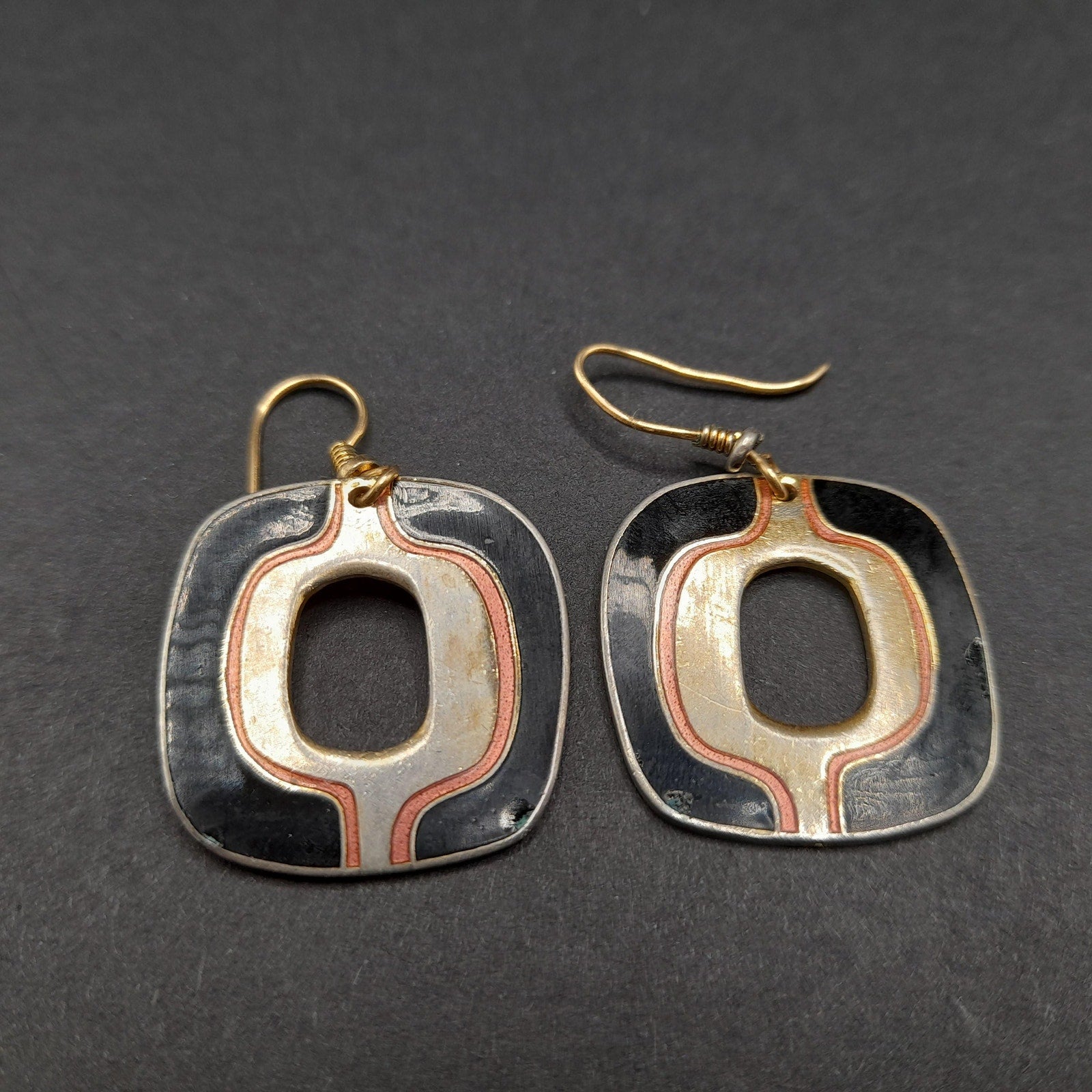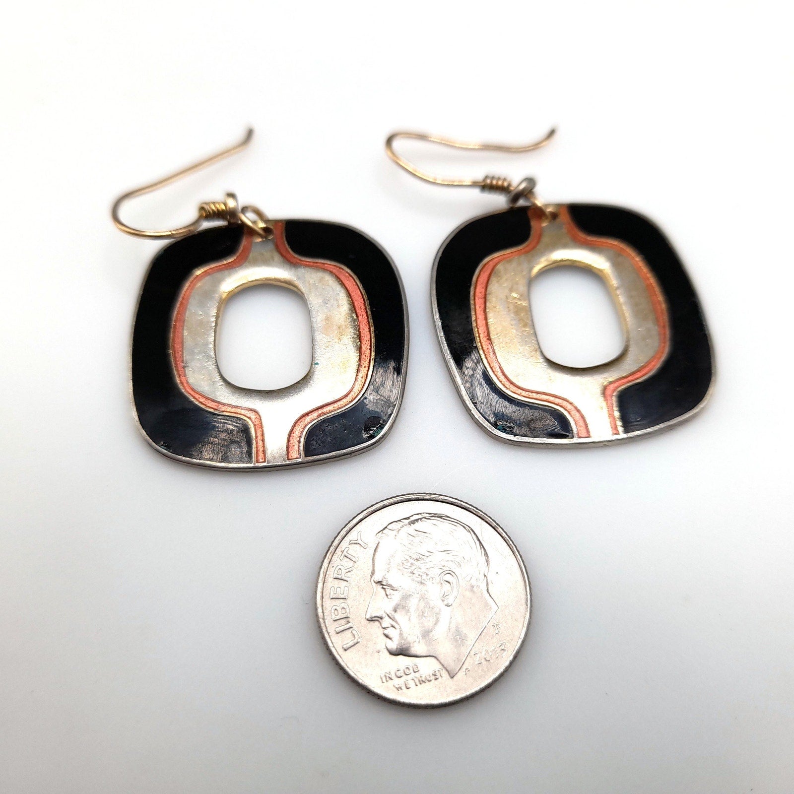 *Description: This is an early pair of Laurel Burch drop earrings with an open work design with black enamel outlined in metallic pink on a gold plated backing from the 1980s. The ear wires are gold filled and slightly misshapen. There is wear on the gold plating on the backs due to the age as this was one of the earlier designs. This would be a great addition to your vintage jewelry collection or make a great vintage gift!