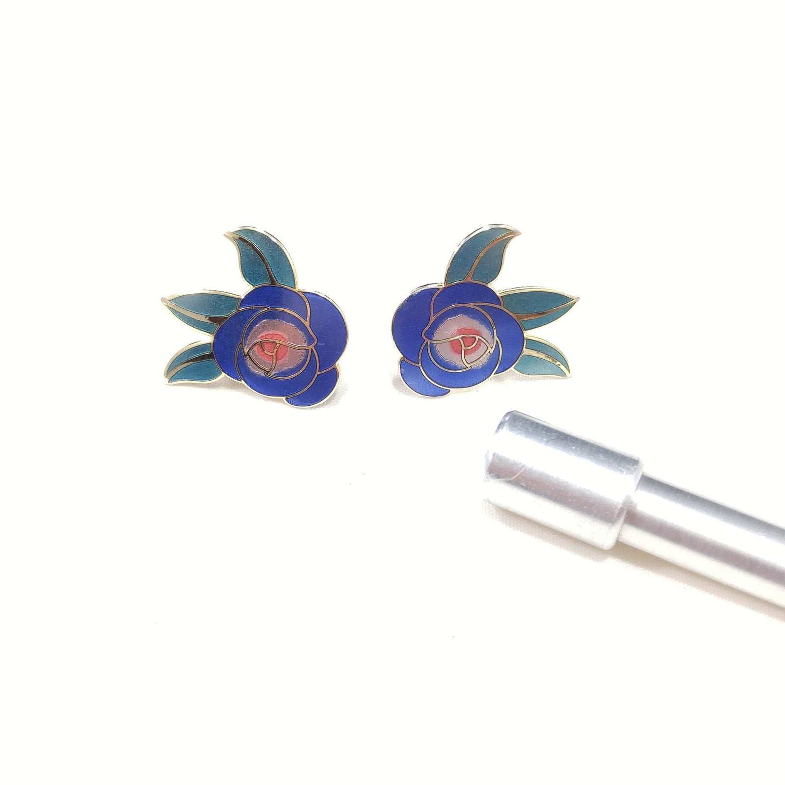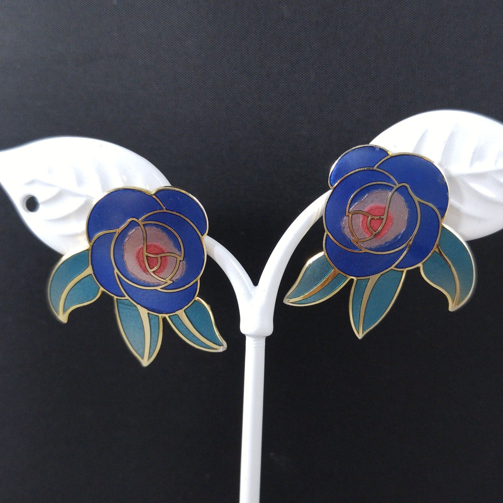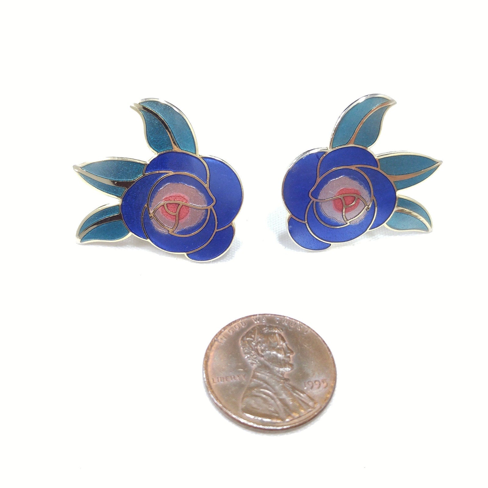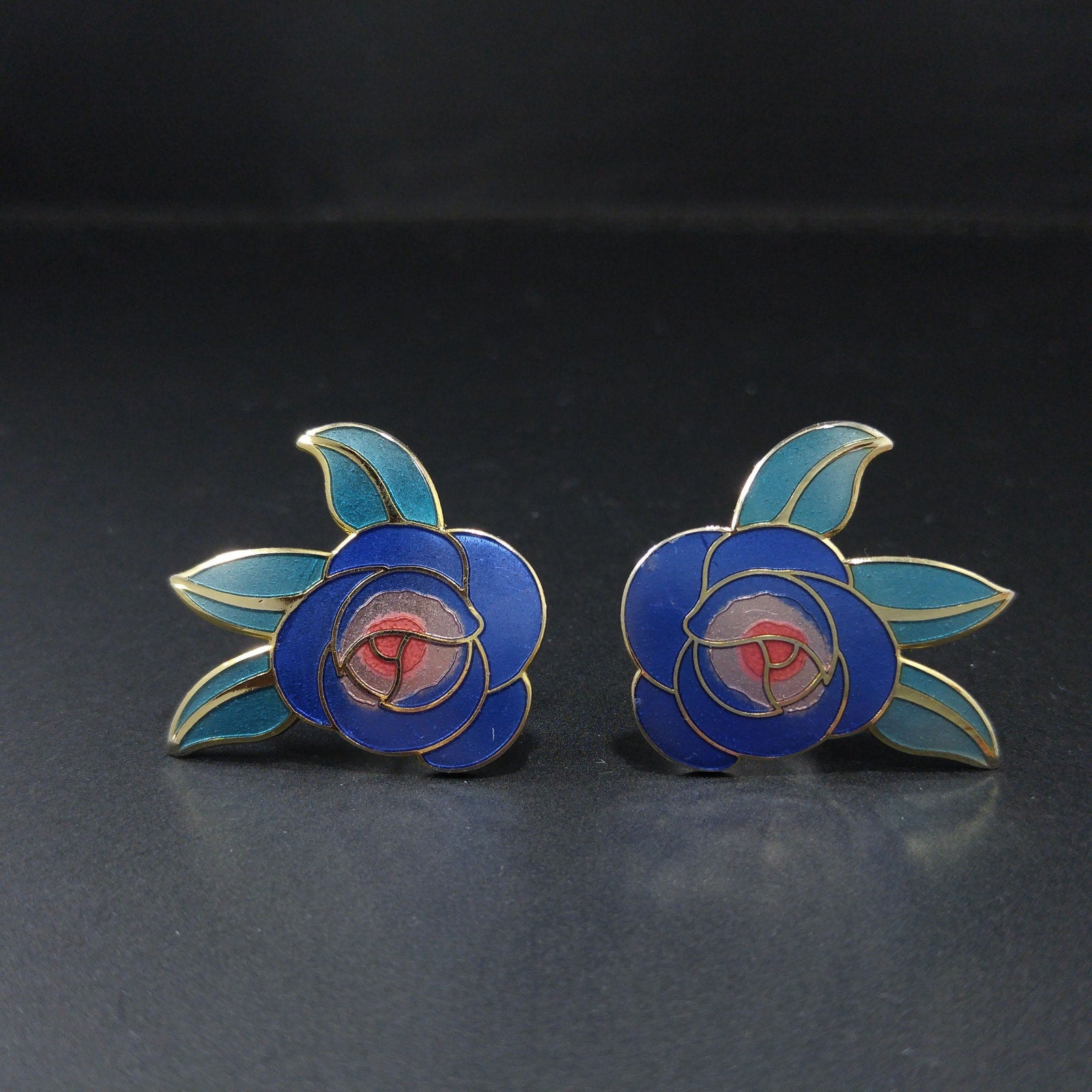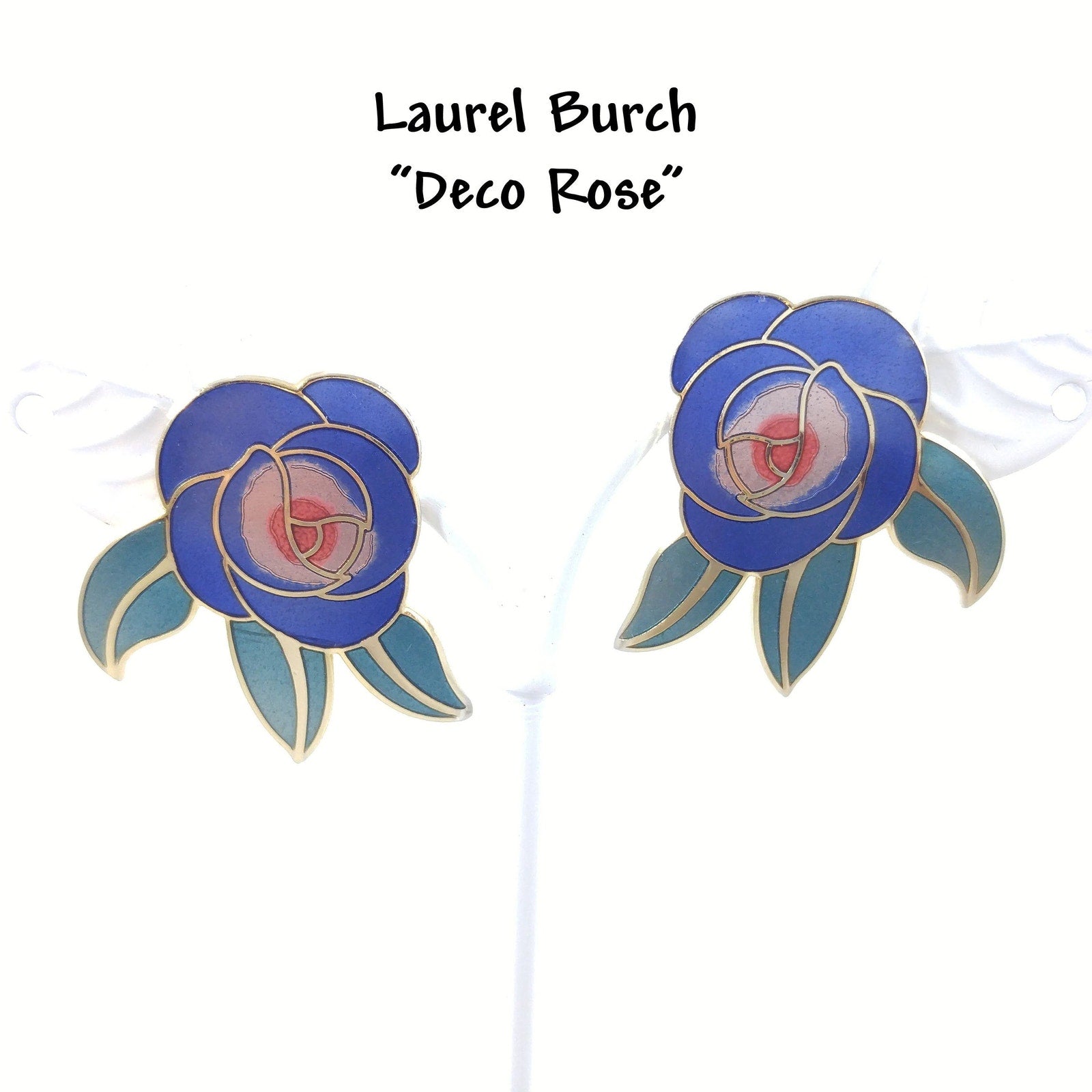 *Description: This is a beautiful pair of Laurel Burch floral earrings entitled "Deco Rose". They are gold cloisonne with different shades of pink, blue, and green enamel. These earrings have gold filled posts and are in the shape of a rose with three leaves. This is a beautiful pair of Laurel Burch floral earrings.