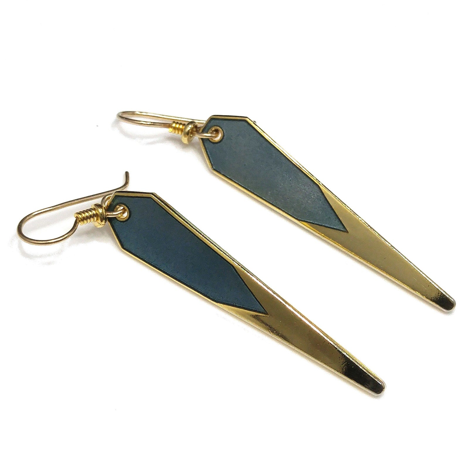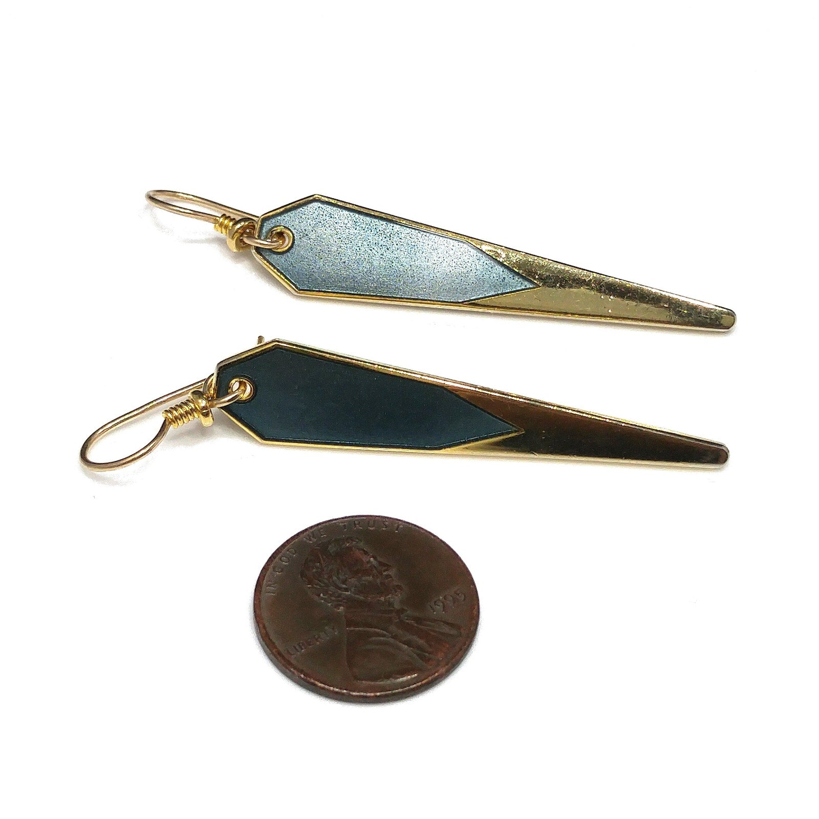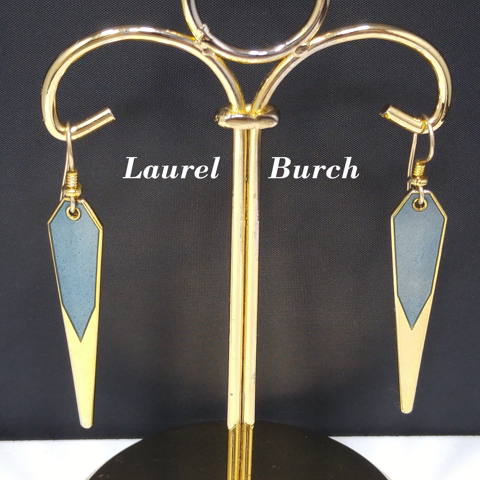 *Description - This is a great pair of long Laurel Burch metallic blue enamel and gold plated earrings in a modern style from the 1980s. The lower portion of the earrings are gold plated and very reflective. The upper portion is a metallic blue. The ear wires are gold filled and look great! This would be a great addition to your vintage jewelry collection or make a great vintage gift!