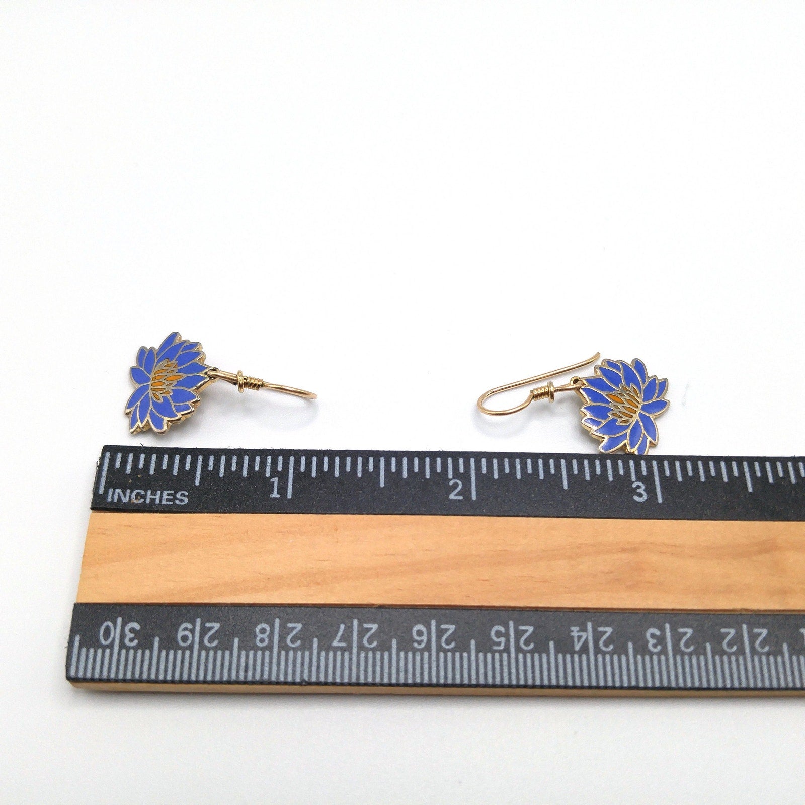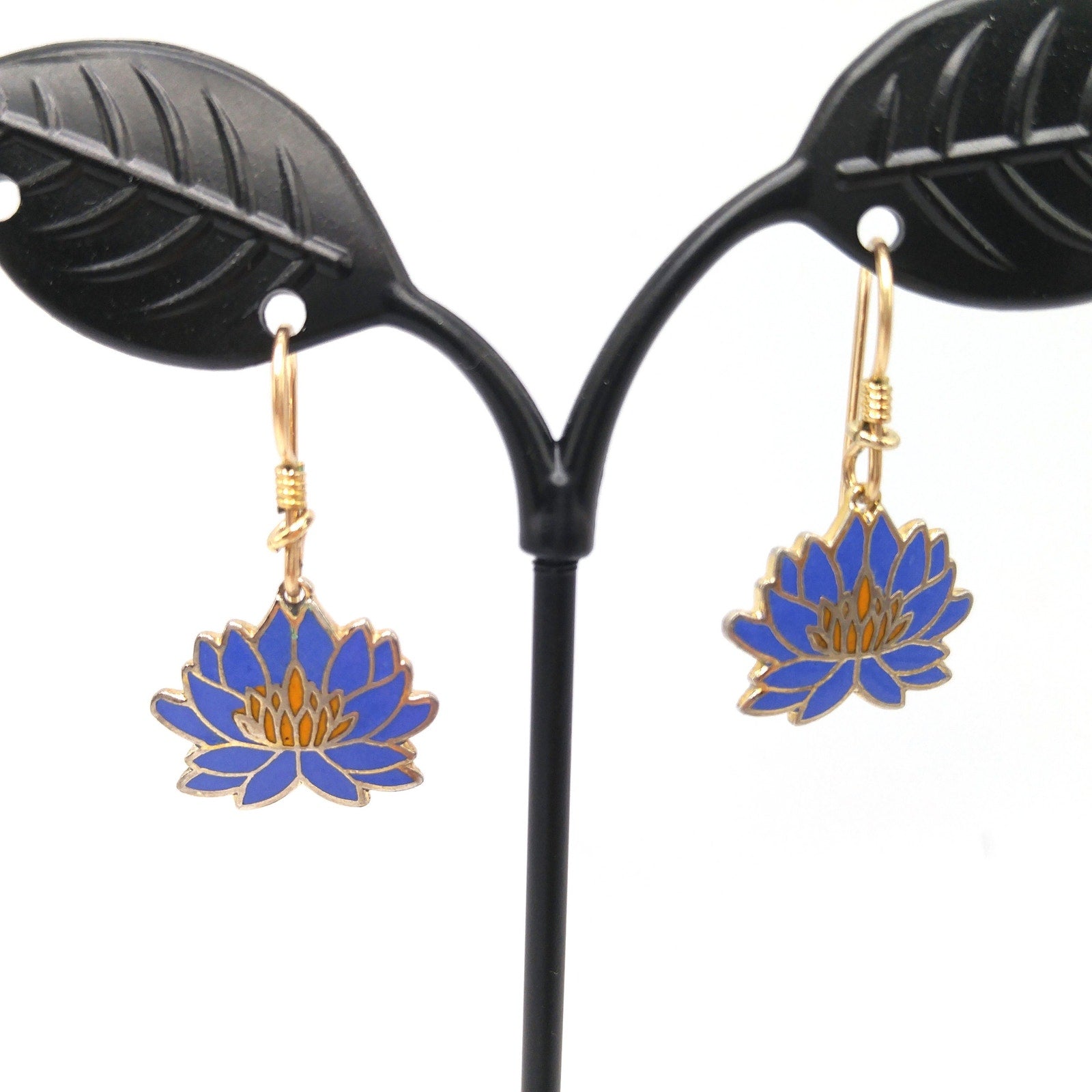 Vintage Laurel Burch Blue Orange Lily Earrings, Enamel Cloisonne, Gold Plated
