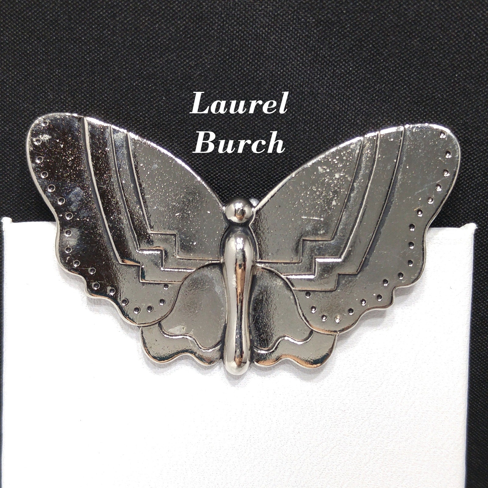 This is a beautiful vintage Laurel Burch butterfly brooch from the 1980s. The brooch is rhodium plated with black enamel accents in the creases and lines, giving the wings a bold and elegant look. It is stamped Laurel Burch on the back near the wing edge.