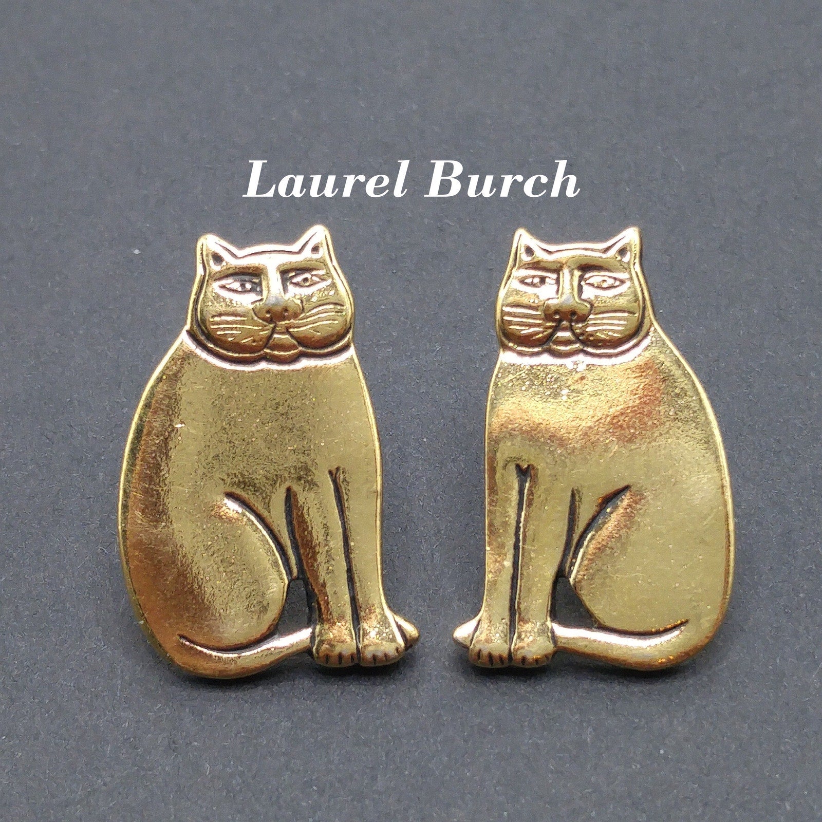 *Description: This is a great pair of Laurel Burch cat earrings which are gold plated cats with gold filled posts from the 1980s. Each cat is sitting and facing the other. There is black enamel in the crevices of the design, giving it an outline in appearance. This is one of the earlier designs and very popular for cat lovers and animal lovers alike. This would be a great addition to your vintage jewelry collection or make a great vintage gift!