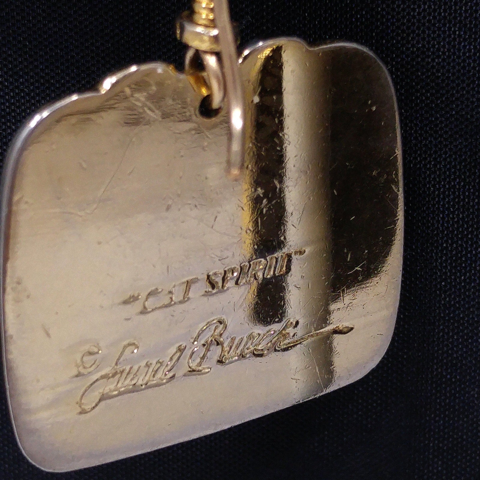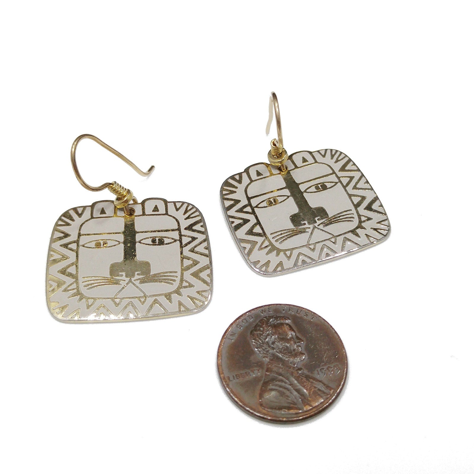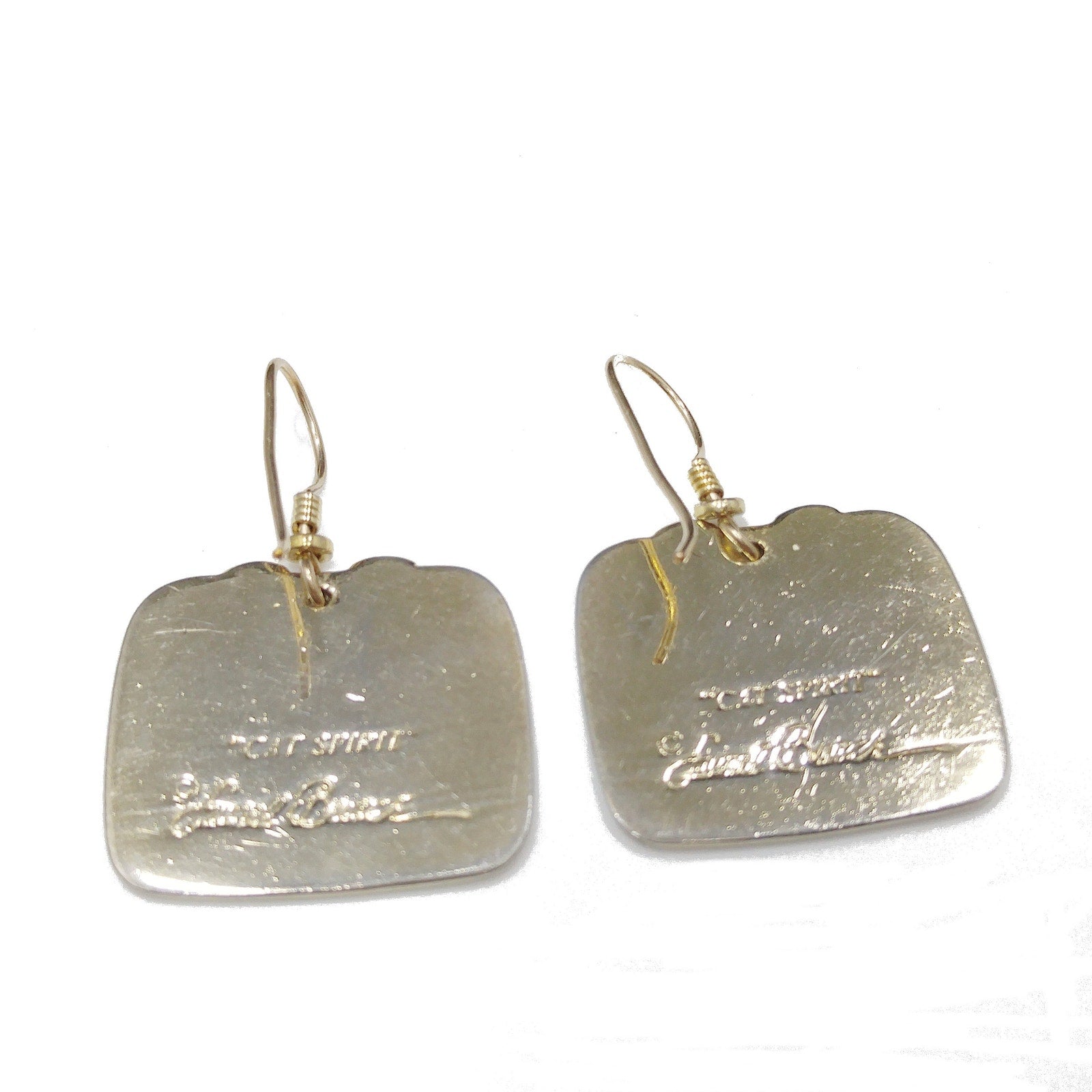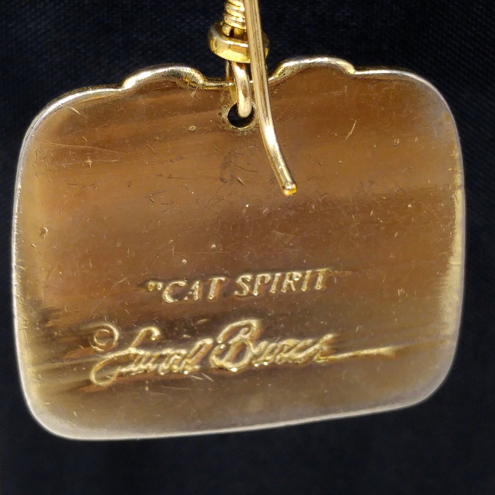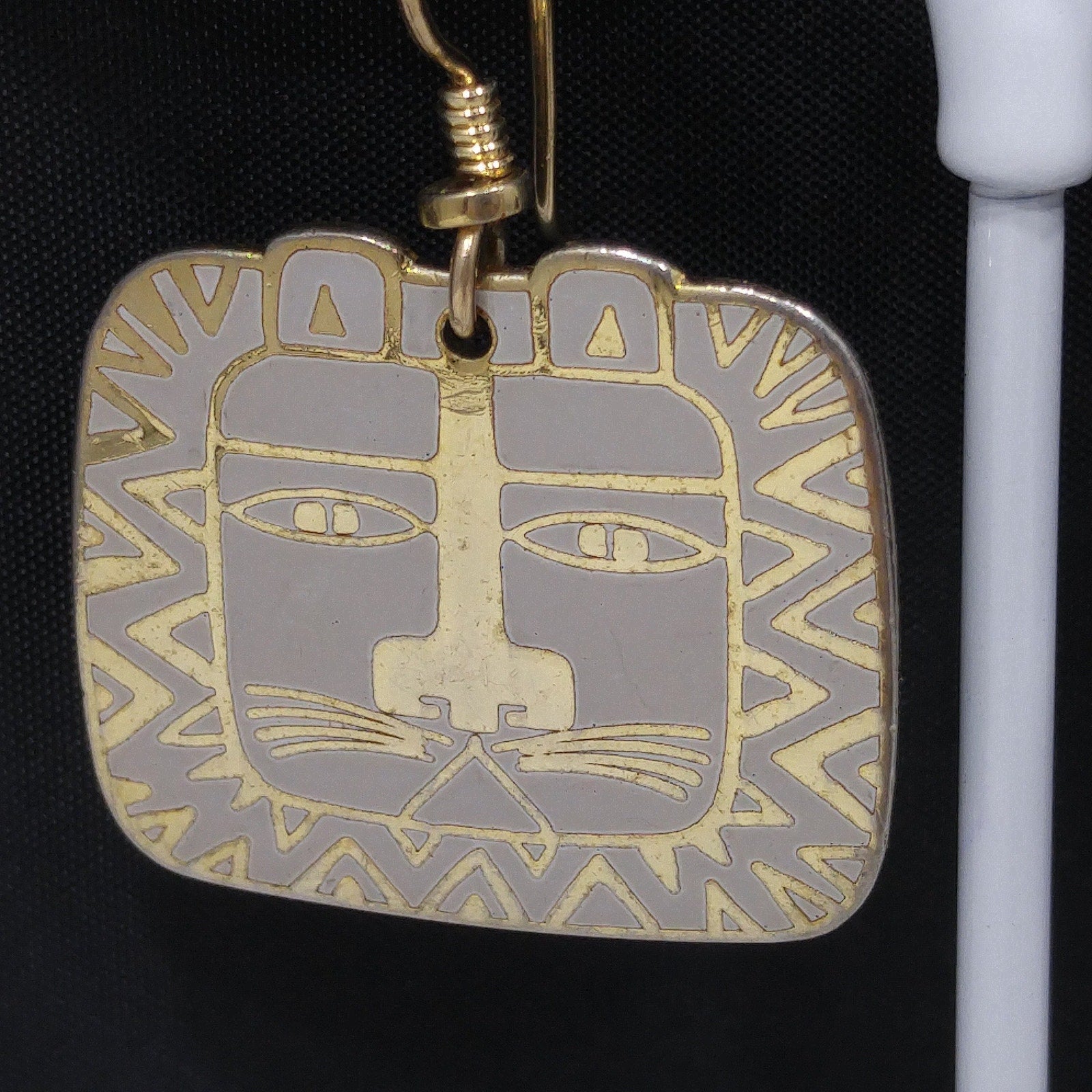 *Description: This is a unique pair of Laurel Burch earrings entitled "Cat Spirit" from the 1980s. The cats are creamy white with cloisonné gold plating outlining each feature of these two geometric cats. The ear wires are gold filled and both earrings are stamped Laurel Burch and "Cat Spirit".