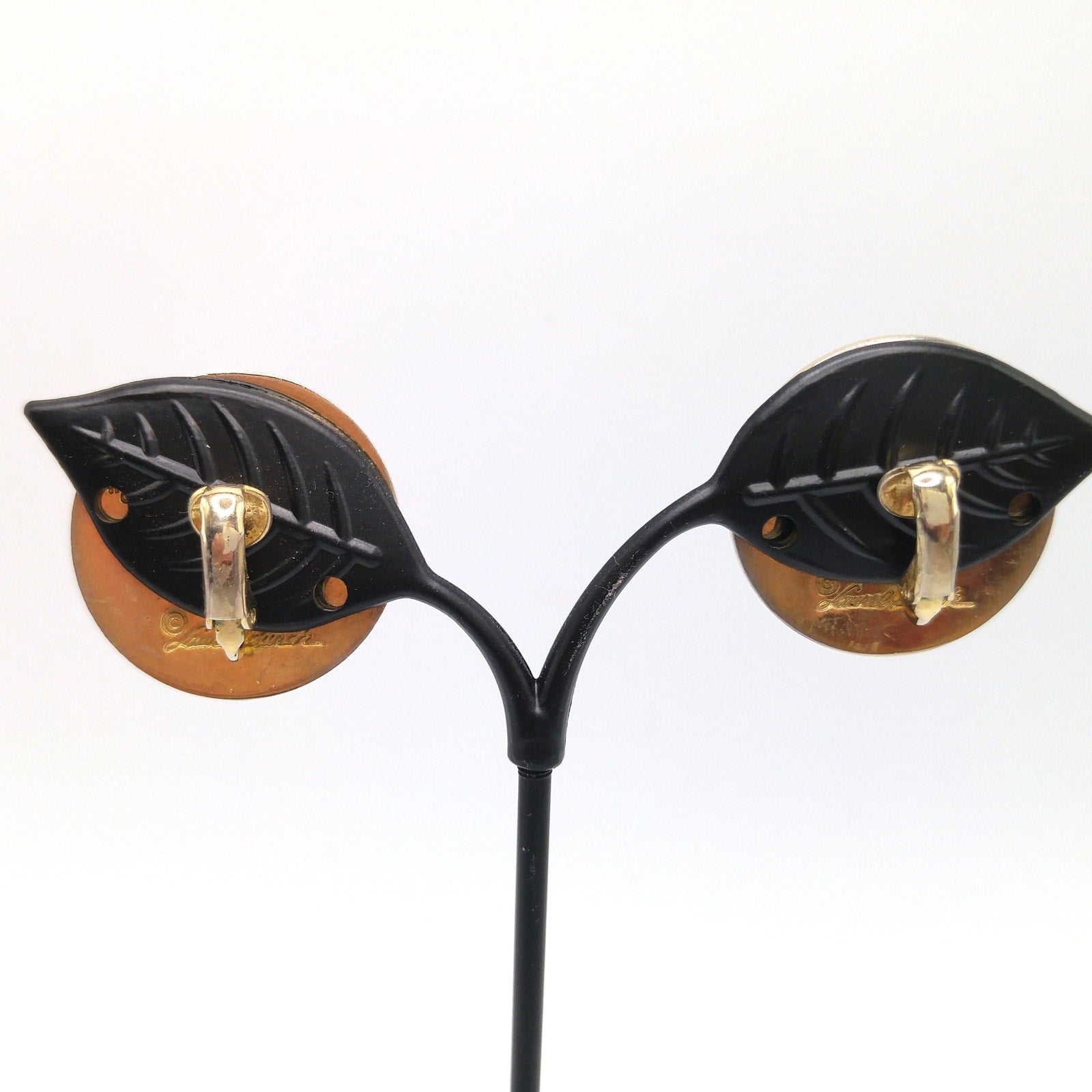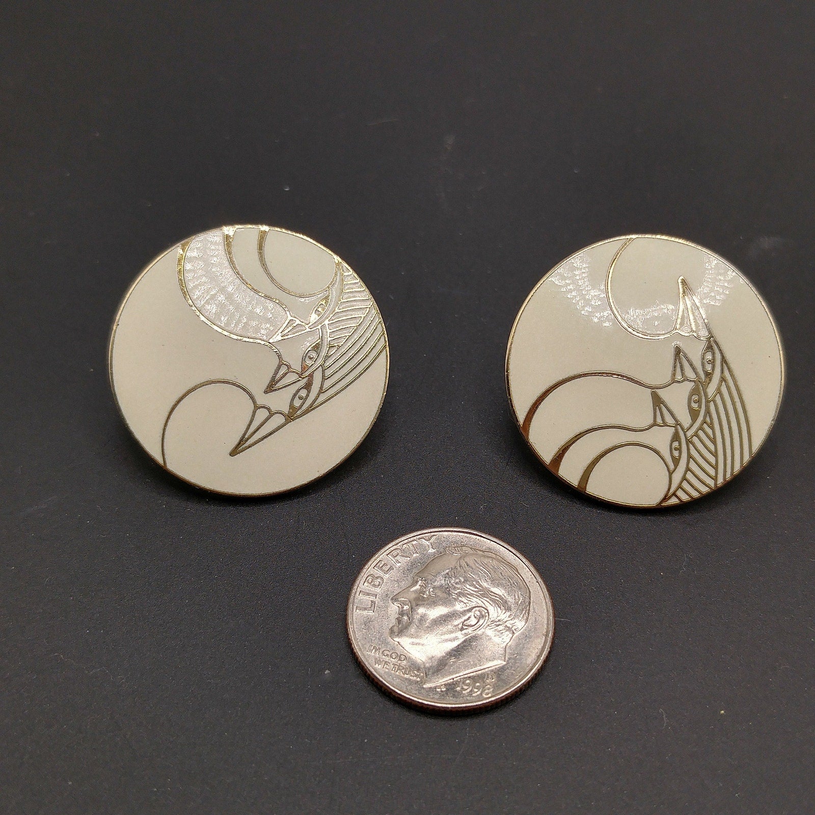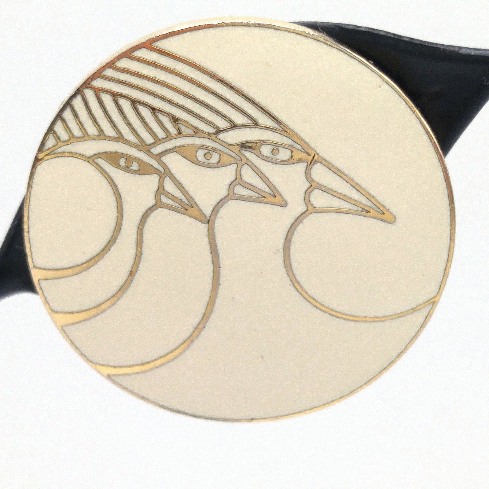 *Description: This is a great vintage Laurel Burch pair of cream and gold clip on earrings from the 1980s. This design is called "Celestial Birds" and it is three bird profiles outlined in gold. Each earring is signed by the artist and also has the design name listed on the backs. The earrings are gold plated. This would be a great addition to your vintage jewelry collection or make a great vintage gift!