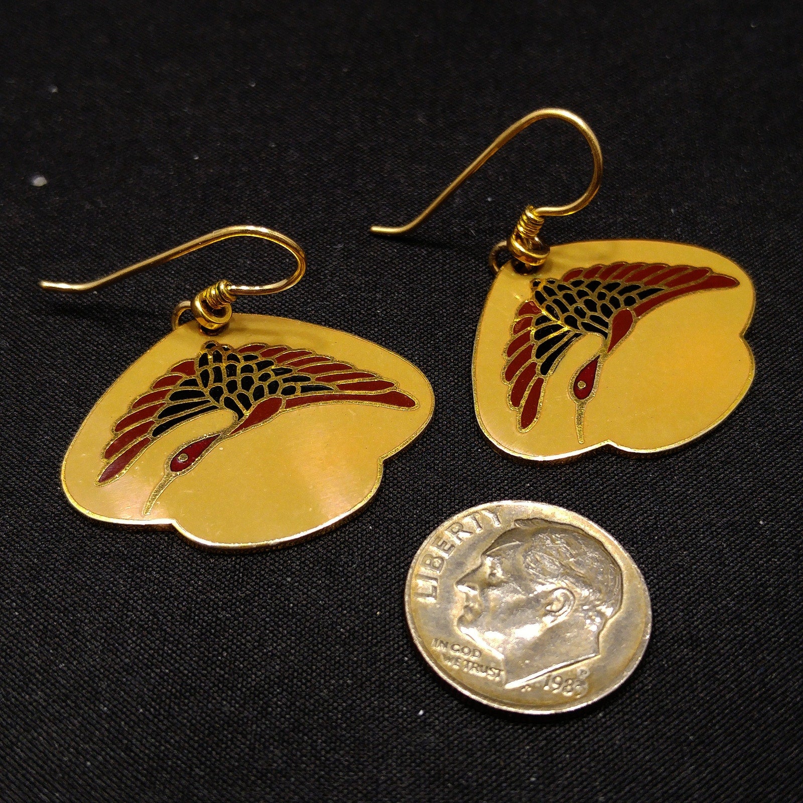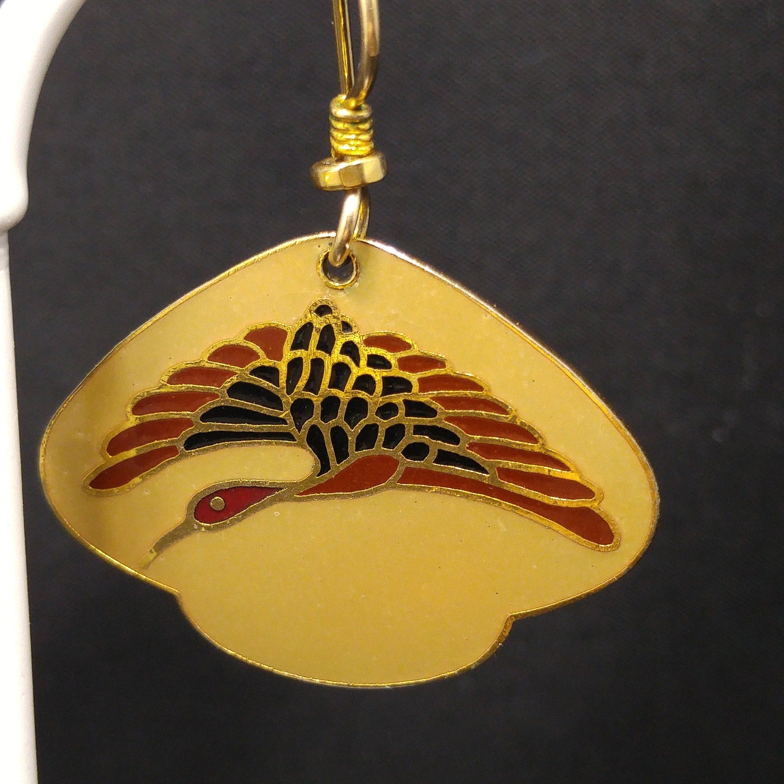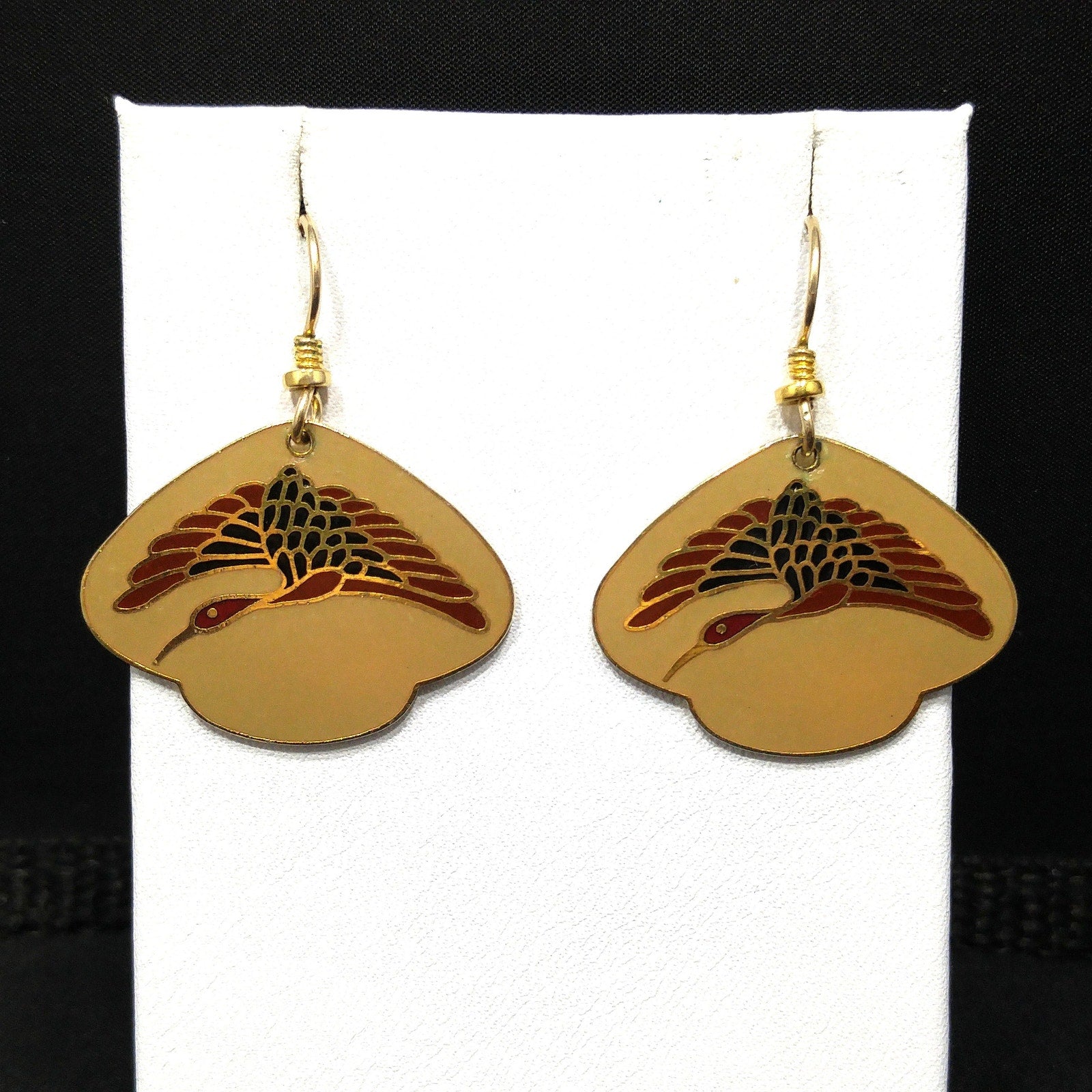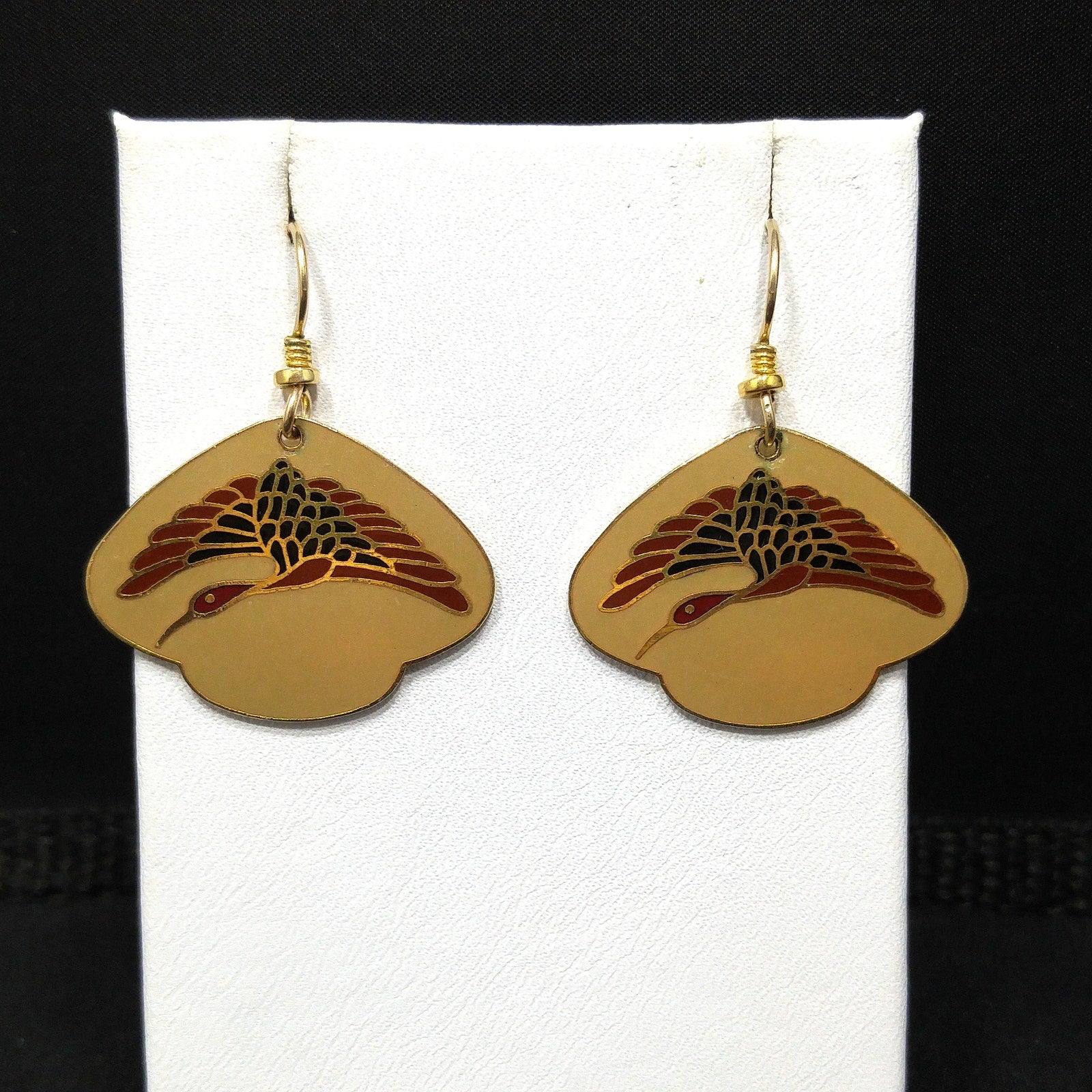 *Description: This is a beautiful pair of Laurel Burch flying crane bird earrings of cloisonne gold plate and enamel colors in beige tan, black and dark red from the 1980s. This is a very popular design by Laurel Burch. This would be a great addition to your vintage jewelry collection or make a great vintage gift!