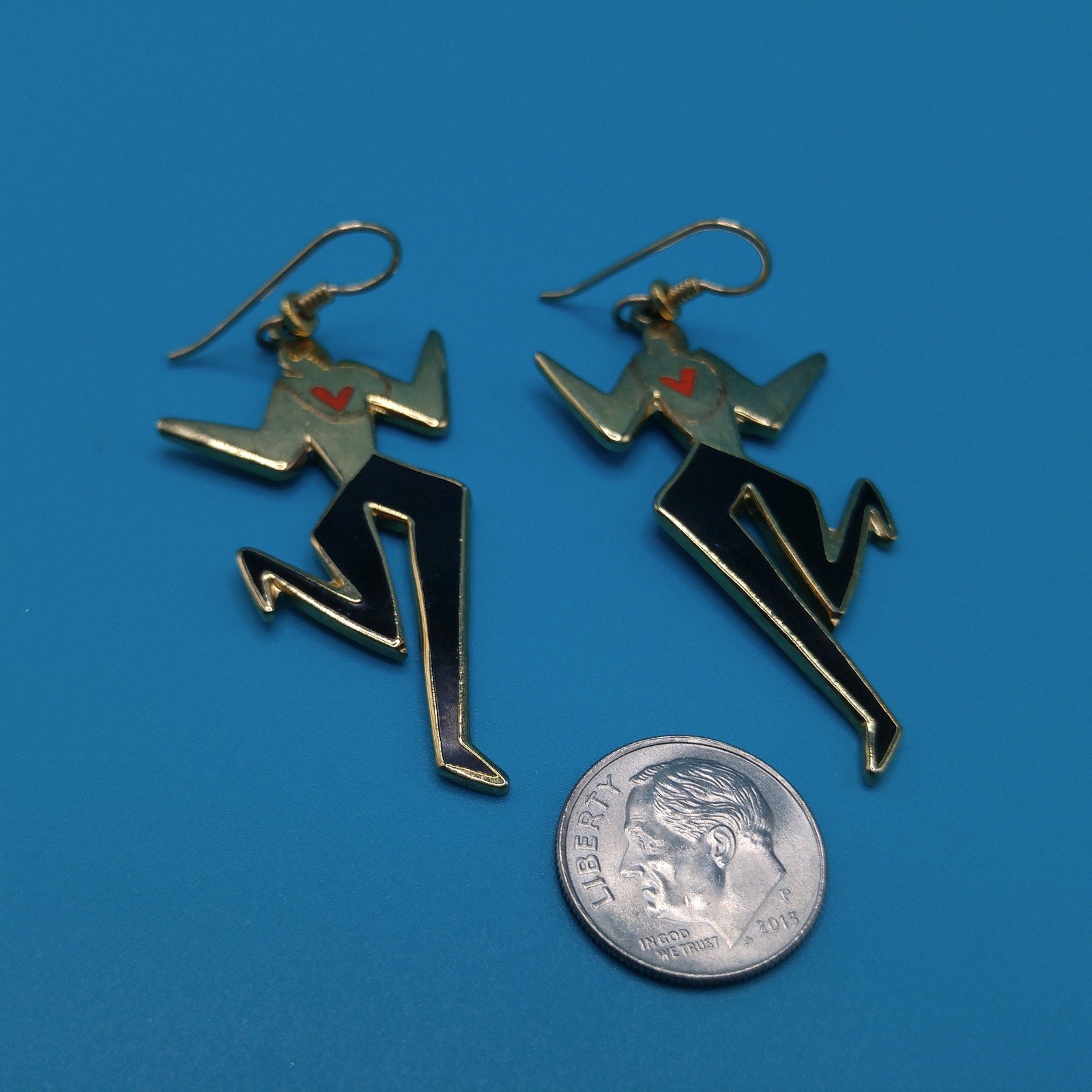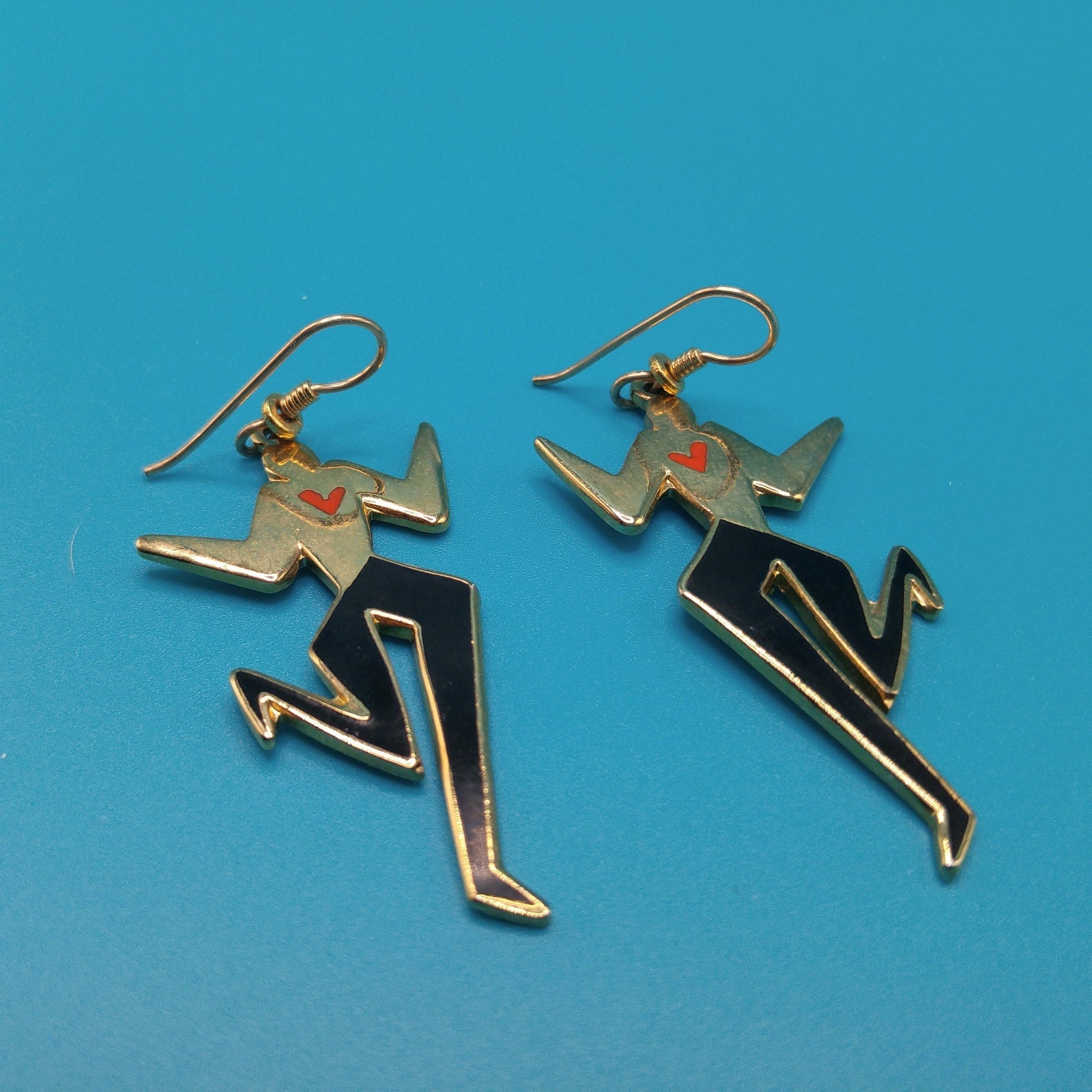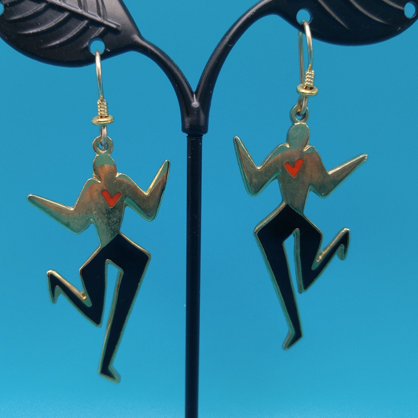 *Description: This is a great and rare pair of Laurel Burch "Dancing Spirit" drop earrings made in the 1980s. Each earring is a dancer with their feet moving and a red heart signifying that they love to dance. The cloisonne enamel technique is used on a gold plated backing with enamel in black and red. The black are the dancers' pants and the red is the heart. This would be a perfect gift for someone who loves dance or any type of movement. This would be a great addition to your vintage jewelry collection or make a great vintage gift!