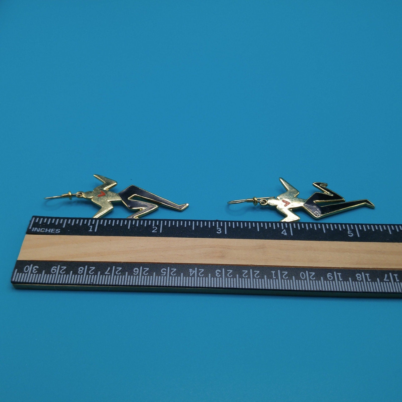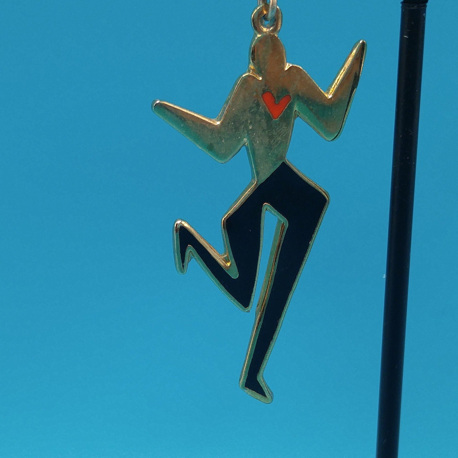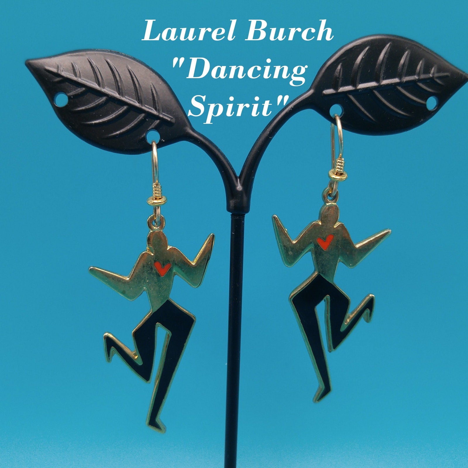 *Description: This is a great and rare pair of Laurel Burch "Dancing Spirit" drop earrings made in the 1980s. Each earring is a dancer with their feet moving and a red heart signifying that they love to dance. The cloisonne enamel technique is used on a gold plated backing with enamel in black and red. The black are the dancers' pants and the red is the heart. This would be a perfect gift for someone who loves dance or any type of movement. This would be a great addition to your vintage jewelry collection or make a great vintage gift!