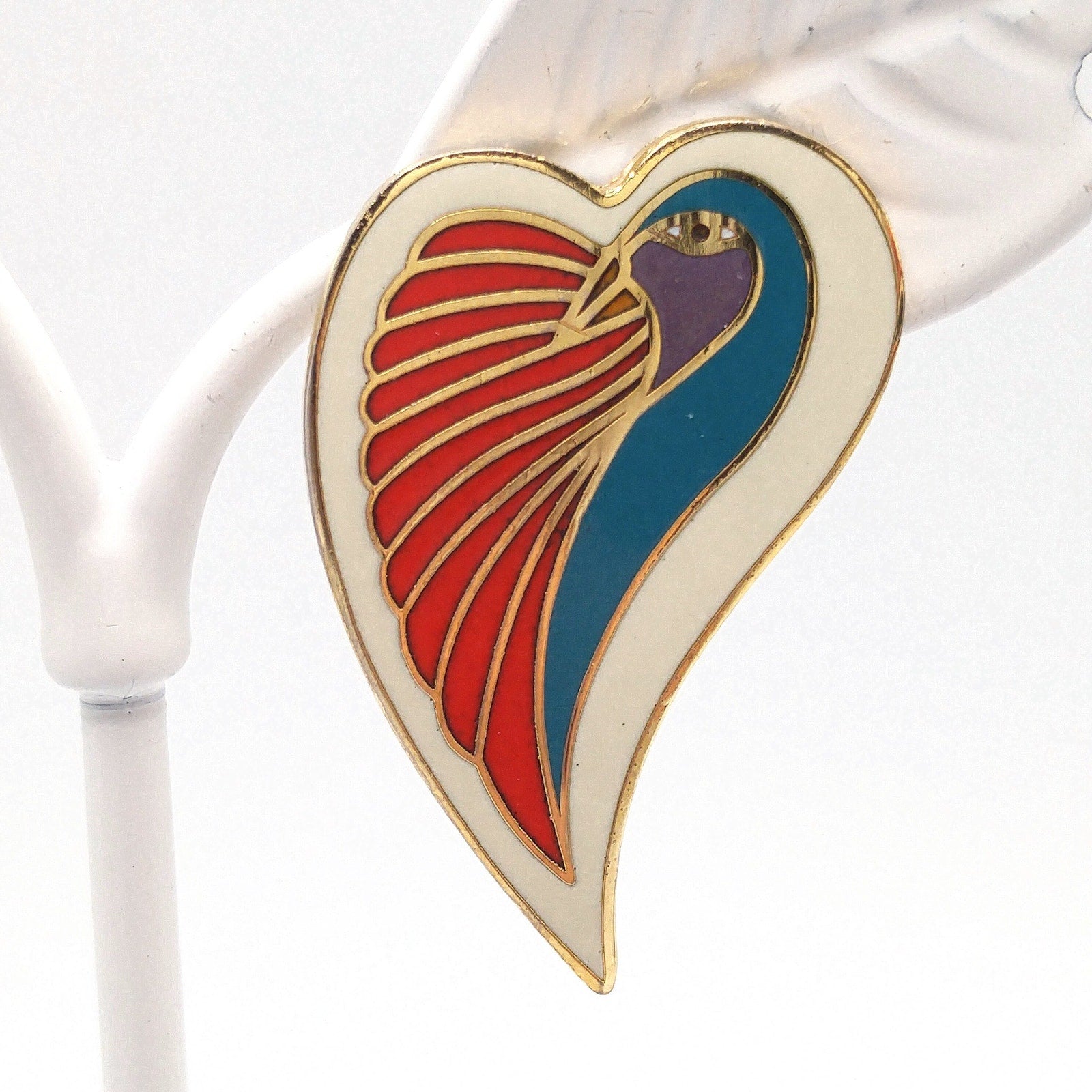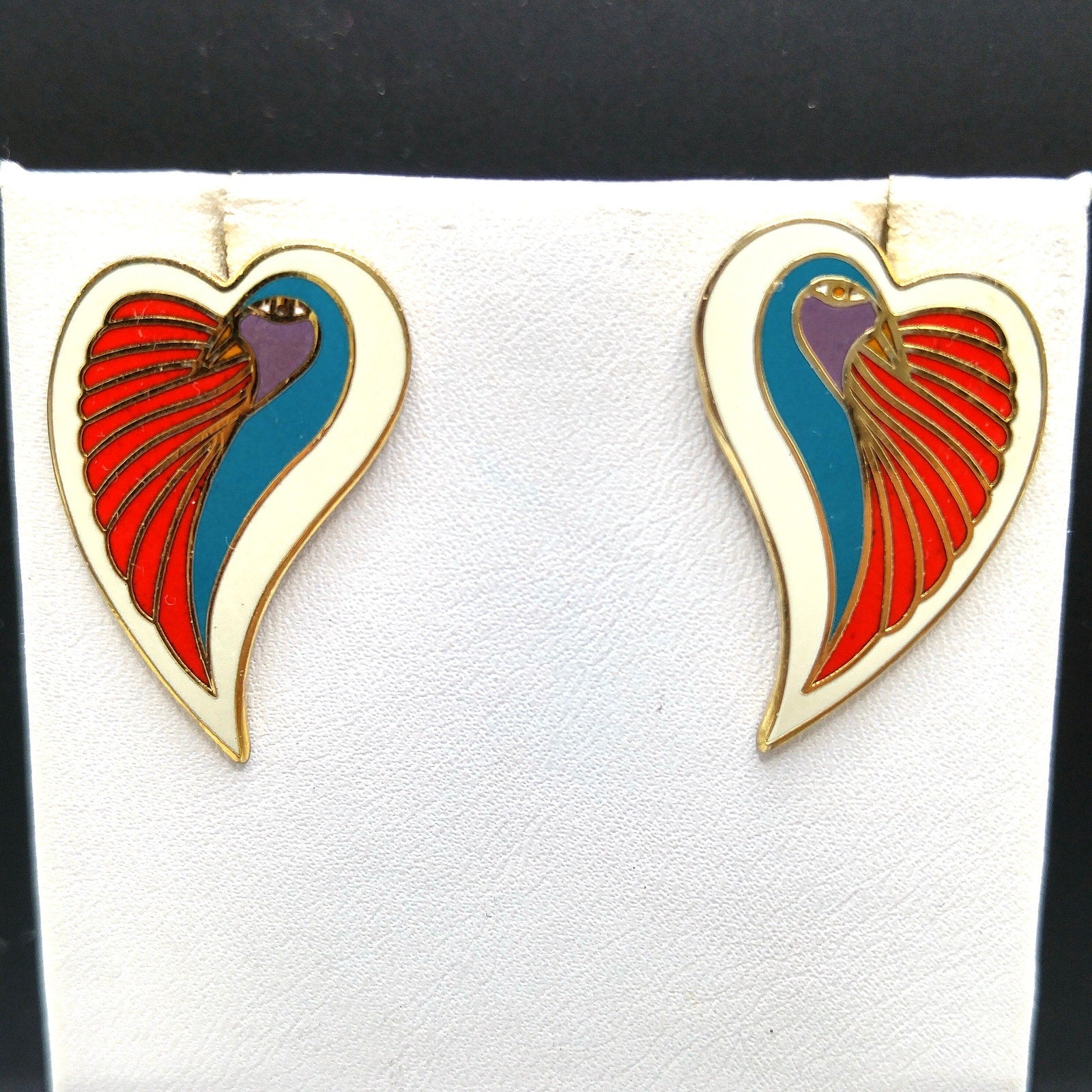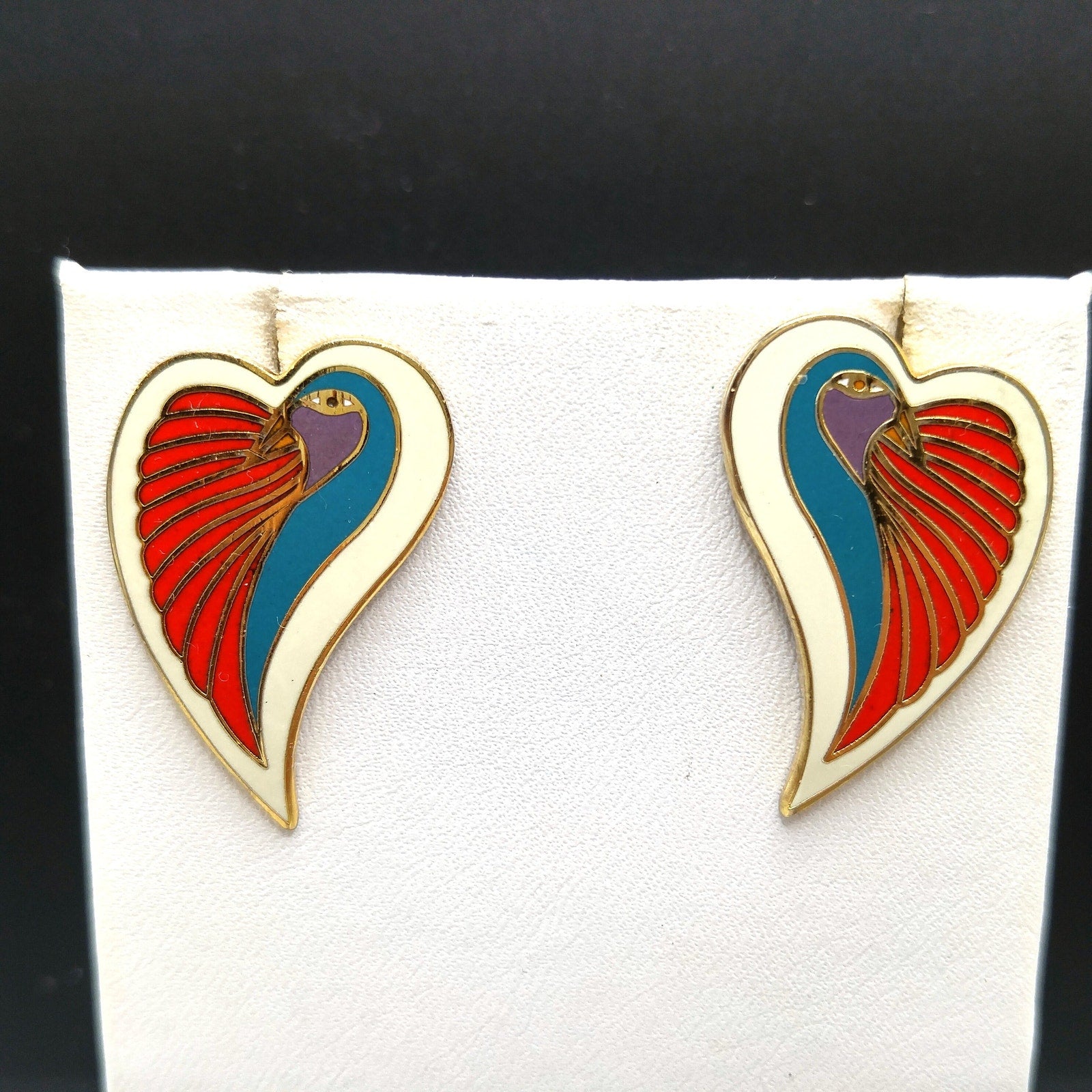 Vintage Laurel Burch "Dove Heart" Post Earrings, Cloisonne Enamel, Gold Plated